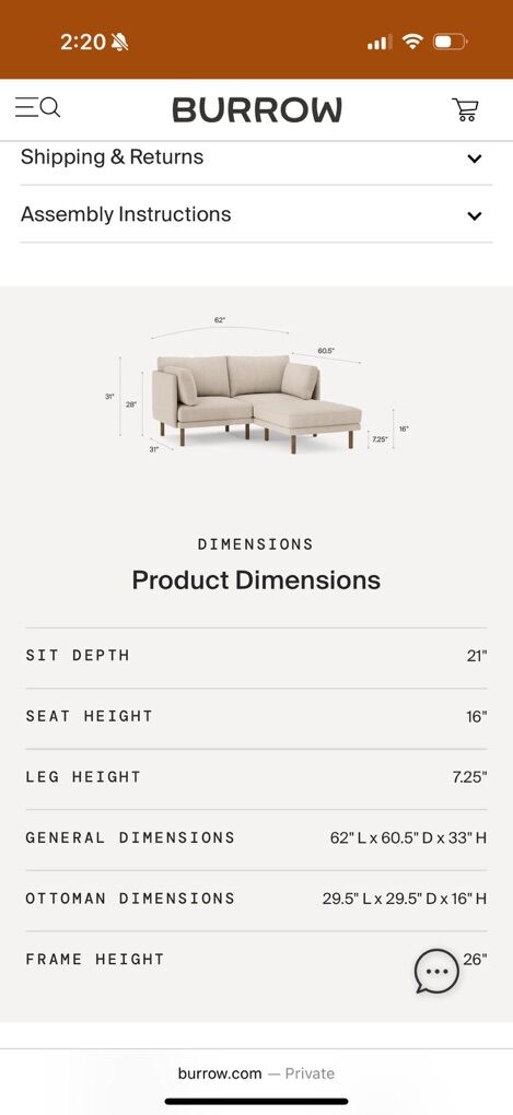High quality, supportive sectional. General dimensions: 62 L x 60.5' D x 33 H- on the small side, perfect for older homes with small living areas, apartments, college living. Fabric is carbon grey performance flat twill as shown in photos, legs are white oak, purchased in 2022. Fabric shows signs of use, slight pilling. No stains or tears, washed regularly. Legs have small scuffs. All cushions and pillows have zipper to machine wash outer grey fabric shell, very convenient. PFAS free. Universal configuration, can make chaise left or right orientation, easy to switch. Used in smoke-free, pet-friendly home. Currently retails new for $1,400.