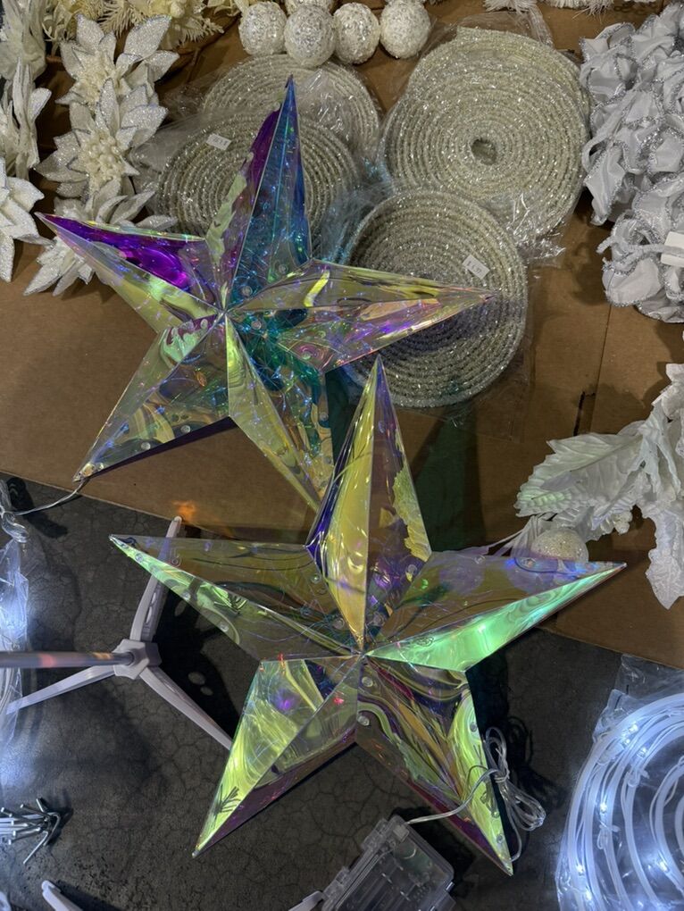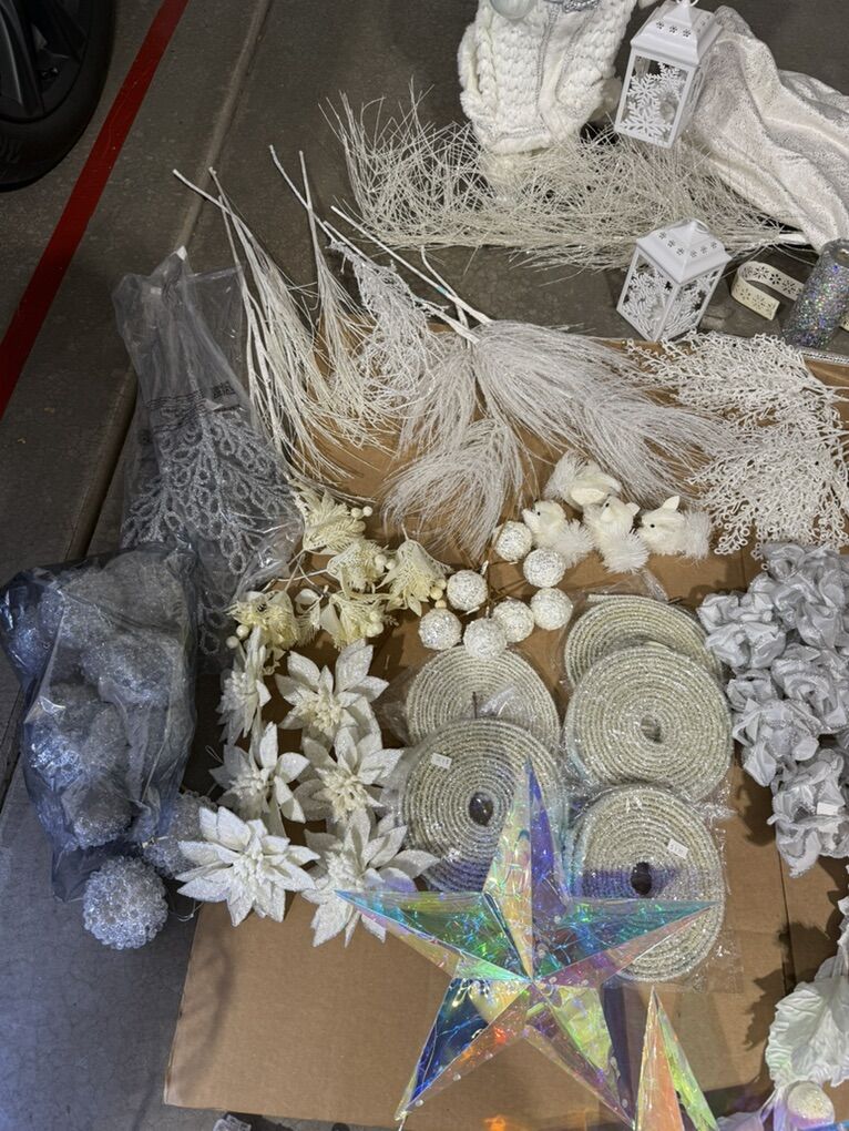Lots of Christmas tree decorations from silver, to off white, ecru. See Less