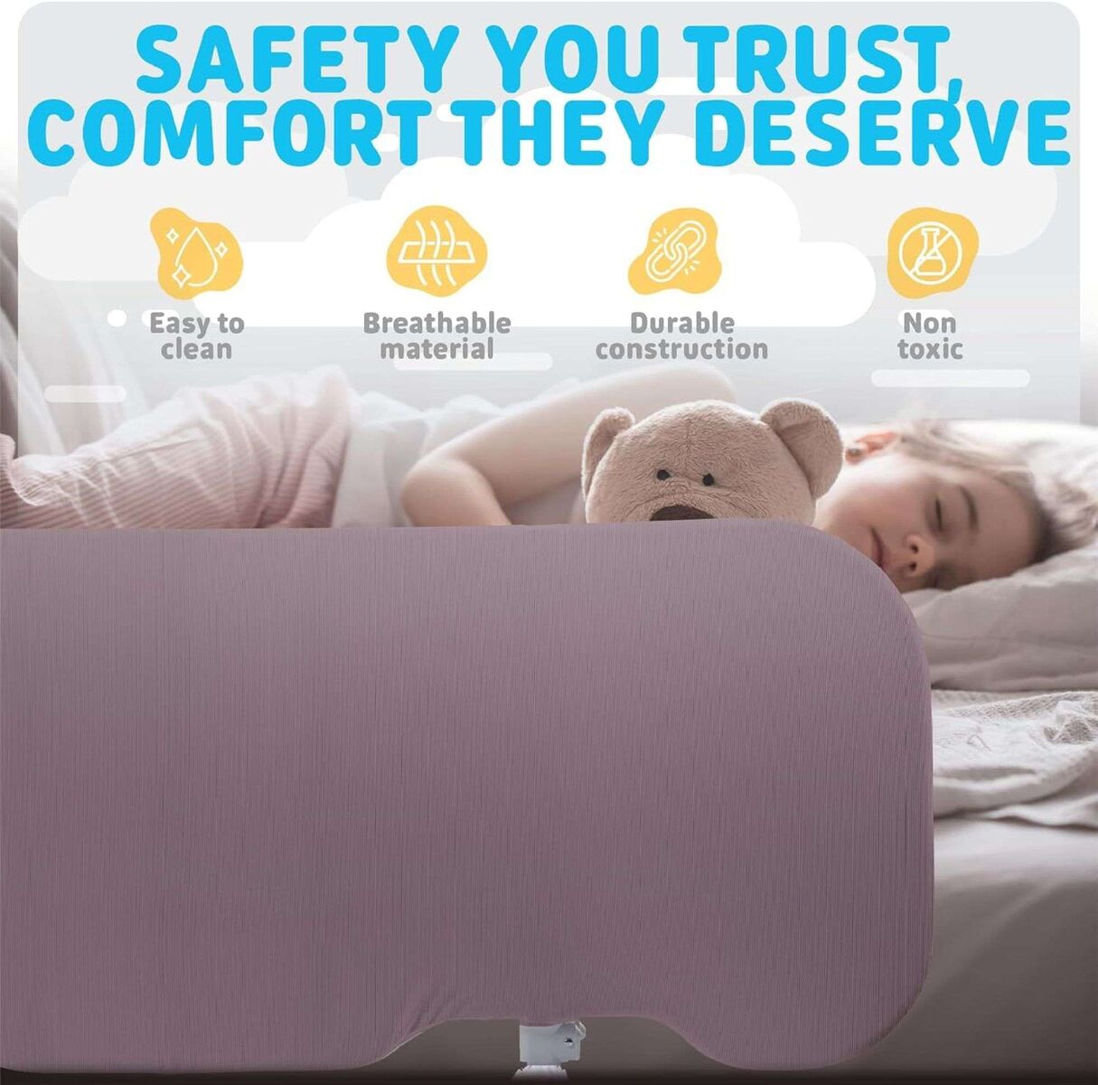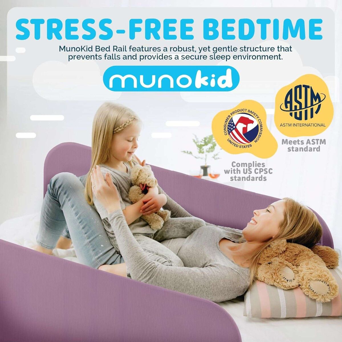 Enhanced Safety and Comfort: The Muno Kid Cloud Bed Rail features an upgraded U-Shaped base for superior stability, a reinforced anchor system, and a high-density, formaldehyde-free fabric cover that s soft and durable. With a robust steel frame and a design that eliminates the discomfort of bars under the mattress, this rail provides a safe and comfortable sleeping environment, ensuring your child is protected all night long from falling Breathable & Safe Design: Our Bed Guard Rail features a smooth, non-angular folding design that protects your child's delicate skin, while the high-quality, breathable mesh fabric allows for optimal air circulation, preventing stuffiness during sleep. This innovative design ensures a secure fit with no gaps or holes, reducing the risk of suffocation, and the mesh fabric is easily removable and for effortless cleaning and maintenance. Quick & Easy Assembly: The Baby Bed Rail is designed for stress-free installation, requiring no additional tools. With its simple, step-by-step setup, you can have it securely attached in just a few minutes. The rail folds down easily with a press of a button for convenient access to the bed and effortless sheet changes. Perfect for busy parents, this bed rail offers both ease of use and peace of mind. Universal Compatibility & Adjustable Fit: This Toddler Bed Bumper is designed to fit seamlessly with various bed types and sizes, including cribs, twin, full, queen, and king beds. Its adjustable height ranges from 17.1" to 25.6", and it offers an extra-wide coverage of 44.5" to ensure your child's safety across different mattress thicknesses. This versatile bed rail ensures a secure fit without damaging your bed or mattress, making it a perfect addition to any bedroom setup. Patented Safety Design & Travel-Friendly: The Muno Kid Cloud Bed Rail features a patented design that ensures maximum safety and reliability, meeting both CSPC compliance and ASTM safety standards. It includes a safety strap for secure installation and comes with a convenient carry bag, making it perfect for travel. Lightweight and portable, this bed rail is easy to fold and transport, ensuring your child s safety whether at home or on the go.