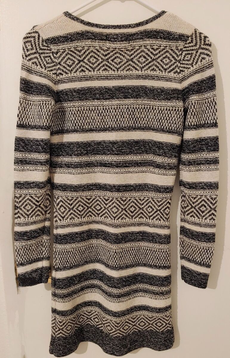 Very nice thicker sweater dress in gray and light tan/beige colors that are knitted together in varying patterns with a striped design and so many details.