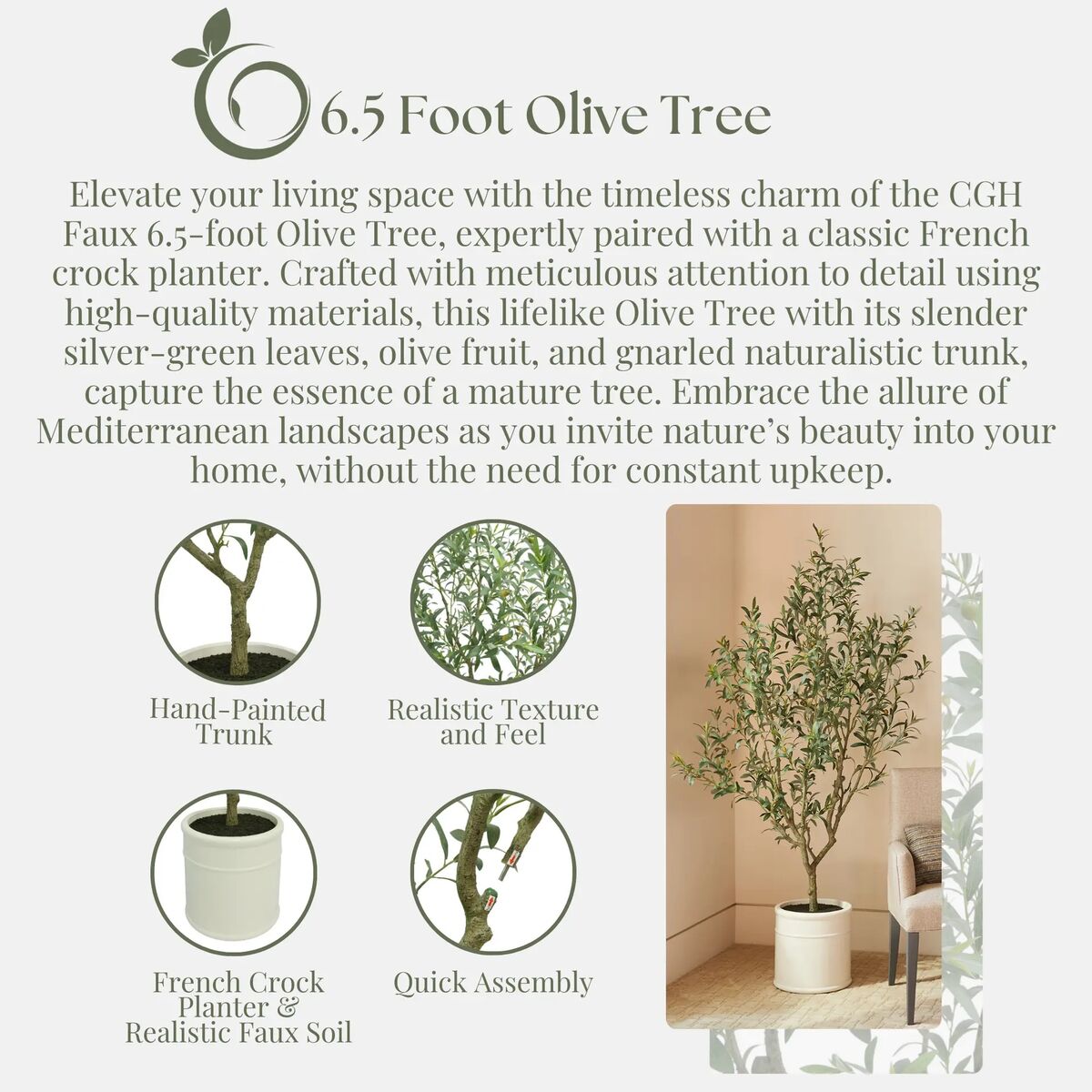 We have one of these Lifelike Olive Trees 6.5 feet with French Planters 1695672 #85076 available. This faux olive tree os Like New and comes out of box.