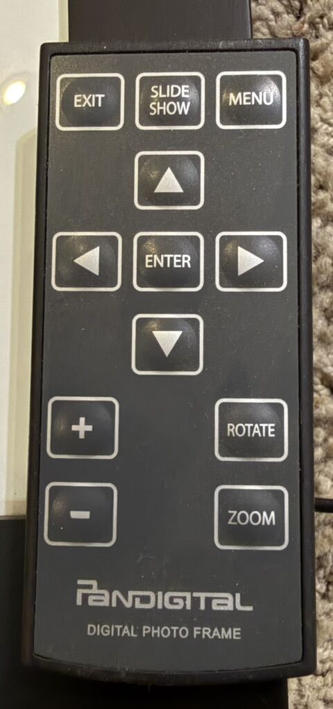 Digital picture frame with remote and other items that can be set up for types of display, etc. It comes with a remote. I used it only once for a funeral. it can be set up on a table or on a wall.
