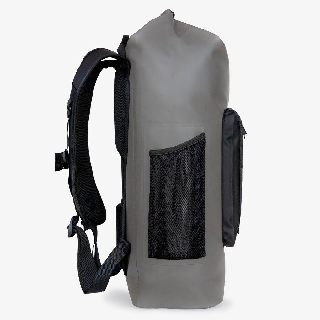 Laek Gear waterproof backpacks are designed for durability and versatility, keeping your belongings dry on the water or in a storm. The rolltop design provides easy access and extra room when needed. The pack features a large protruding pocket, a durable mesh water bottle pocket, and two attachment points for securing gear. Comfort is ensured with a structured back panel, soft padding, and cushy shoulder straps. Inside the bag is a mesh zipper pocket and velcro strips to attach a laptop sleeve. This submersible bag is made of recycled 600 denier polyester with a double-sided TPU coating for sustainability and longevity. On the bottom, a thick 1000 denier panel adds extra protection.