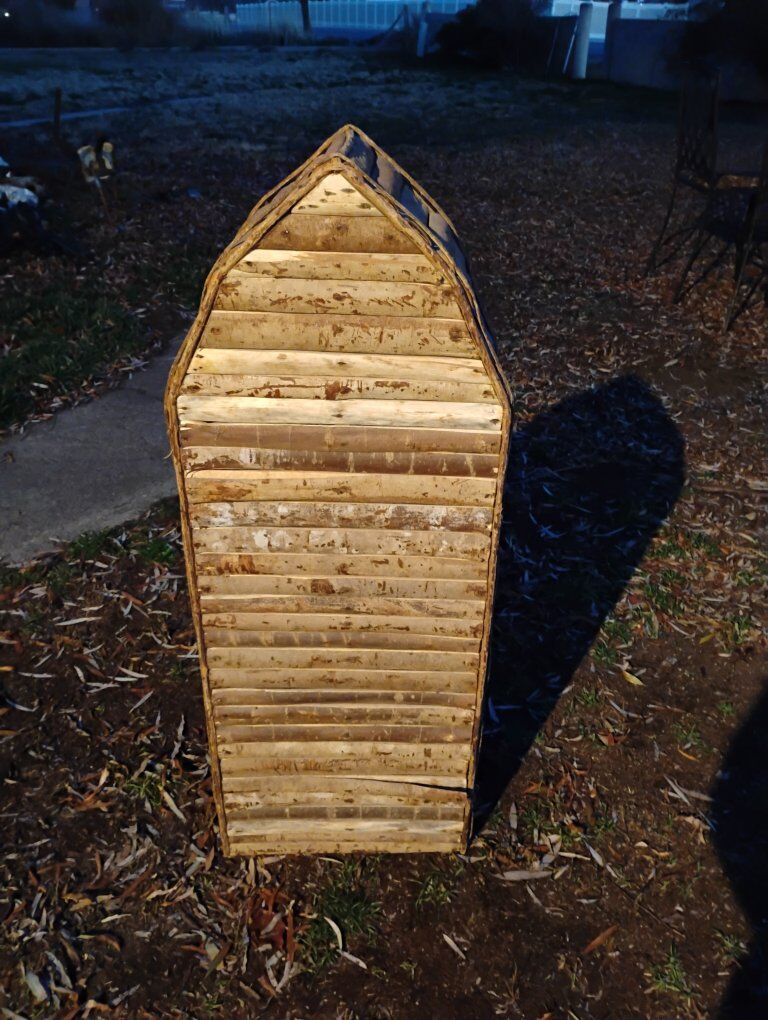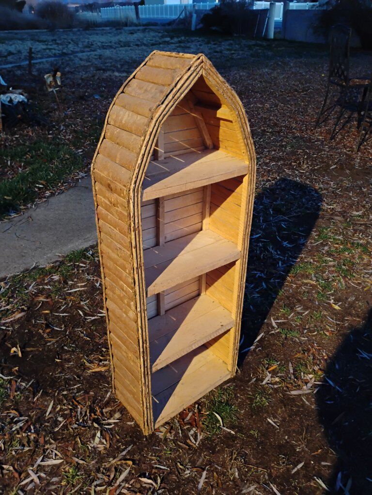 VenmoLooks like it's custom or homemade. Has bark on the wood on the sides and back. See pics. Size 18.5 w 9.5 d 49 tall. Shelves 10.75 tall about 8.5 deep. I've used it for DVD's for years, works great. cute little display unit. no scammers please, getting sick of you guys.