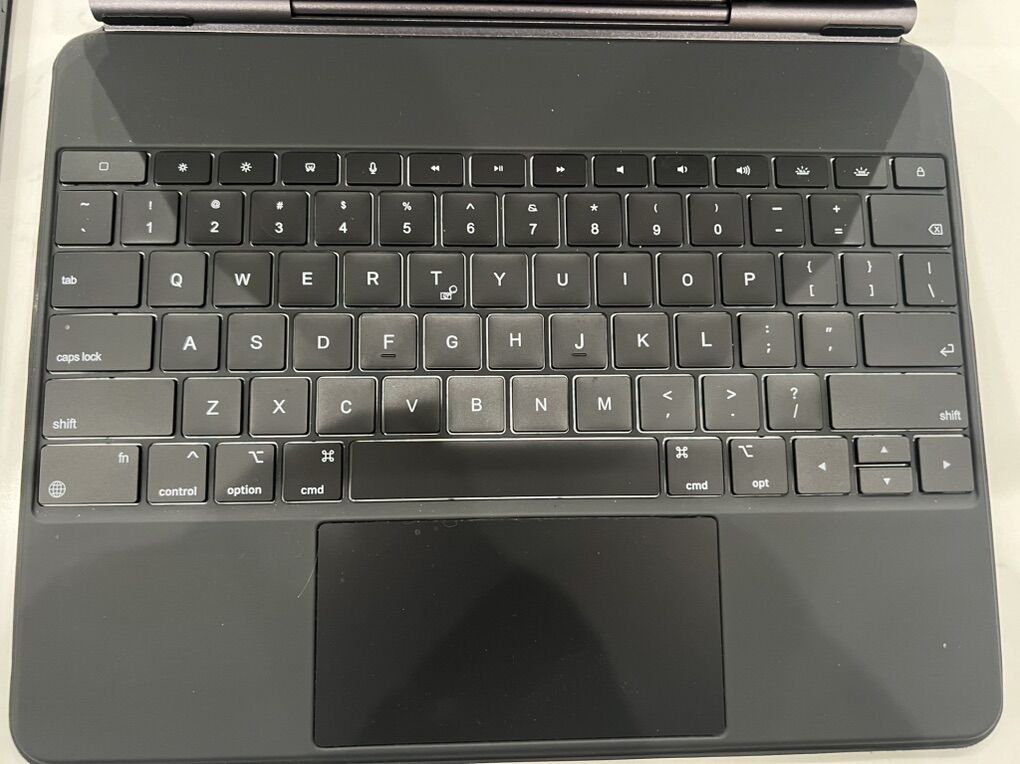 Comes with black aftermarket keyboard, Apple brand SmartFolio black cover, and original charging cable and adapter that haven’t lost their factory virginity yet. Apple Pencil 2.0 compatible, but does not come with one as she never purchased it.