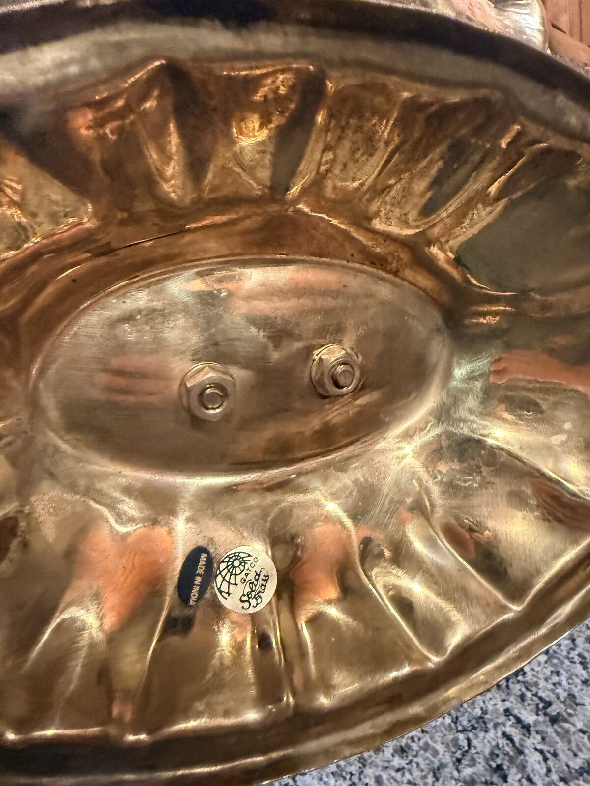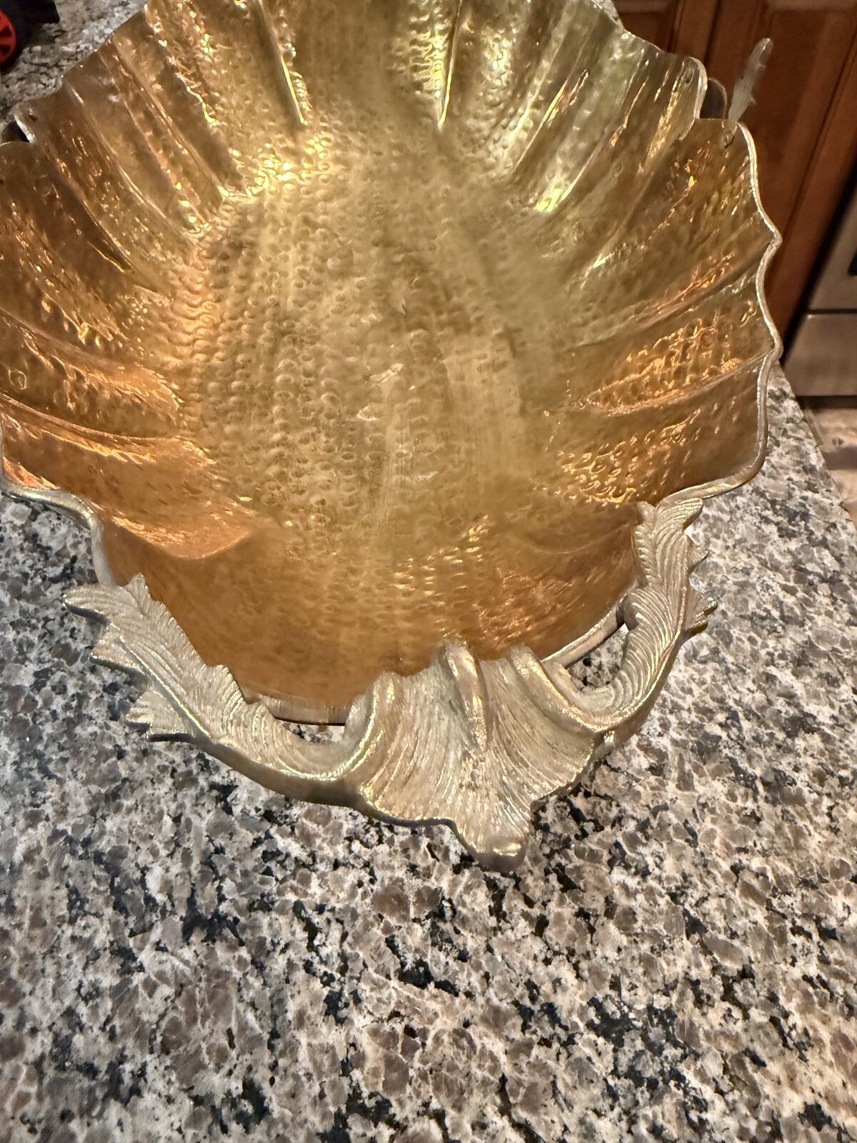 VenmoBeautiful elongated brass console dish, lovely patina that adds charm! Ornately decorated handles. Made in India. Brand is Gatco. Solid Brass. Measurements are 24” long, 12.5” wide, 7.5” tall. Cash or Venmo