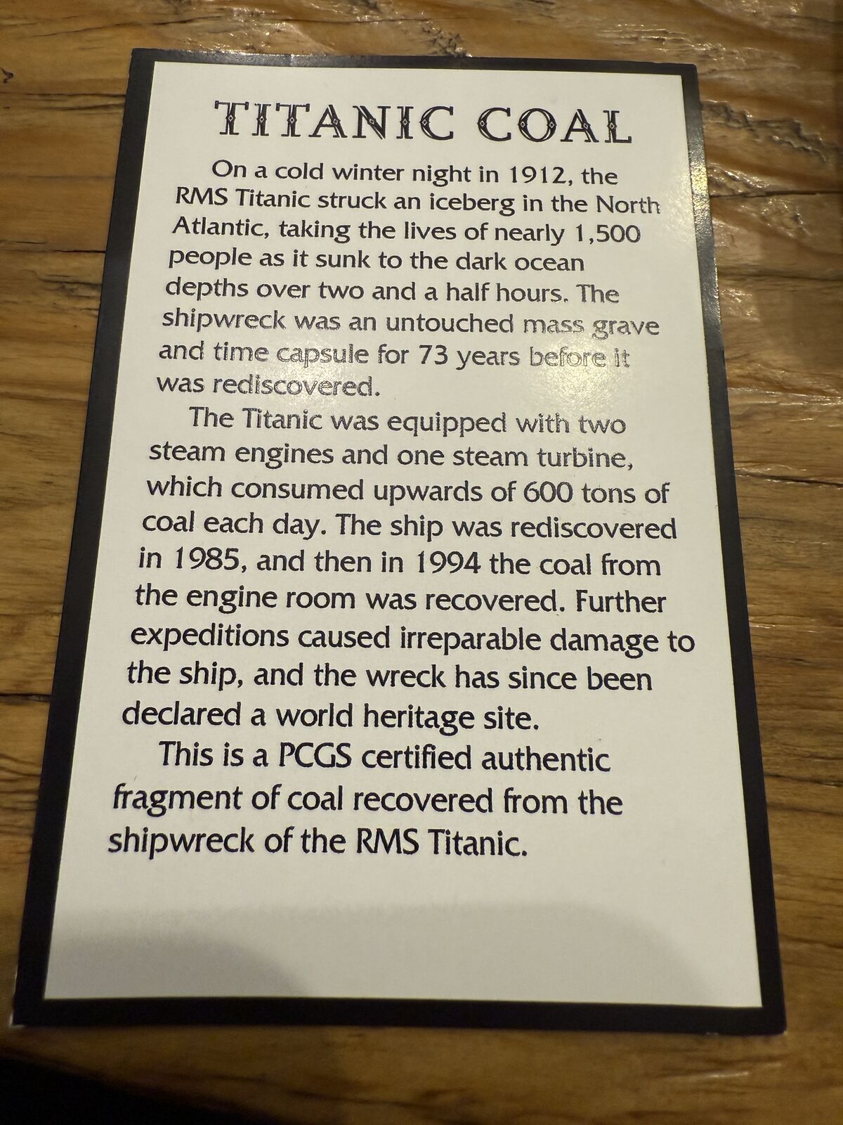 The product is a unique piece of history that includes coal recovered from the RMS Titanic, a famous cruise ship that sank in 1912. This certified genuine coal has been authenticated by PCGS, making it a valuable collectible item for enthusiasts of cruise ships and ocean liners. The coal was retrieved from the Titanic and is a tangible piece of the infamous disaster, adding sentiment and historical significance to any collection related to the White Star Line and the Titanic.