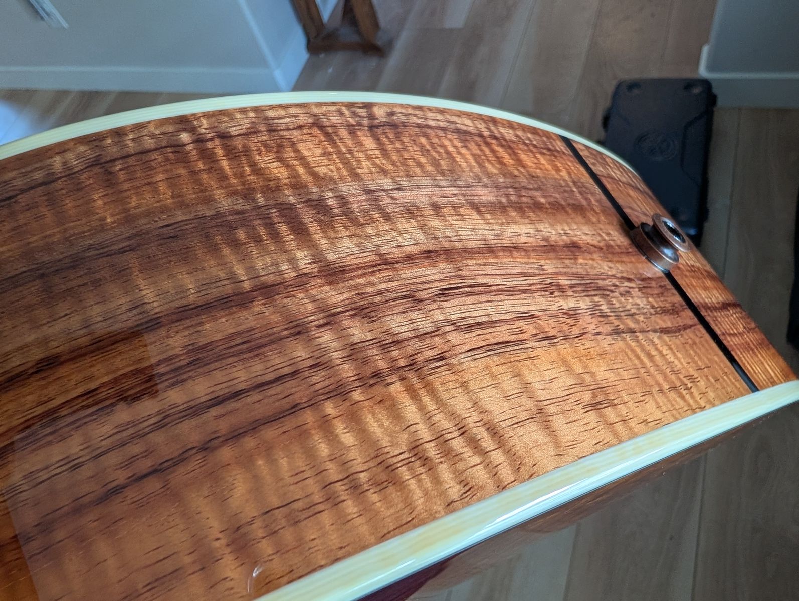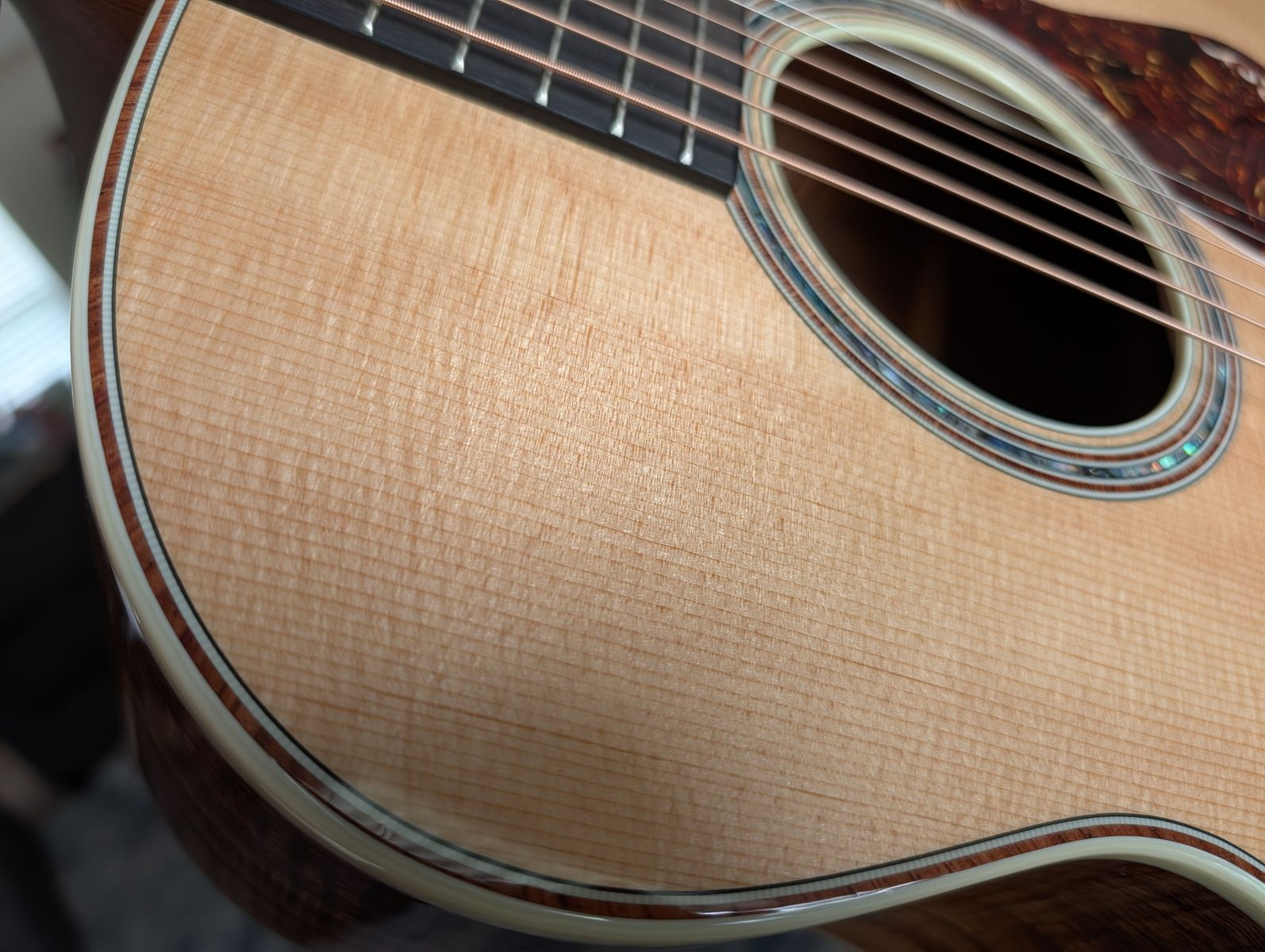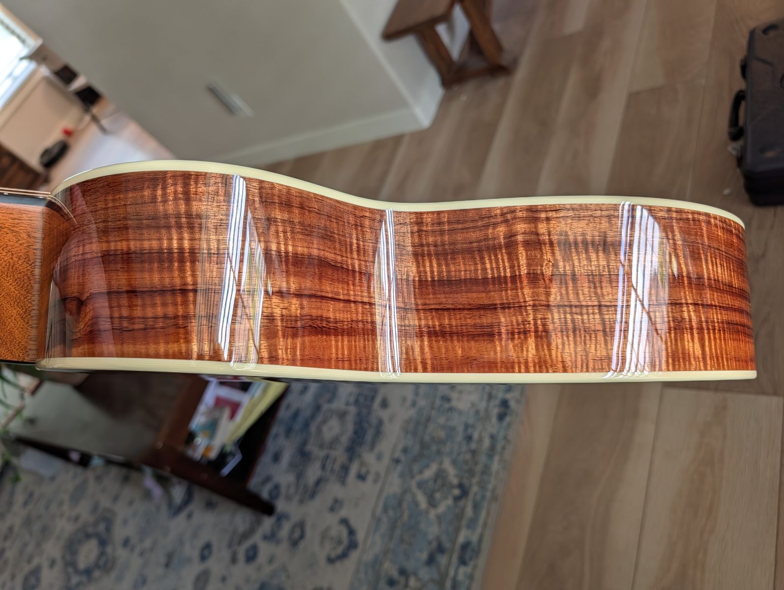 This Taylor Gold Label is absolutely amazing. I've owned a K24 in the past and played on some other very high-end Koa series, and this guitar has some absolutely amazing flame koa -- like the kind that someone might only see on a custom model costing well over $7k.