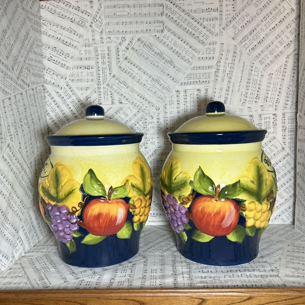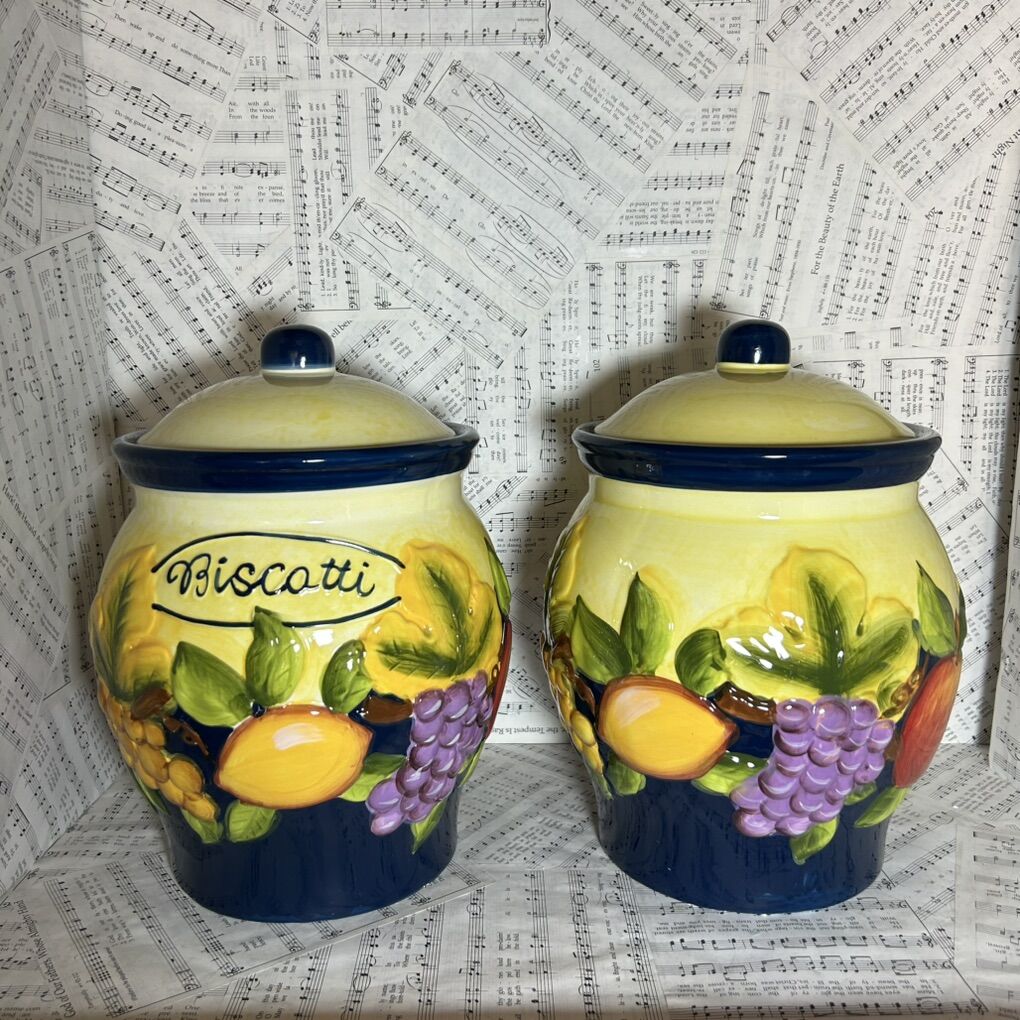 TWO matching Biscotti Cookie Jars with colorful local Mediterranean fruit motif of grapes, lemons, and apples. These fancy storage jars can also be used for rice, flour, sugar, tea, coffee, macaroni, granola or granola bars, after school snacks, candy, etc., or any other item frequently used in the kitchen for baking & cooking & meals. Styling Italian decor but made by Nonni in China. Very colorful & totally useful. No cracks, crazing or defects except for two minor chips on the base of one of the jars. Delivery available to a convenient location when in your area for $5.