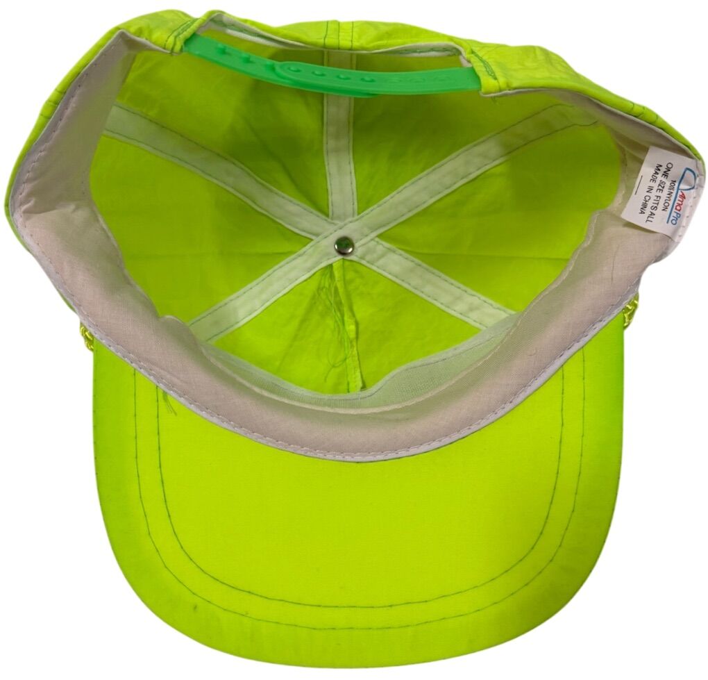The product is a vintage 1990's Bullock Garages flat brim nylon rope neon yellow snapback hat by AmaPro. It features a solid pattern and is suitable for various occasions such as travel, parties, casual wear, and workwear. The hat is lightweight and adjustable, making it a versatile accessory for both men and women who appreciate a retro automotive theme. The bright yellow color and durable nylon material make it a stylish choice for outdoor activities in any season.