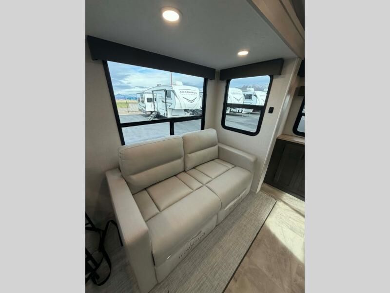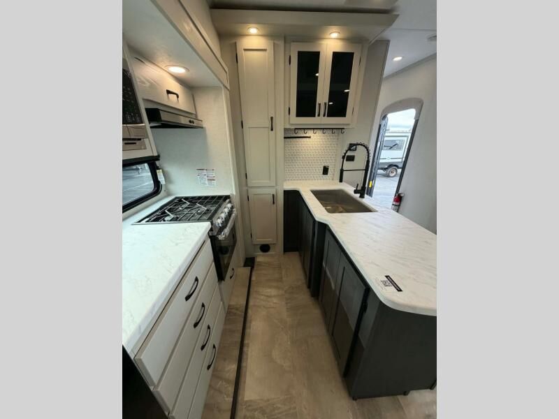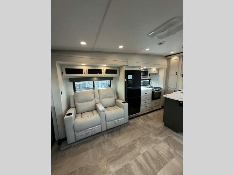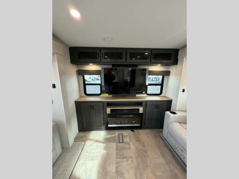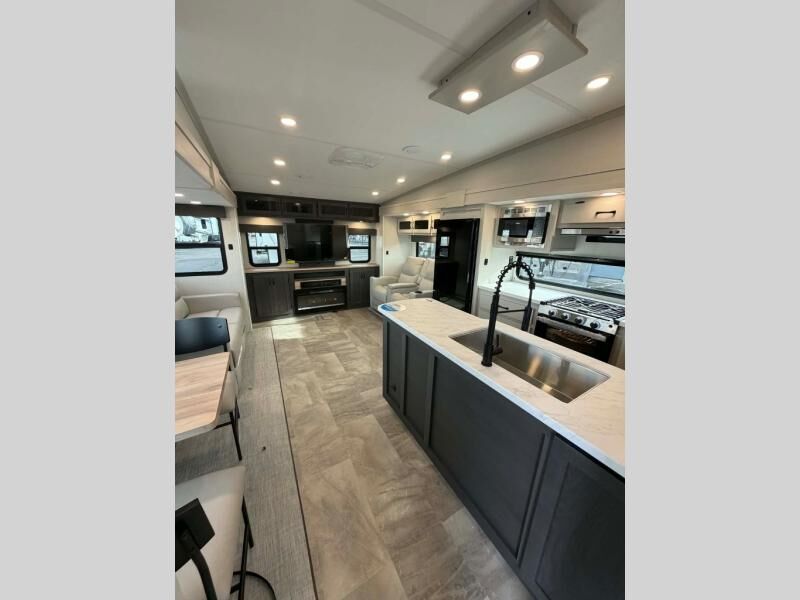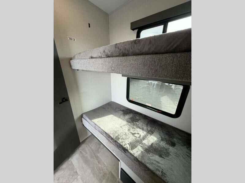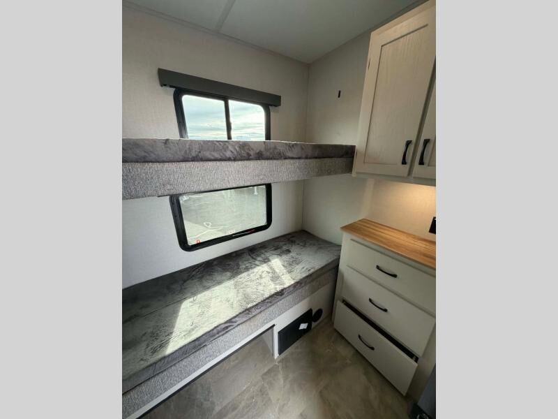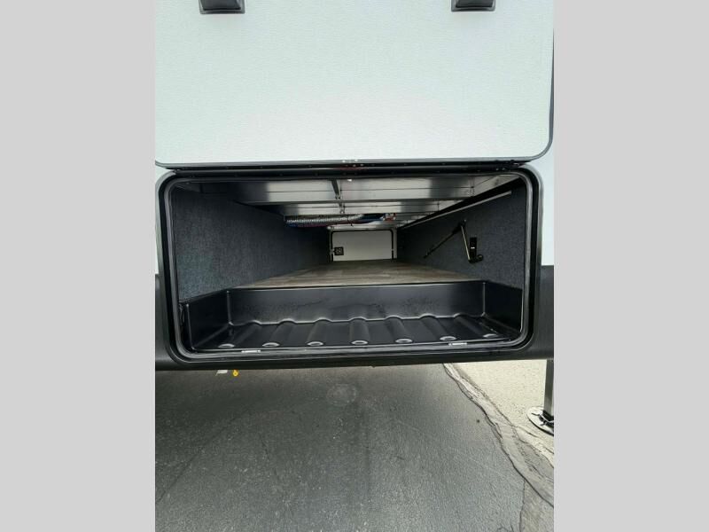 This fifth wheel is perfect for families or large groups since there is a front master bedroom and a middle bunkhouse! The front master suite not only has a queen bed to lay your head on at night and a wardrobe slide, but also an entrance into the dual entry bathroom. The middle bunkhouse has a 30" x 74" bunk bed and a flip-up bunk, shoe storage, and overhead cabinets to keep the clutter away. Grab some eggs from the 10 cu. ft. GE Dual Swing 12V refrigerator, fry them up on the three burner cooktop, and enjoy them at the free-spanning table. You can then read the morning newspaper on either the tri-fold hide-a-bed sofa and theater seating or watch the news with the rear entertainment center!