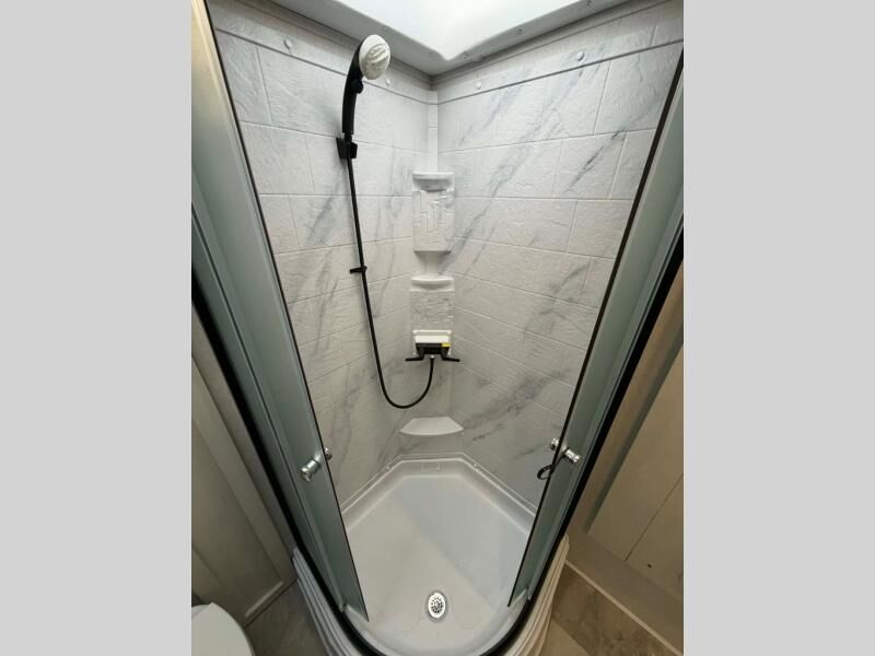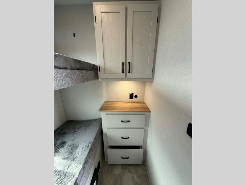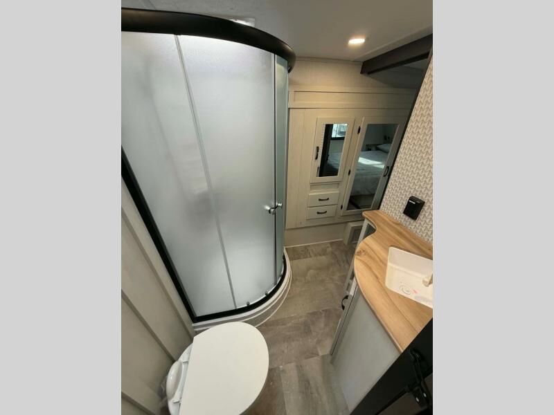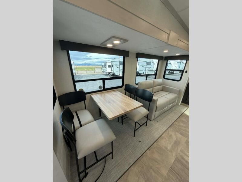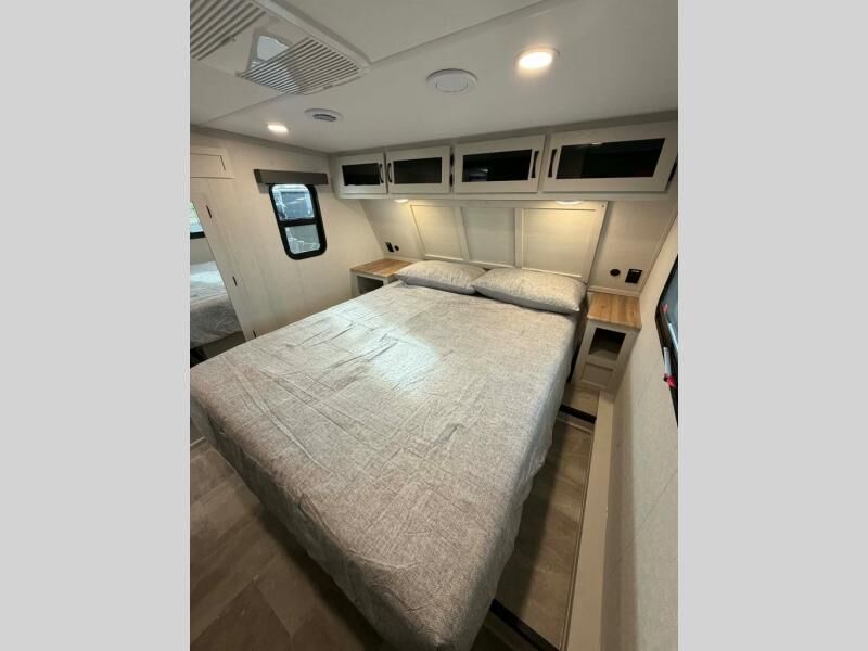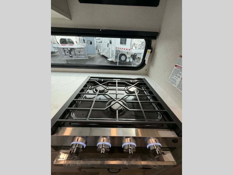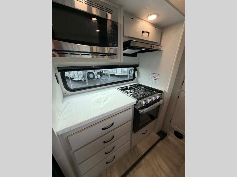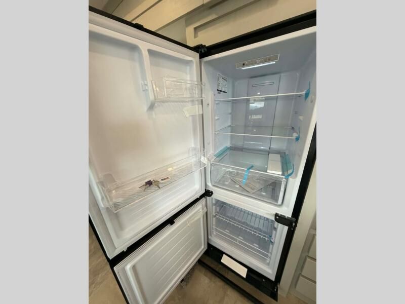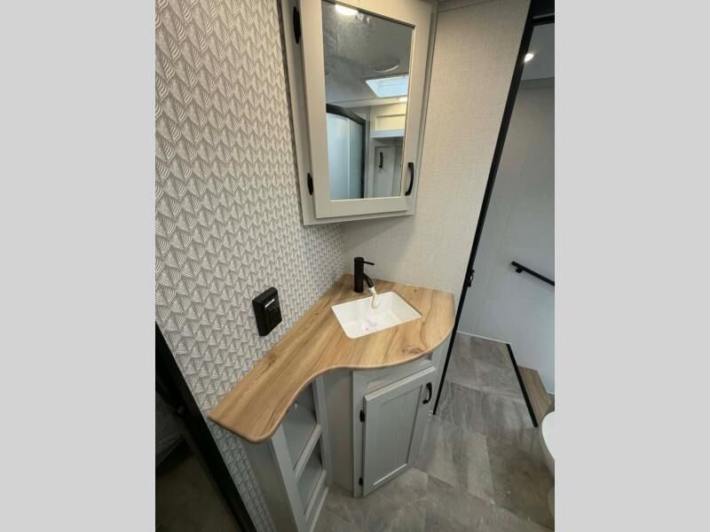 This fifth wheel is perfect for families or large groups since there is a front master bedroom and a middle bunkhouse! The front master suite not only has a queen bed to lay your head on at night and a wardrobe slide, but also an entrance into the dual entry bathroom. The middle bunkhouse has a 30" x 74" bunk bed and a flip-up bunk, shoe storage, and overhead cabinets to keep the clutter away. Grab some eggs from the 10 cu. ft. GE Dual Swing 12V refrigerator, fry them up on the three burner cooktop, and enjoy them at the free-spanning table. You can then read the morning newspaper on either the tri-fold hide-a-bed sofa and theater seating or watch the news with the rear entertainment center!