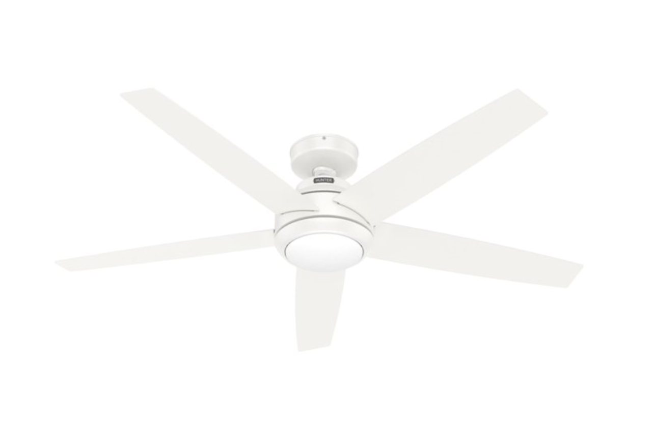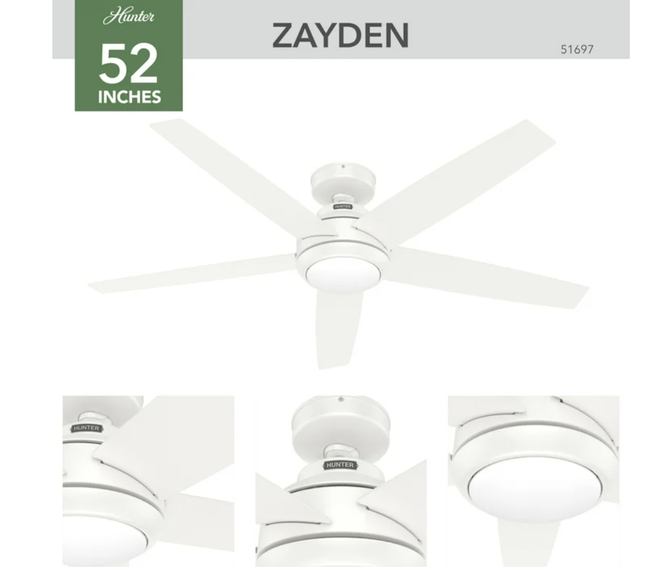 Brand new in box, Hunter. Zayden 52 in. Integrated LED Indoor Fresh White Ceiling Fan with Light Kit and Remote Included