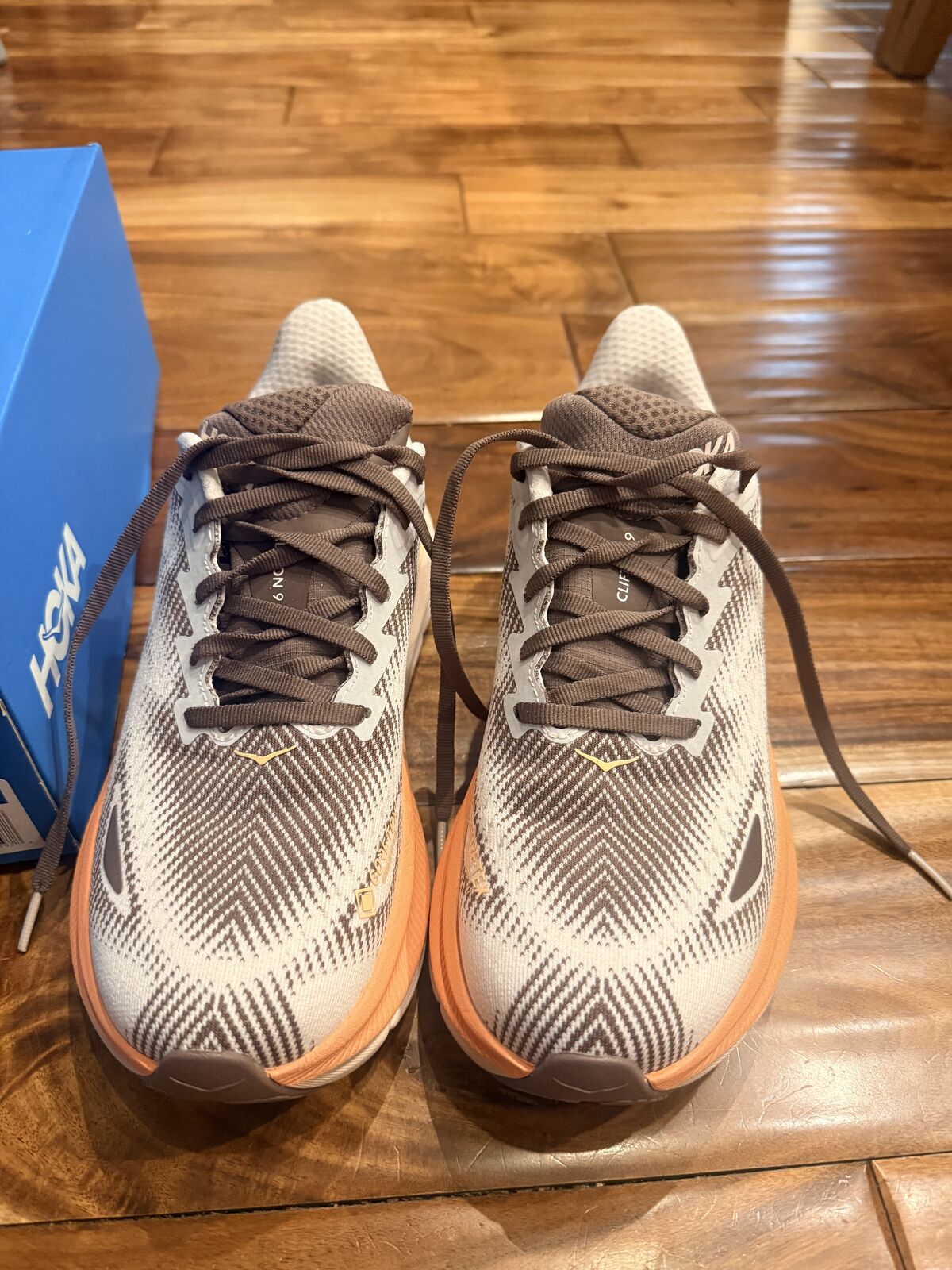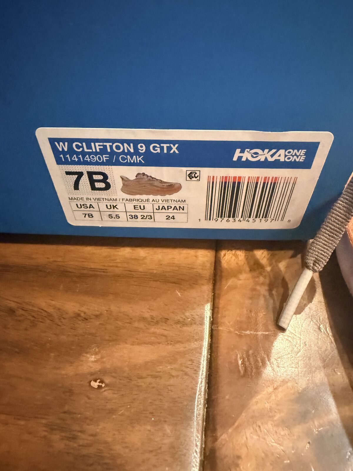 VenmoThis is a pair of HOKA Women's Clifton 9 GTX running shoe in the Cosmic Pearl/Smoky Quartz. They are a size 7B. They are brand new in the box. Sadly they were too tight for my foot.