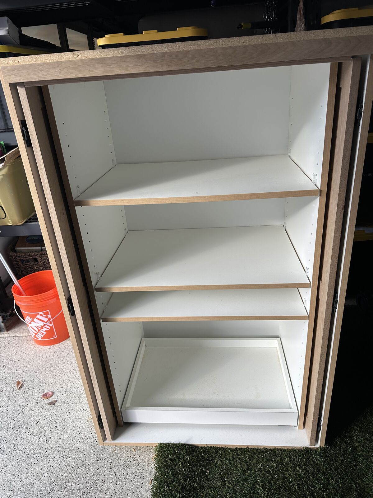 VenmoCustom white oak cabinet with "garage " style doors with rollout shelf .