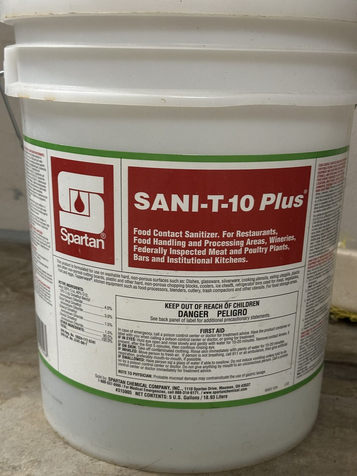 5 GALLON PAILS OF SPARTAN SANIT-T-10 PLUS QUATERNARY SANITIZER FOR RESTAURANT AND COMMERCIAL USE ON TABLES WAREWASHING ETC. FDA APPROVED