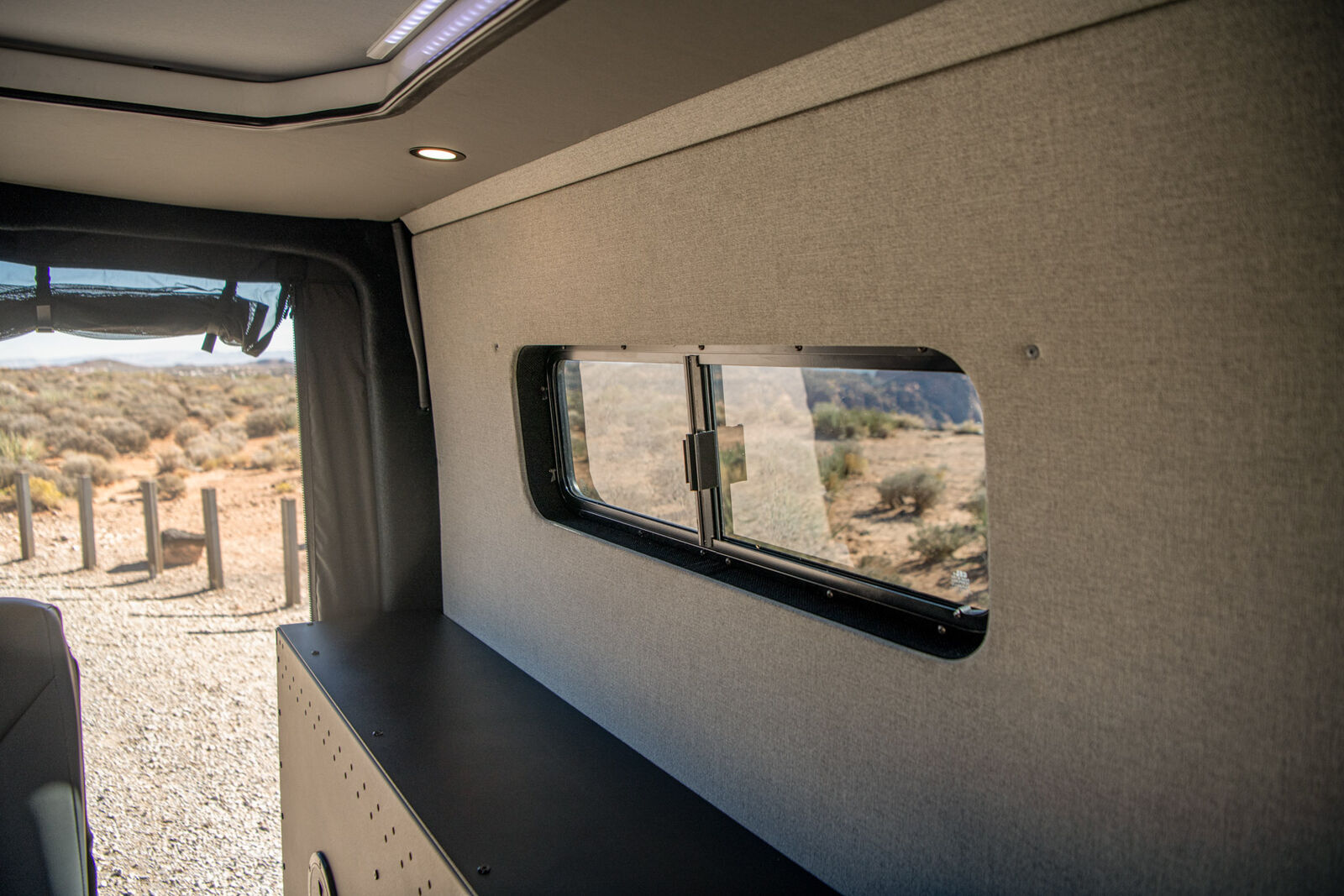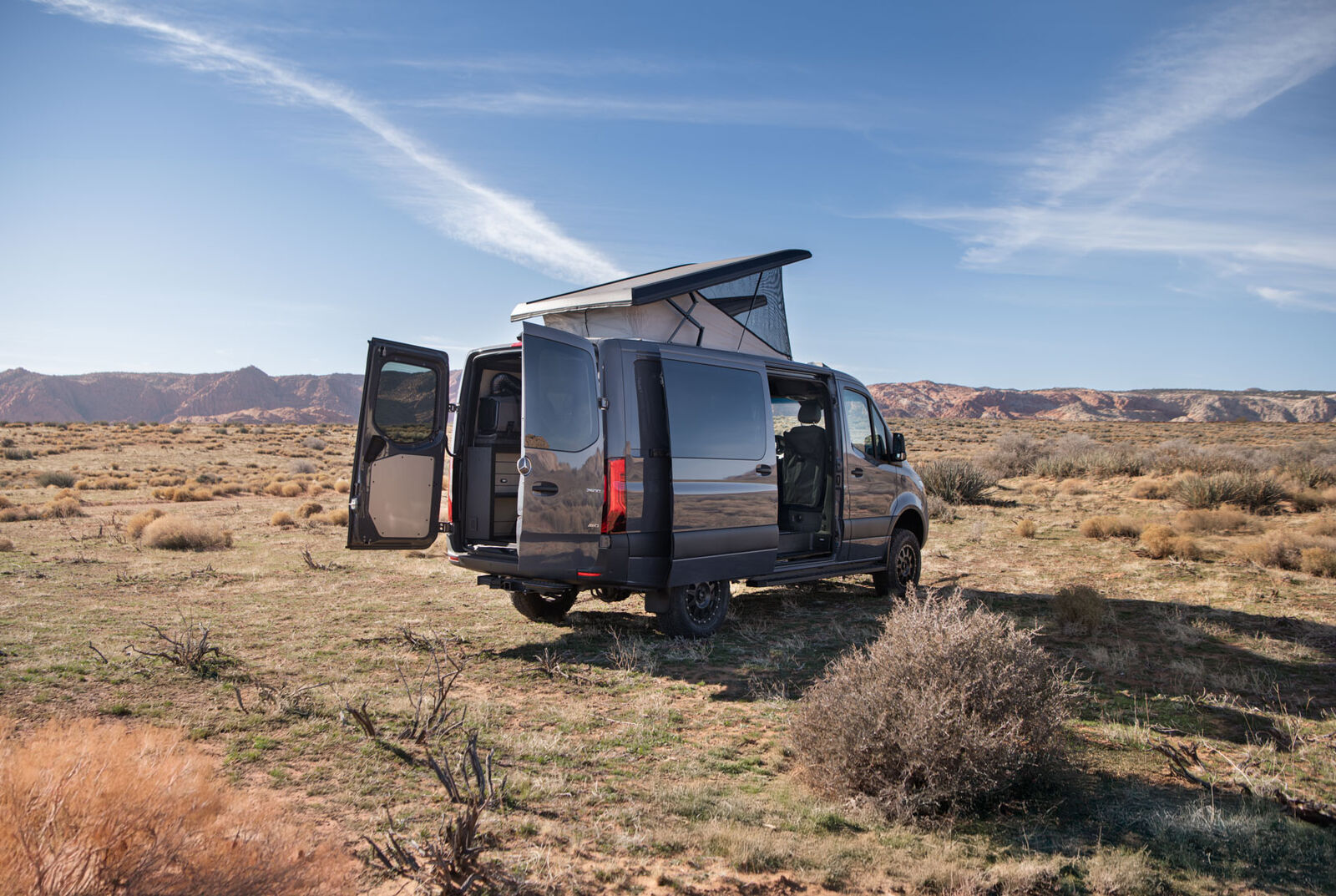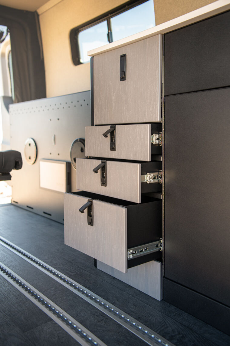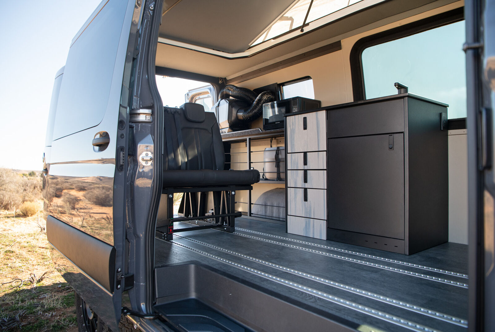 This compact van includes a four-drawer Galley with a 7-gallon fresh and grey water system, made from lightweight, powder-coated aluminum and warm composite surfaces. For seating and sleeping, the MobiFrame SAF42 Two Person Sliding seat converts easily into a bed and can slide to adjust passenger proximity. Powered by the EcoFlow DELTA 3 Max Plus (2048Wh) and an optional WAVE 3 Add-on Battery, the living space has multiple outlets, while strategically placed lights illuminate the van. The Low Roof Sprinter Body style navigates tighter spaces and garages, and the adaptable midspace lets you reconfigure seating and storage to suit your current lifestyle needs.