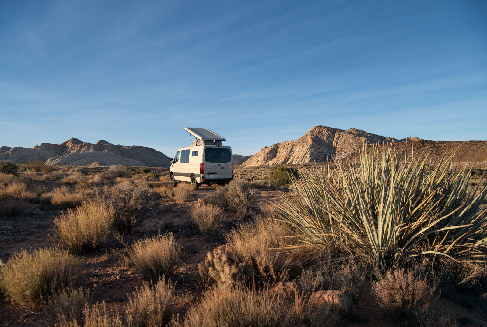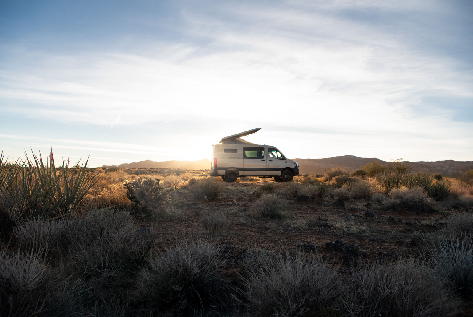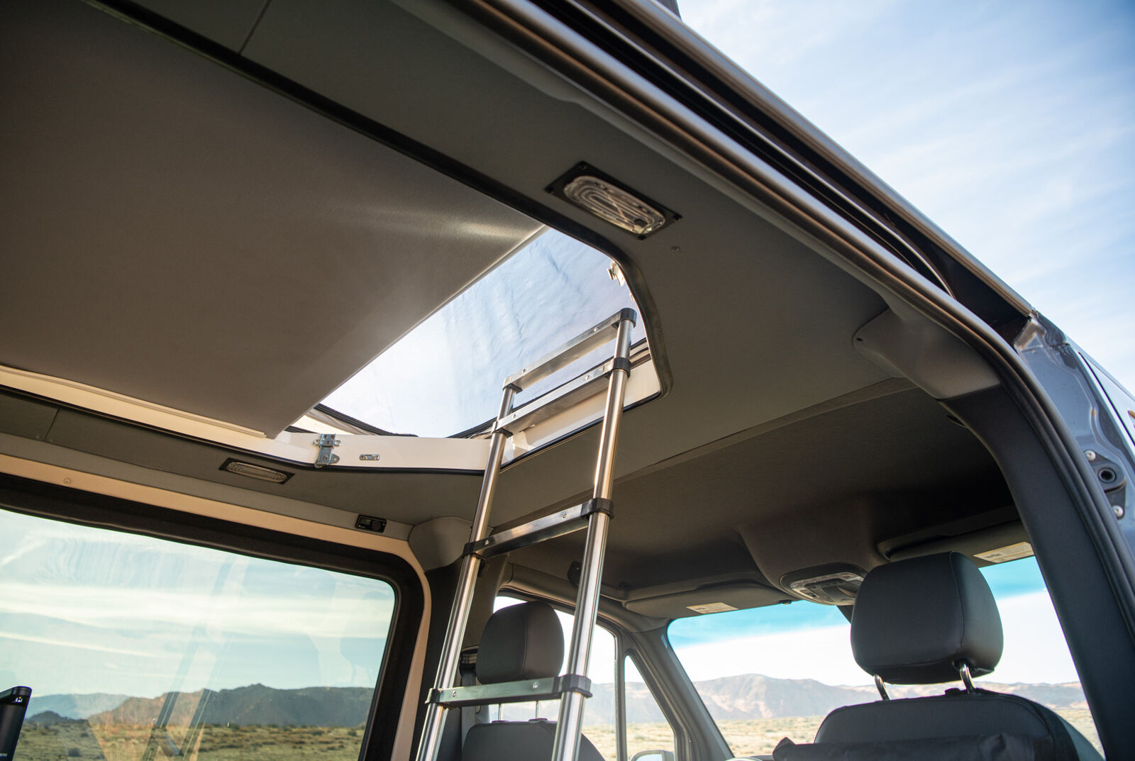 This compact van includes a four-drawer Galley with a 7-gallon fresh and grey water system, made from lightweight, powder-coated aluminum and warm composite surfaces. For seating and sleeping, the MobiFrame SAF42 Two Person Sliding seat converts easily into a bed and can slide to adjust passenger proximity. Powered by the EcoFlow DELTA 3 Max Plus (2048Wh) and an optional WAVE 3 Add-on Battery, the living space has multiple outlets, while strategically placed lights illuminate the van. The Low Roof Sprinter Body style navigates tighter spaces and garages, and the adaptable midspace lets you reconfigure seating and storage to suit your current lifestyle needs.