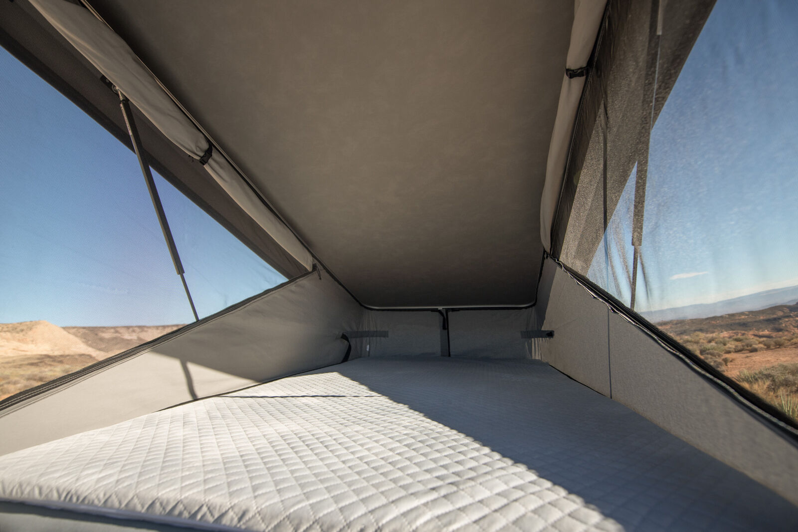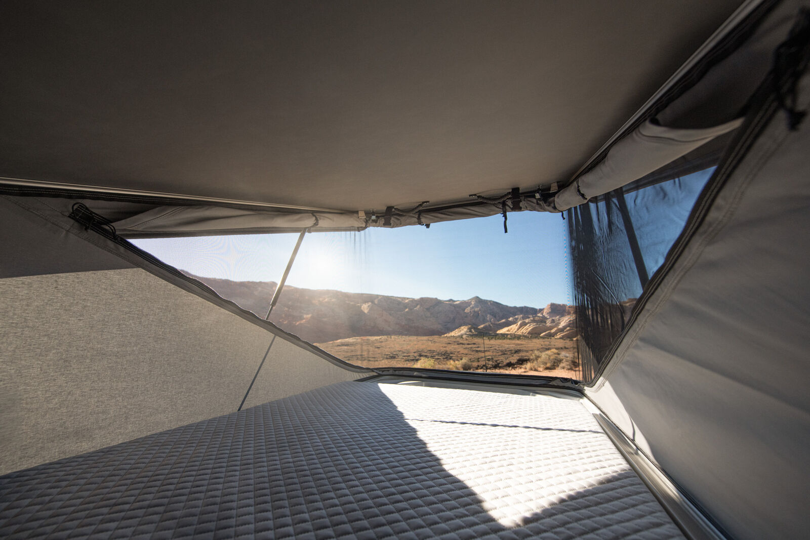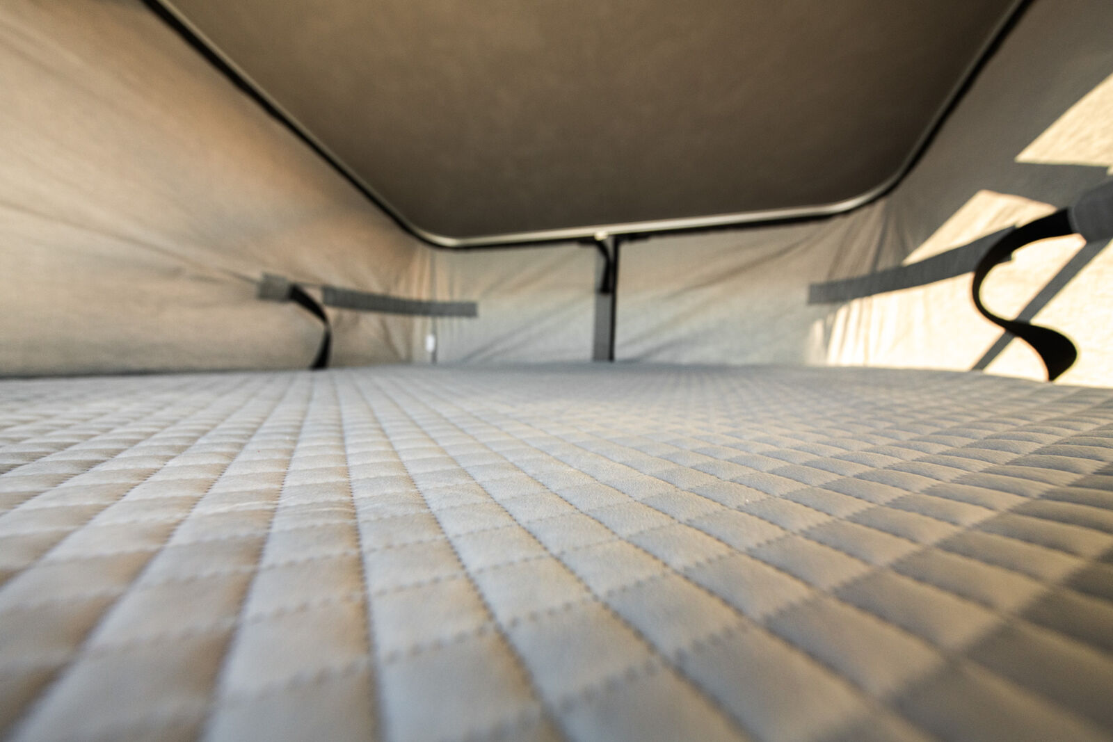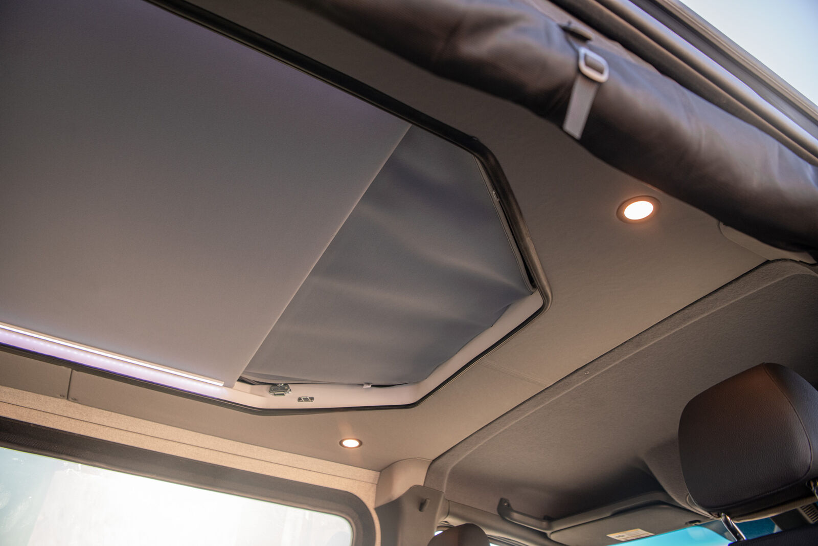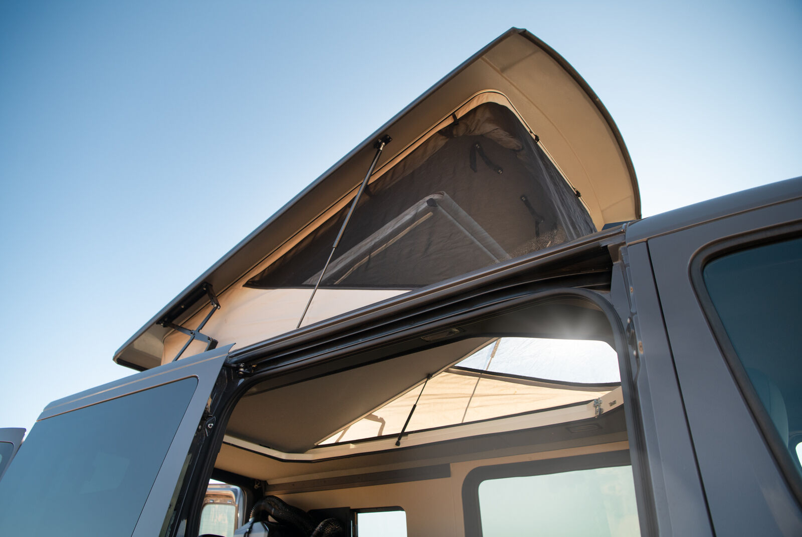 Starting at the low price of 135,000, THE VANAM GETAWAY 144 features a built-in MOBIFRAME Pop Top Tent for two adults, equipped with the Froli bed system for comfort and ventilation. The adjustable layered screening allows for airflow, warmth, and privacy, while providing stunning panoramic views. The bed can also be raised to create additional standing room in the van's living space.