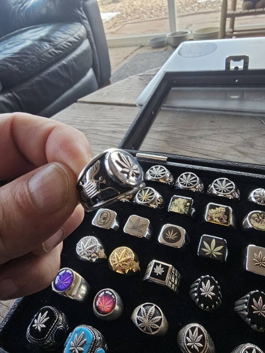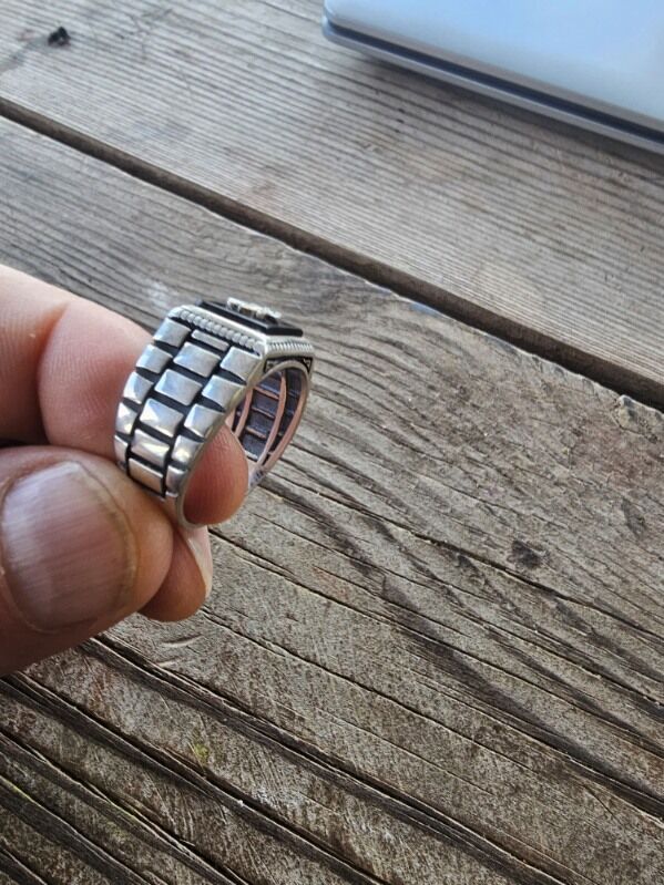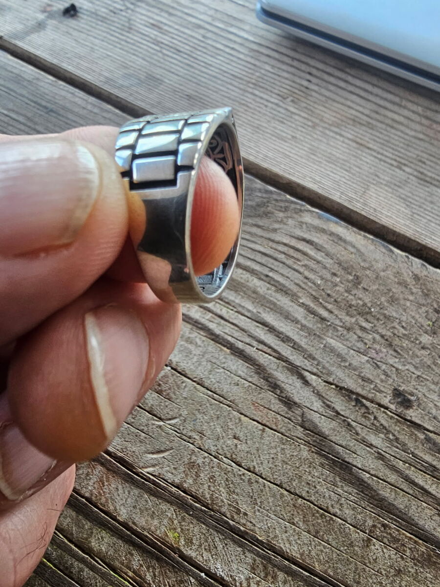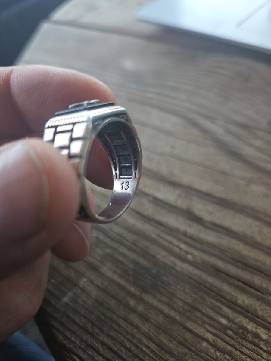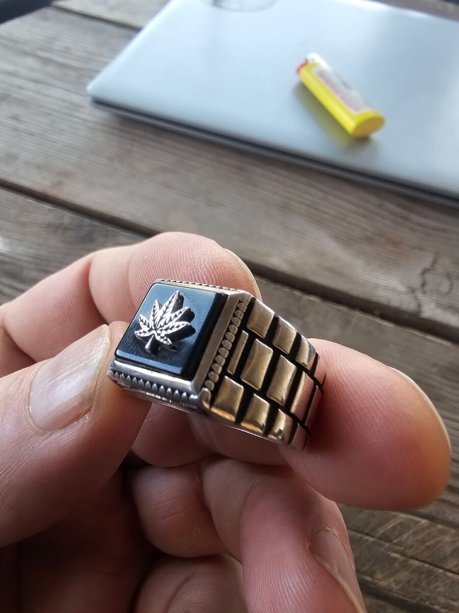 High quality mens .925 sterling silver ring with black onyx and leaf inlay. Size 13. Many more sizes and designs to choose from.