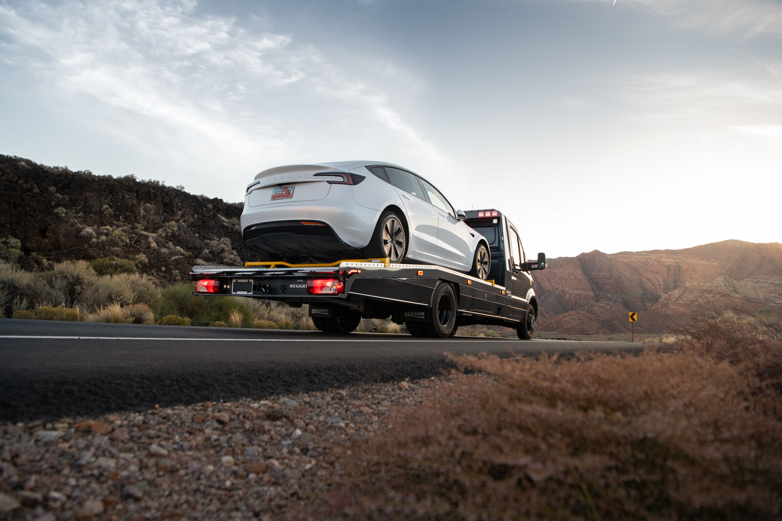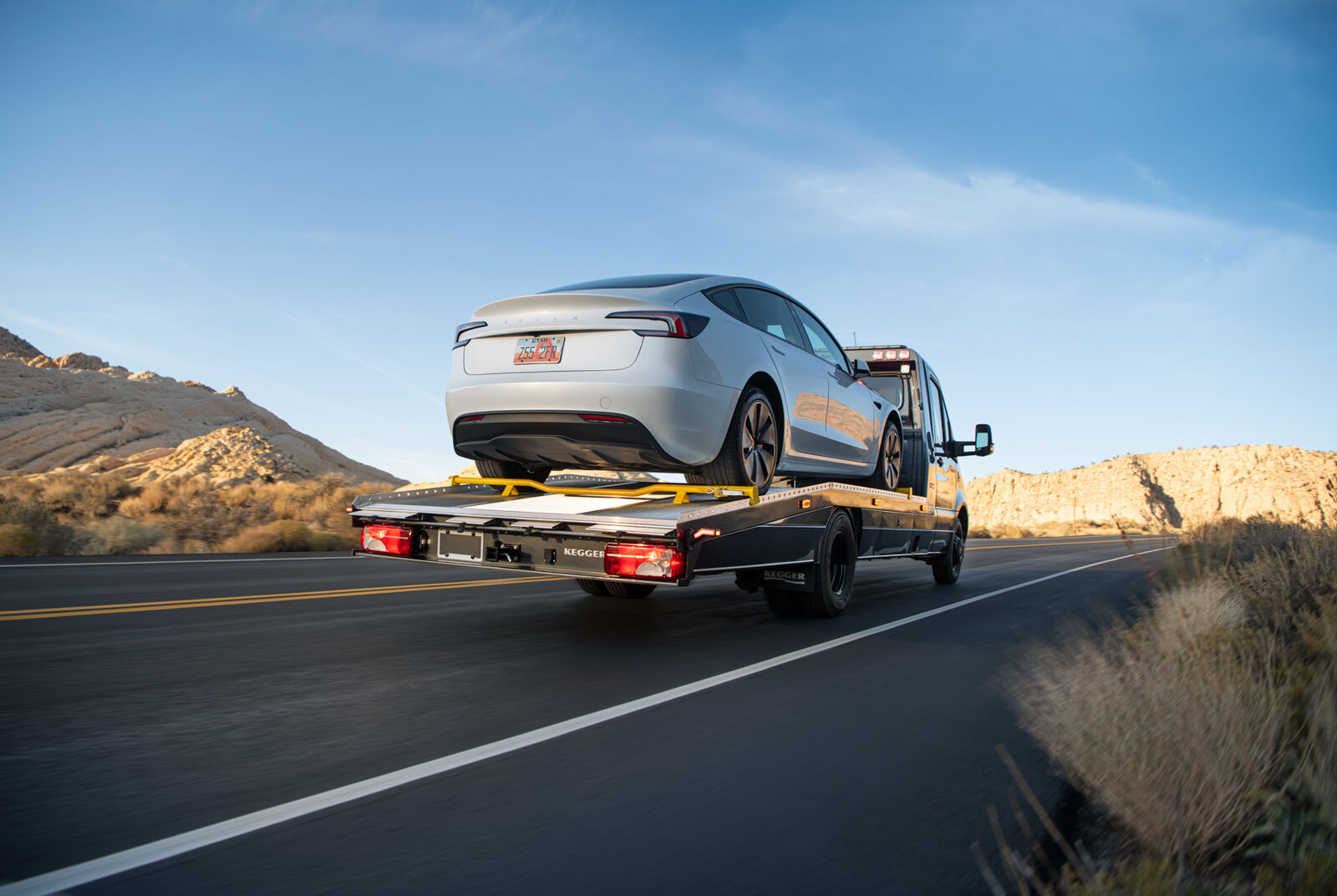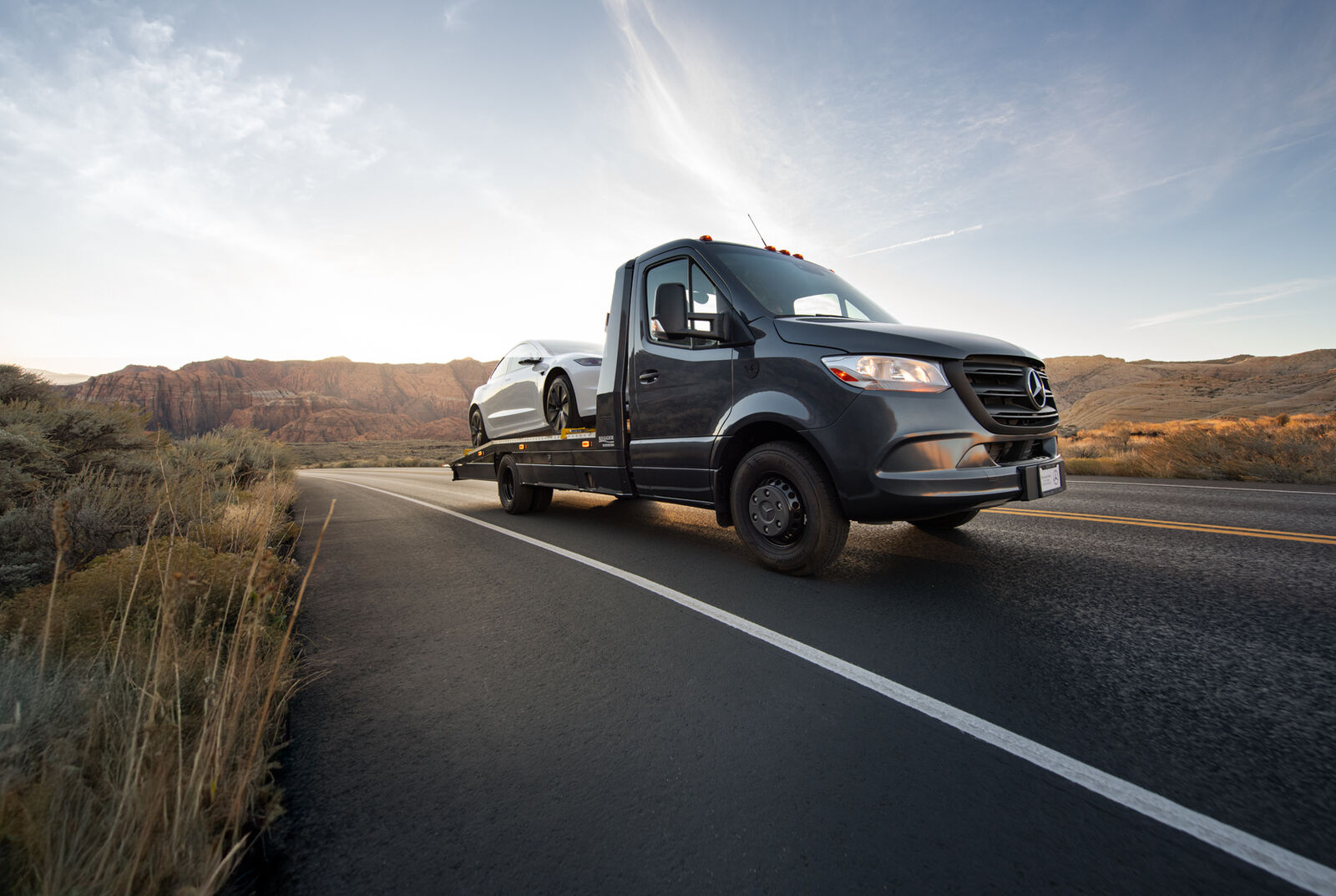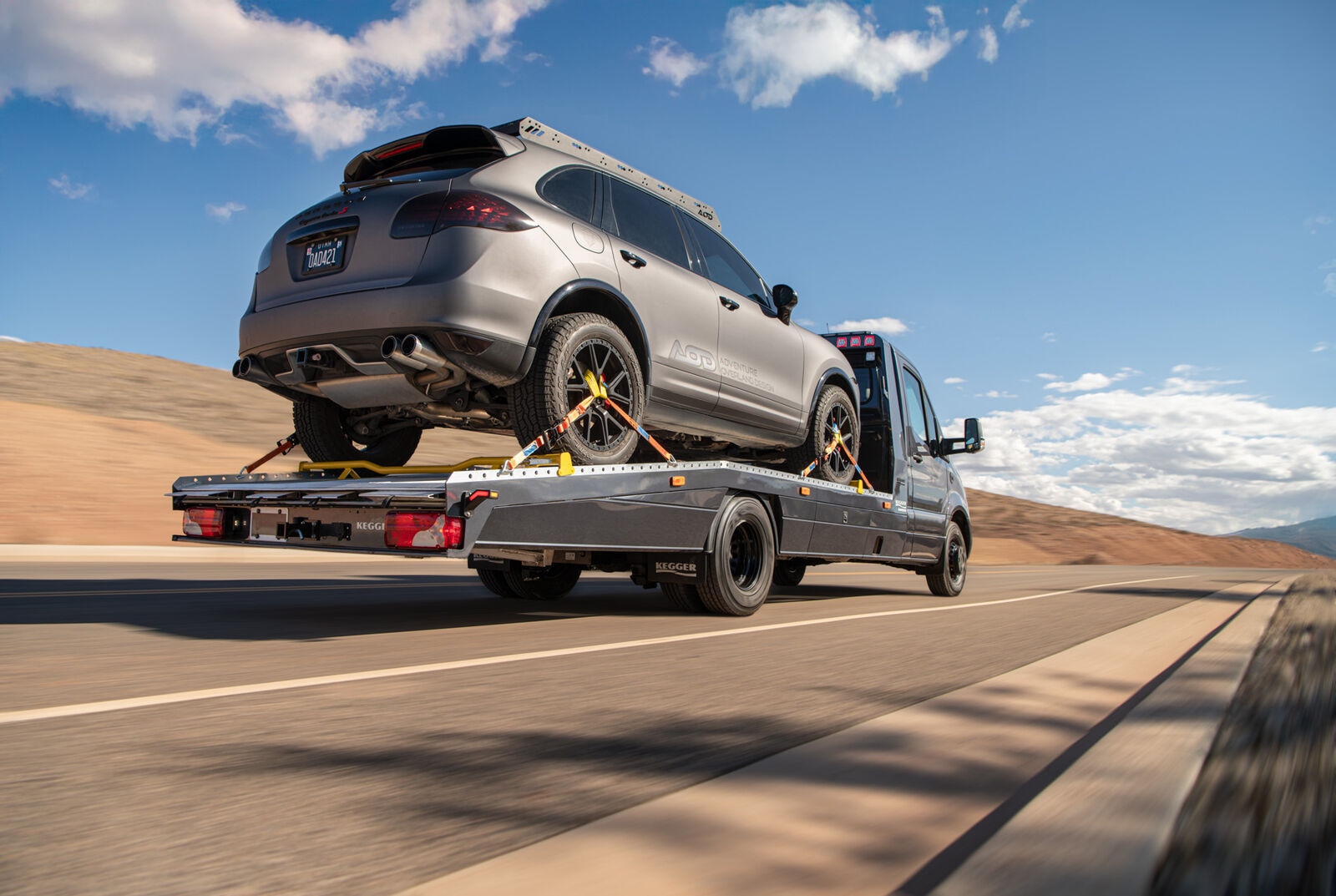 Built on the Sprinter Cab Chassis platform, this exotic sports car transport vehicle is designed to safely move high-value vehicles. It is equipped with the KEGGER High Race [5T] + Auto platform, along with VB Air Suspension's VB-FULLAIR 2C adjustable air suspension for enhanced stability and performance. The Kegger High Race [5T] + is a lightweight aluminum loading platform for a vehicle with a GVW over 3.5 tons. Its design integrates seamlessly with the Sprinter cab chassis, resulting in a cohesive transport vehicle. It features a Remote control system for operating the winch, warning lights, work lights, and the [5T]'s innovative ramp locking system. Also included are an integrated toolbox for traps, ani nter-axle step & handle on either side of the deck, additional LED neon lights on the tower, LED neon marker lights. With the VB Fullair 2C, the KEGGER [5T] loading platform height can be adjusted to ensure comfortable vehicle entry and exit, particularly when ground clearance is an issue. In addition, the air suspension system filters out road surface irregularities, improving ride comfort. This system includes air springs, shock absorbers, height sensors, a compressor, and an electronic control unit.