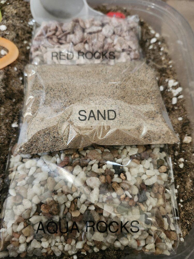 What’s Inside: *Custom Dirt Blend: Kid-safe soil, sand, perlite, and charcoal *Two-Tone Non-Stretch Bugs in different colors for discovery and imaginative play. *1 Scoop for digging and pouring *3 Texture Bags: sand, aqua rocks and red rocks *Foldable Paper Sheet: set under the bucket to help keep play neat *Heart-Shaped Stone (treasure).