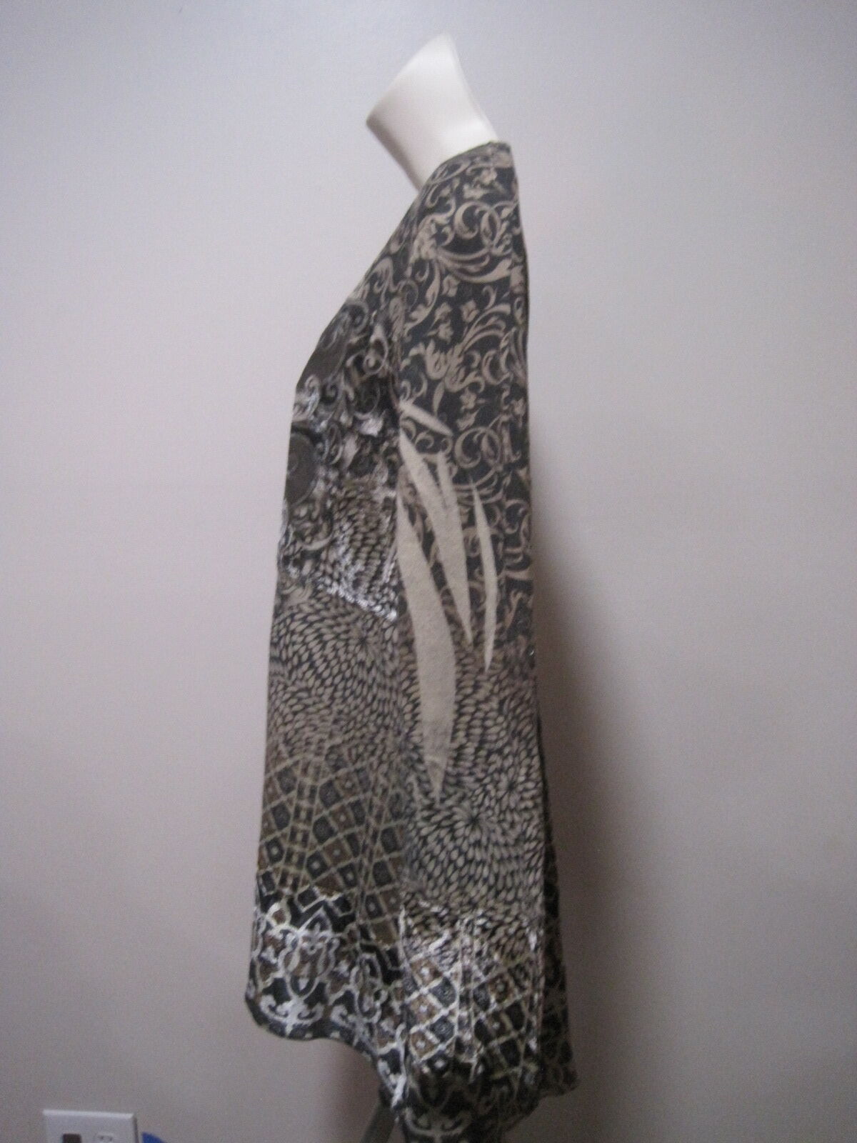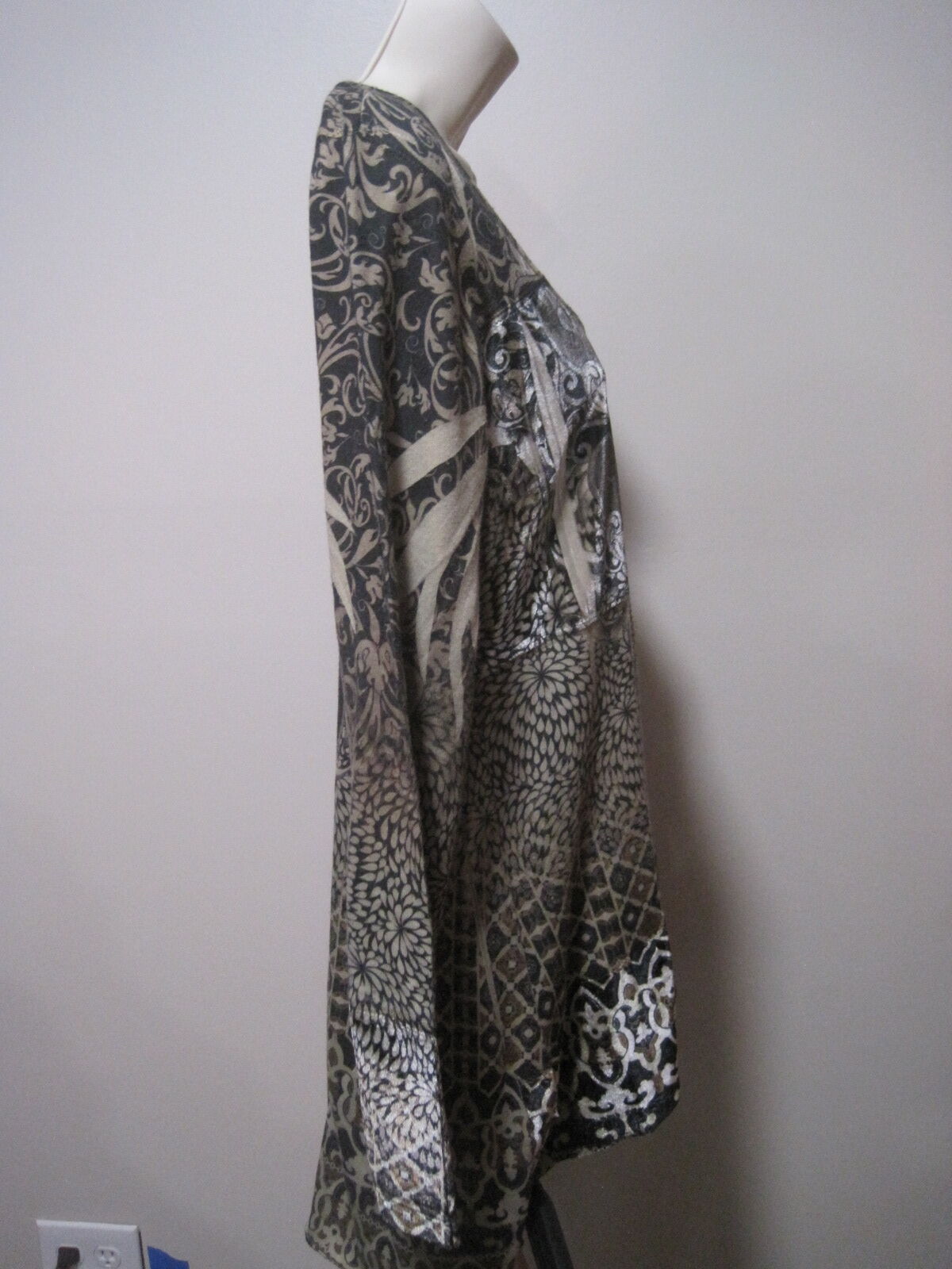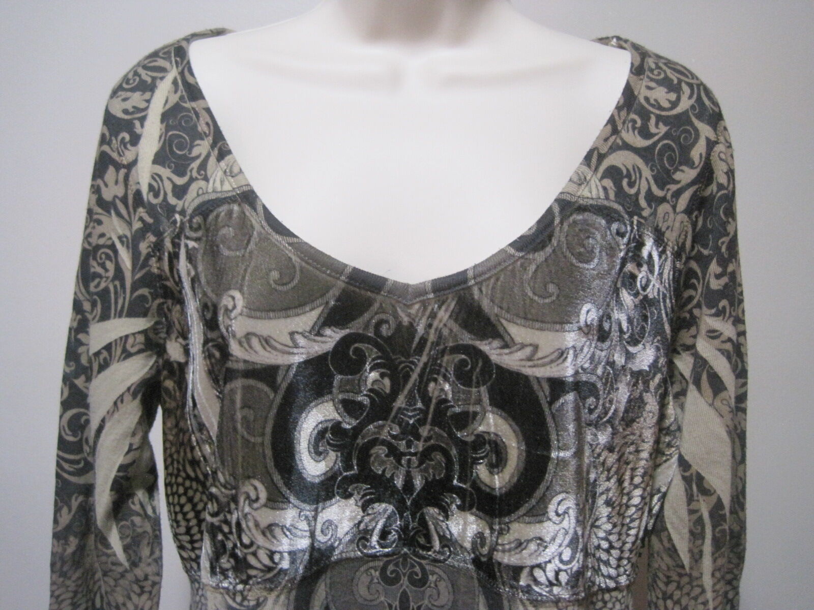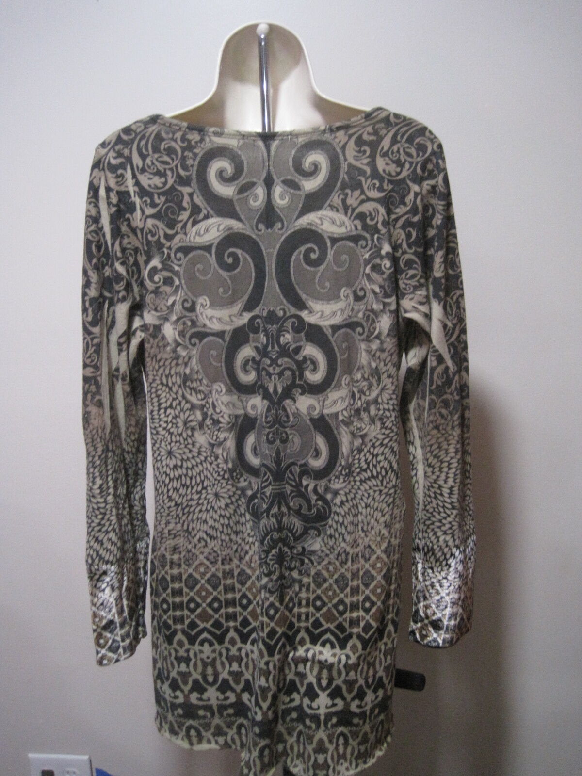 The Live & Let Live Tan & Black Velour Inlay Velvet Women’s Long Sleeve Shirt in size Large is a stylish and versatile addition to any woman's wardrobe. Made from a comfortable blend of 93% polyester and 7% spandex, this shirt features a geometric pattern in beige with velour accents for added texture. The pullover style with a sweetheart neckline and casual long sleeves make it perfect for various occasions such as travel, parties, or casual outings. This easy-care shirt is machine washable and designed for a regular fit for all-day comfort. Perfect for the modern woman on the go.