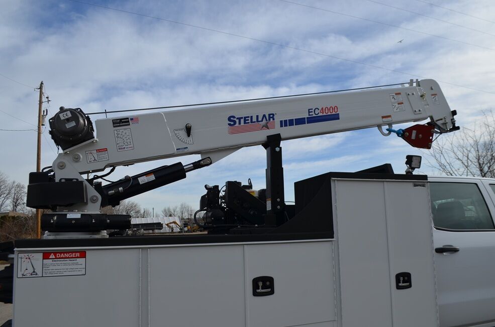 Stellar EC 4000 hydraulic crane, 4,000 lbs. max capacity, 20' max, reach w/ wireless remote. Manual rear downriggers, right side manually extends.