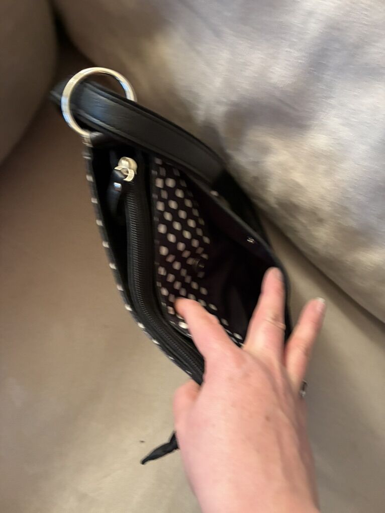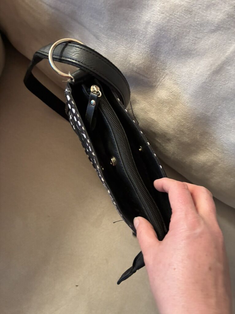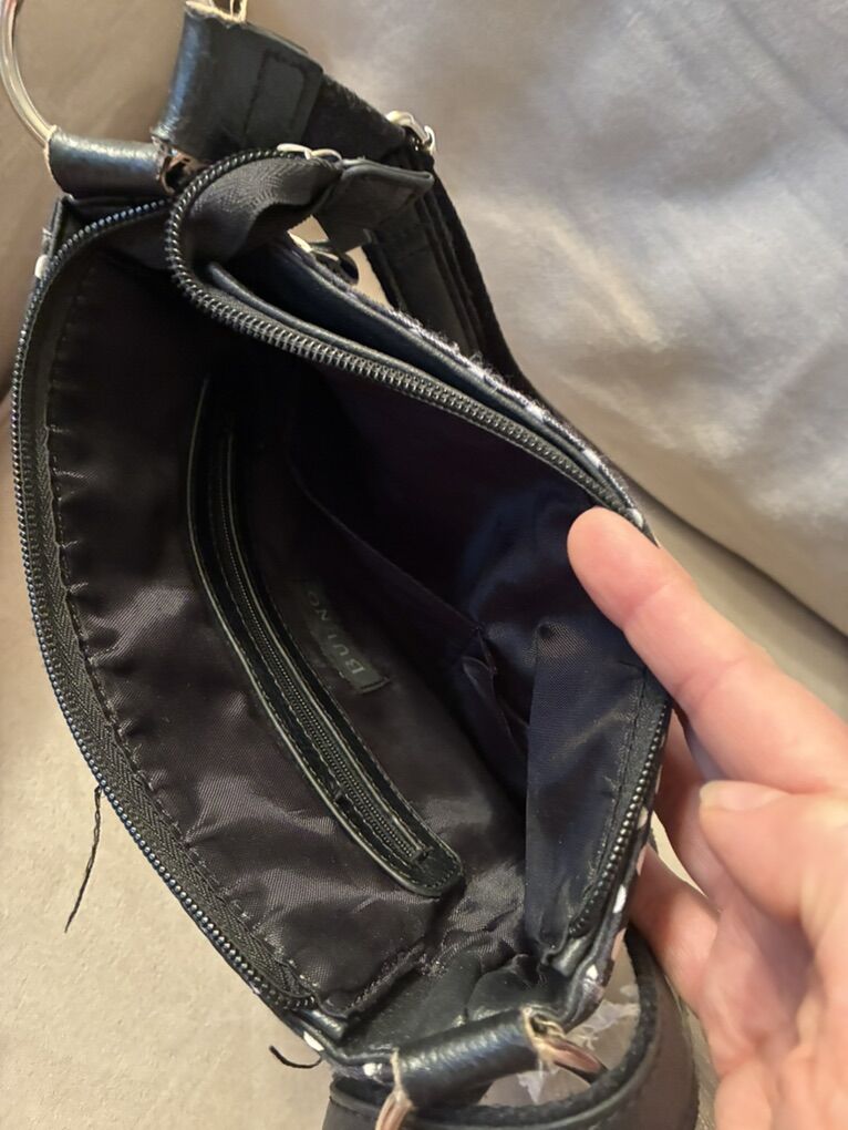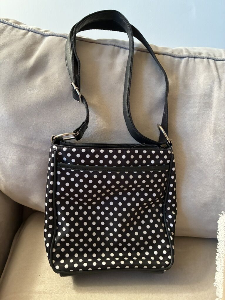 Cute, compact bag with lots of pockets. 3 zipper pockets on the front. Zipper top main compartment. Two snap closure pockets on each side of the main zipper compartment. One snap slit pocket on the back. Adjusted strap. One zipper pocket and two slit pocket inside. Freshly laundered.