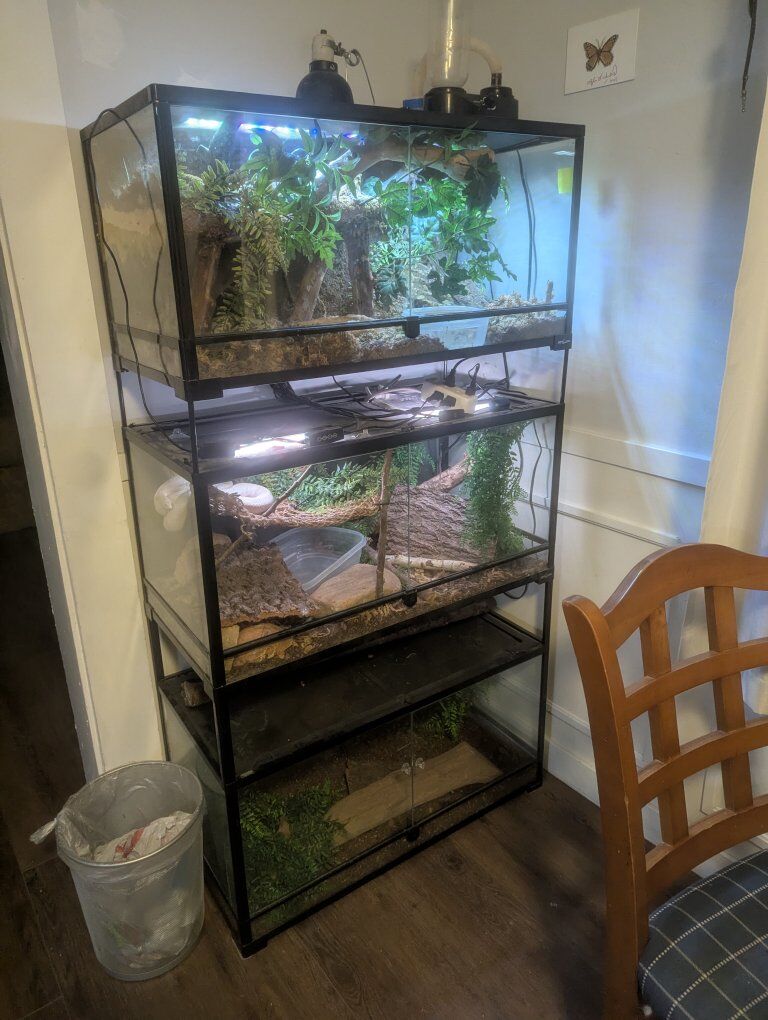 I have a three Tower snake enclosure setup. bought new for $700 and three beautiful snakes. a female python about 2 yo, A male corn snake about 4 and a female cornsmake about 2yo. they are all very friendly, never bitten, always eat. they don't mind being held, but can get cage aggressive on occasion. I really love these snakes but I am moving out of state and can't take them with. as far as I know they are all healthy, the male corn snake is slightly overweight. but no other issues that I know of. comes with the tanks, snakes, heat lamps and pads, lights, Mister, and everything else I have for them.