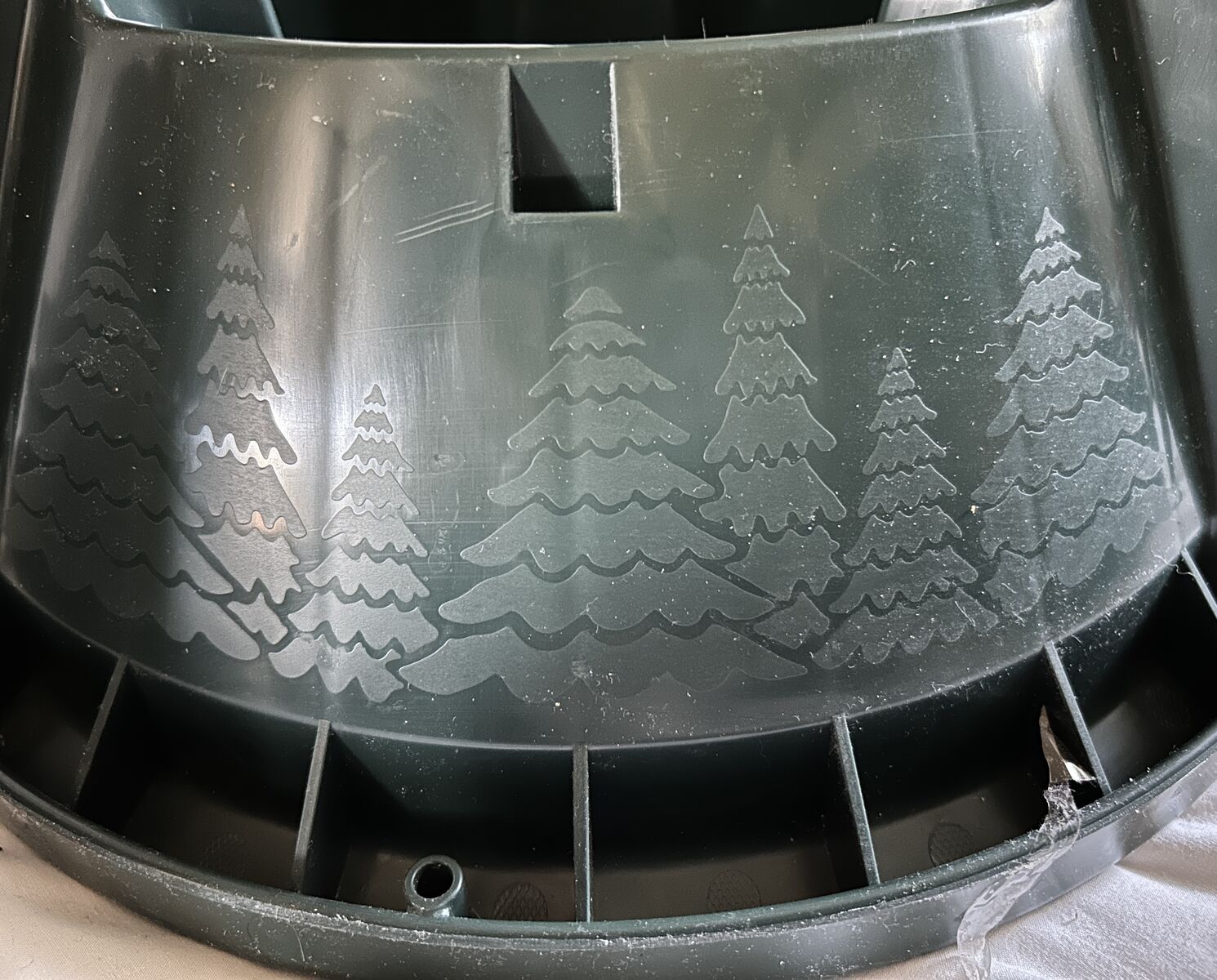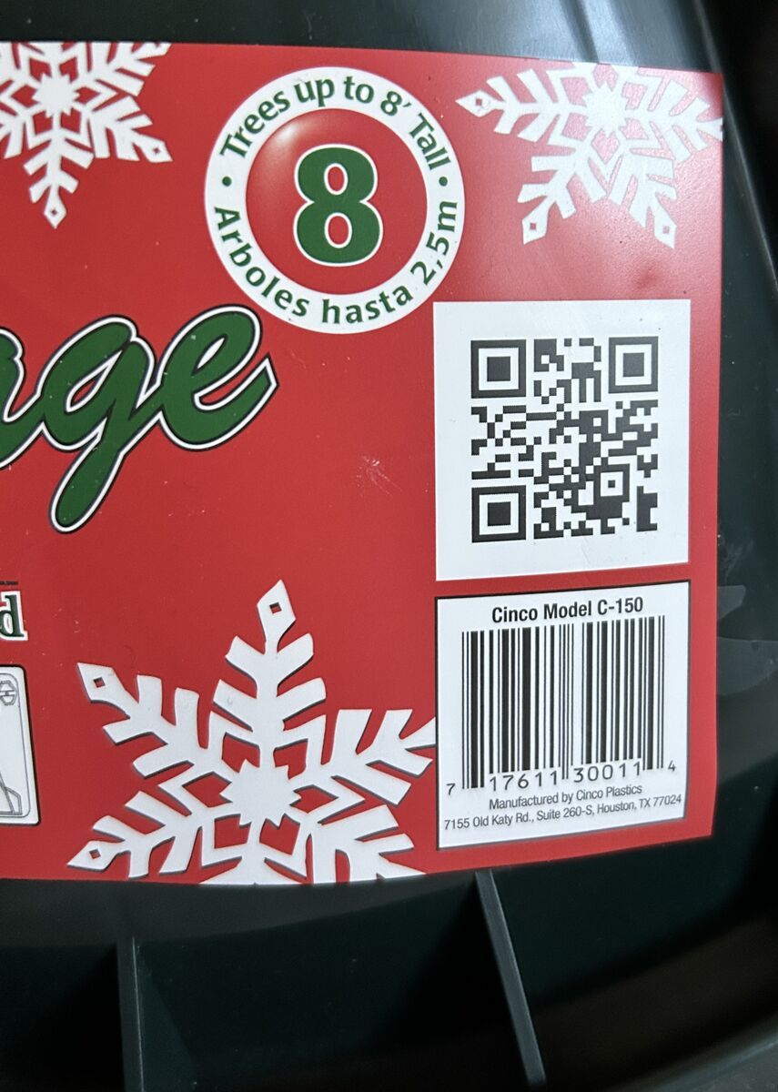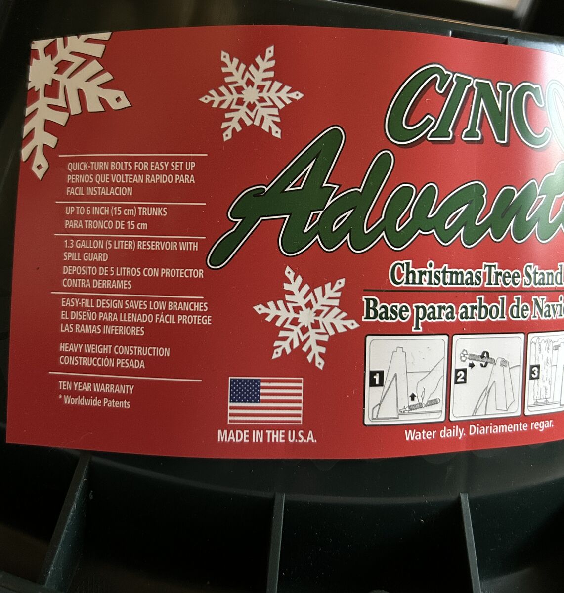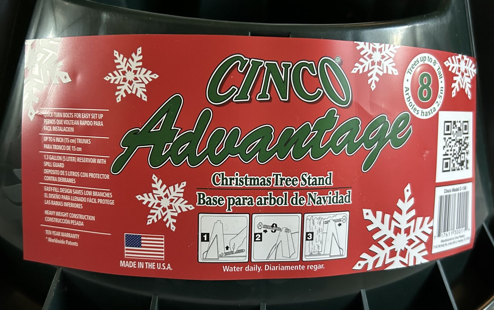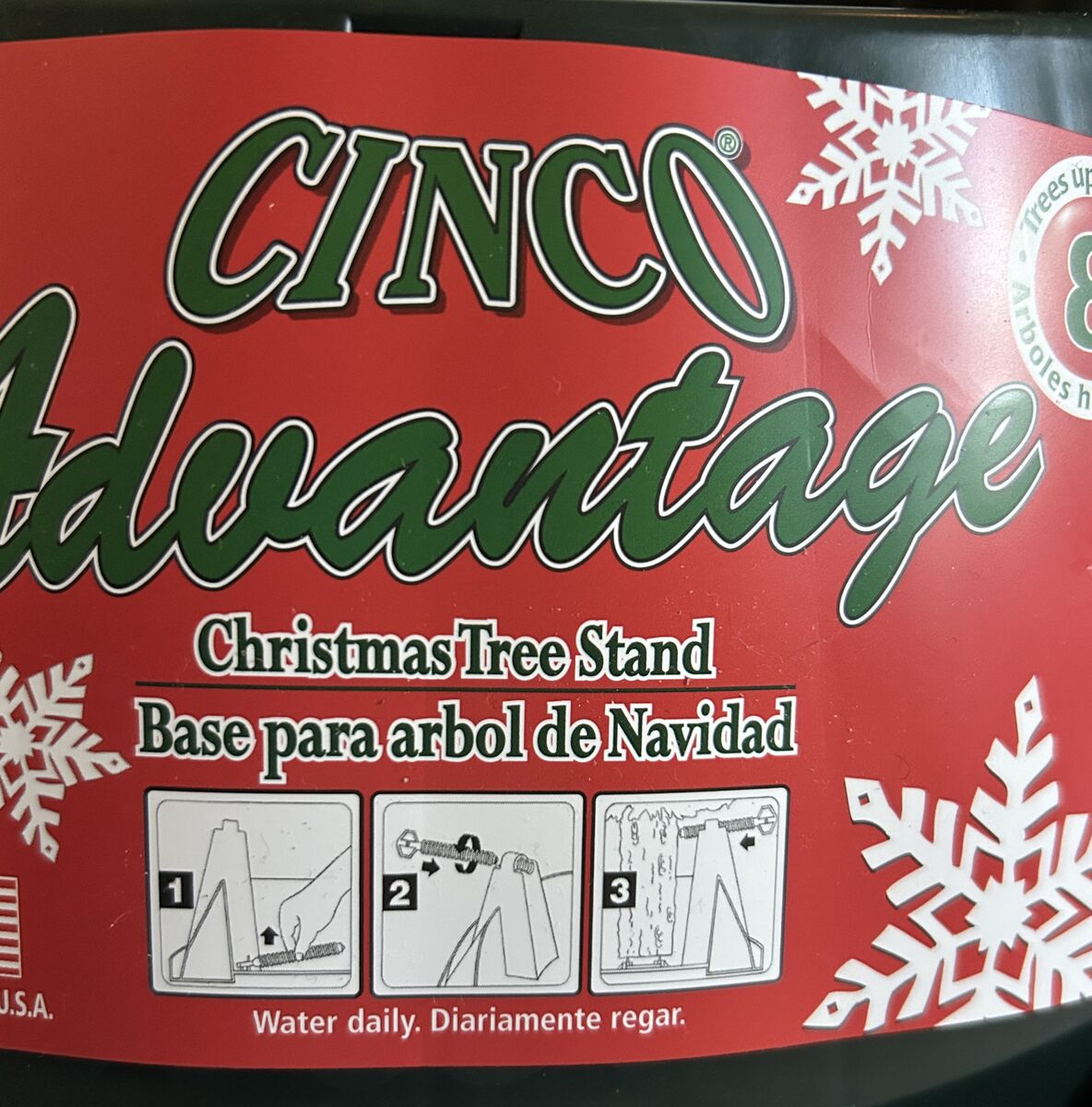 VenmoThis is a brand new Cinco Advantage Christmas Tree Stand for a tree up to 8 feet. It is a heavy duty injection-molded plastic stand and it has steel-core plastic bolts, a spill guard and reinforced screw holes. There are 3 strong galvanized pins in the center of the stand's base to help lock and centralize the tree before final adjustment. Christmas trees are embossed around the sides. Made in USA.