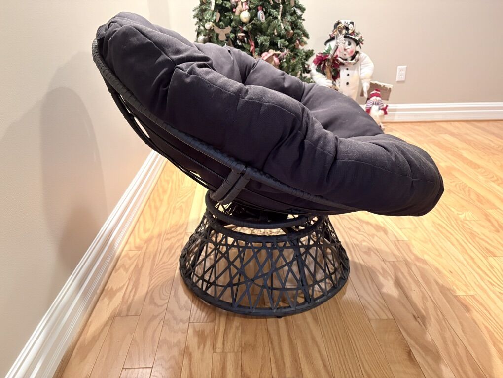 VenmoWicker Papasan Chair with 360 degree swivel. Brand new ($180) has just been sitting in the corner of the room Smoke free home The seat cushion is easy to remove dust and debris since it is tied on the frame by straps. Overall Size: 40” W x 36” D x 35.25” H; Seat Size: 40” Diameter x 4.5” T; Back Size: 40” W x 18” H x 4.5” T