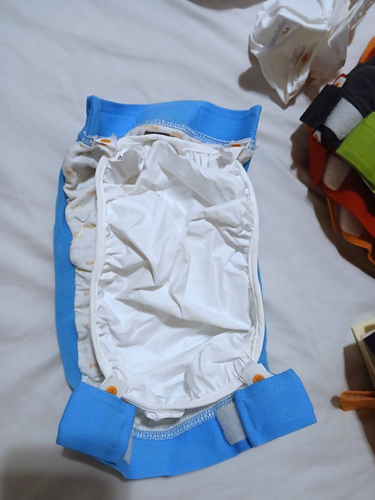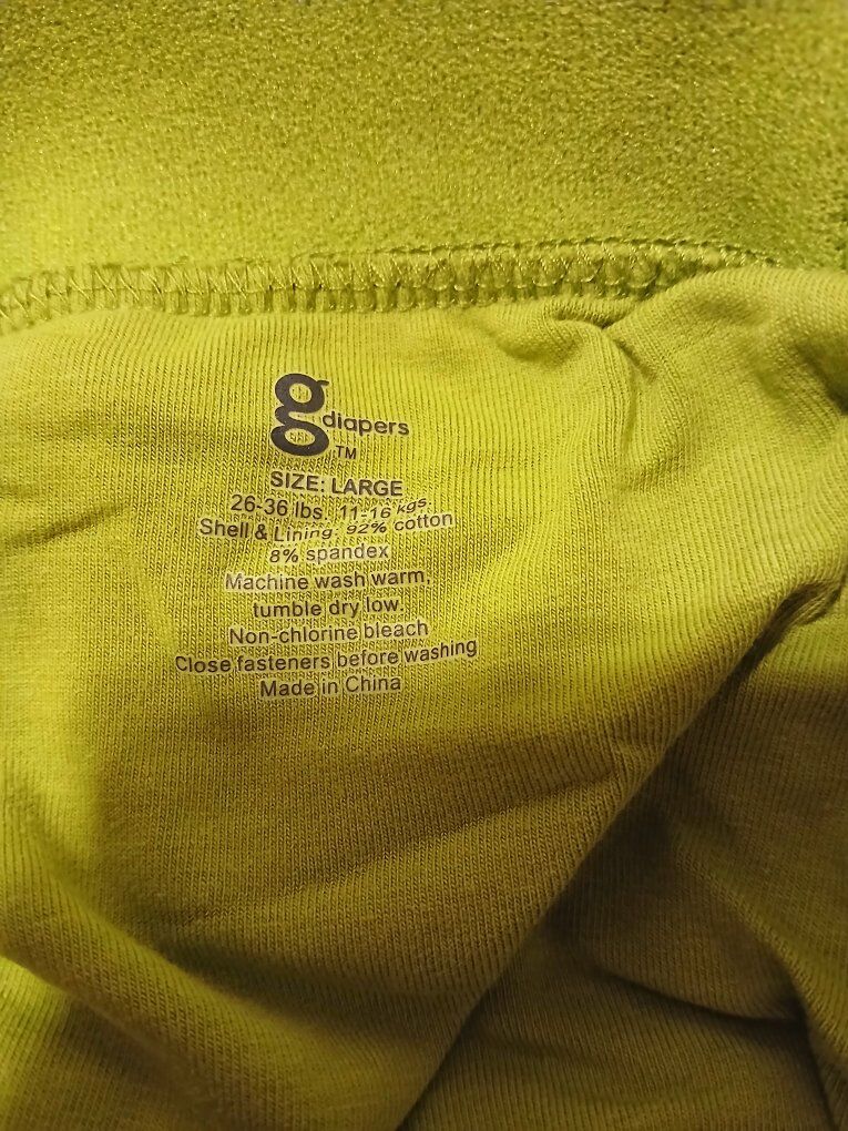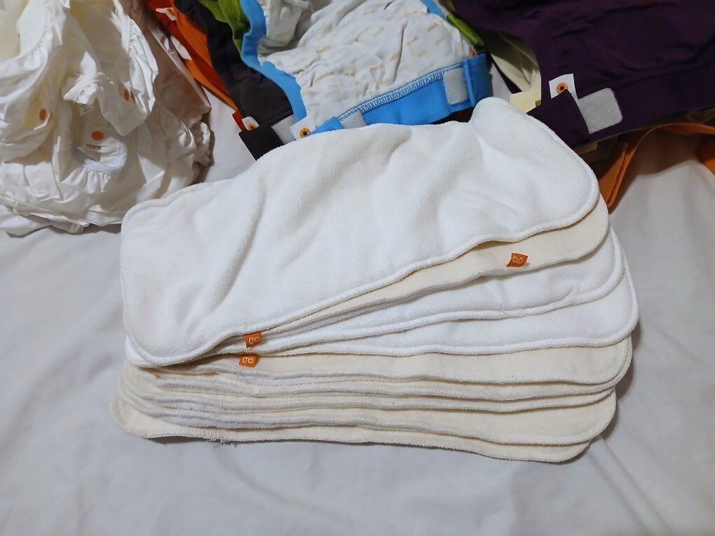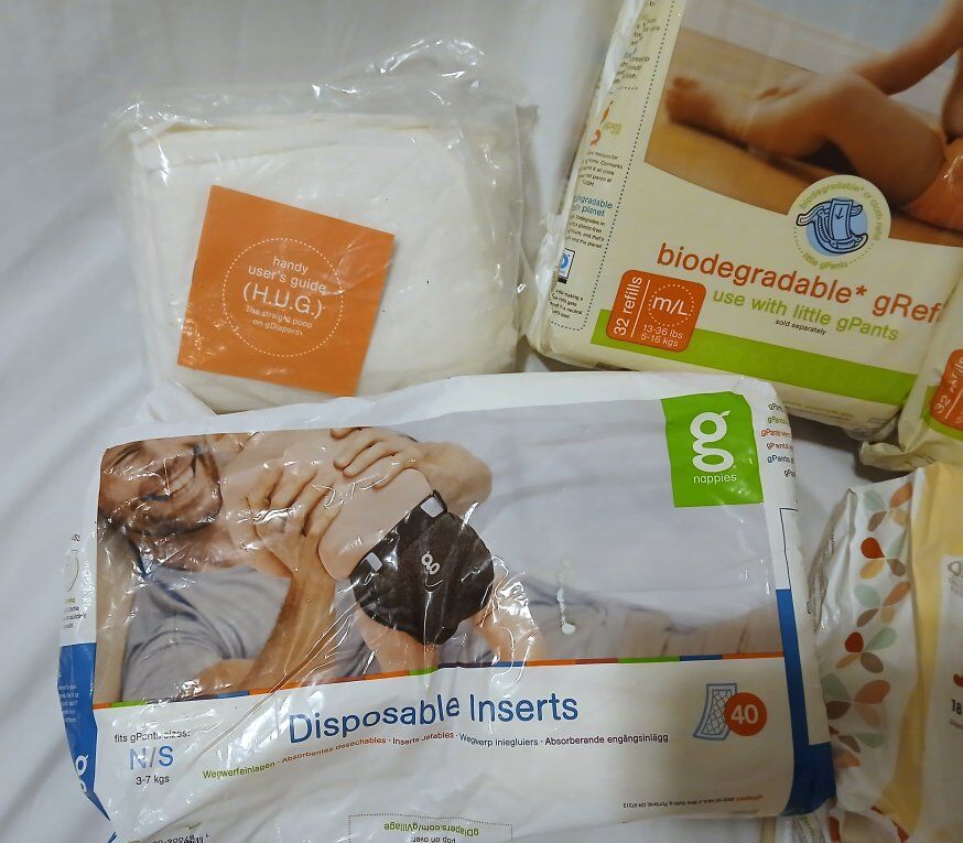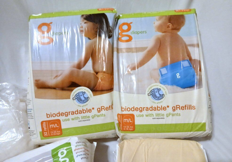 VenmoG cloth diapers. I got this set and never ended up using it, so I'm passing it on. Comes with: 10 large covers 11 medium covers 9 reusable cloth liners 26 snap in nylon liners to hold the cloth or disposable liners 1 wet bag 2 unopened packages of biodegradable liners, 32 in each 3 opened packages of disposable liners