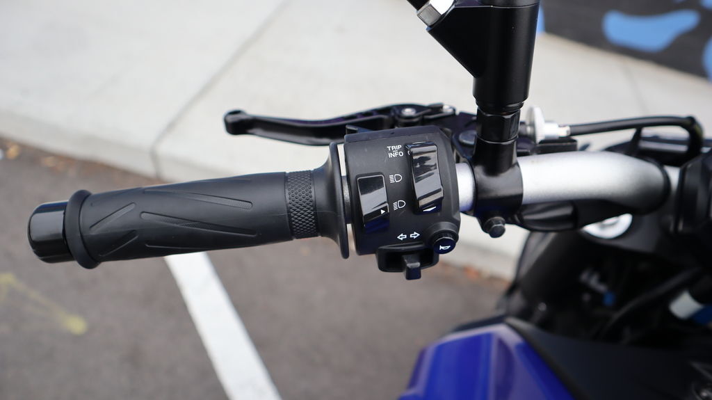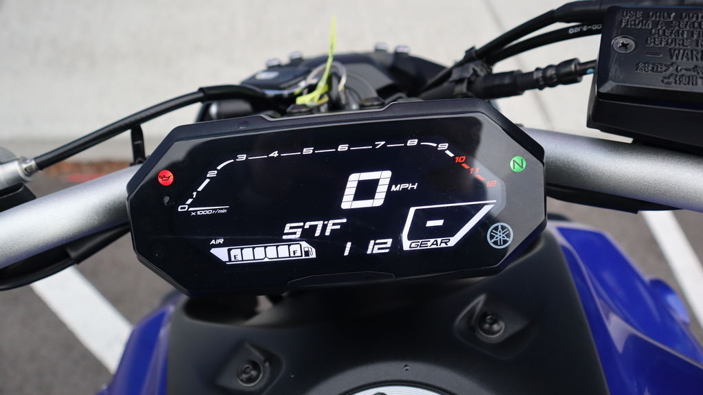 The multifunction negative-display LCD meter uses a black background with clear readouts for key info like gear position, clock, trip and odometer data, and tachometer display. The MT-07’s next-generation Hyper Naked design keeps the bike looking tight, compact, and aggressive, emphasizing the MT family’s signature torque-first attitude.