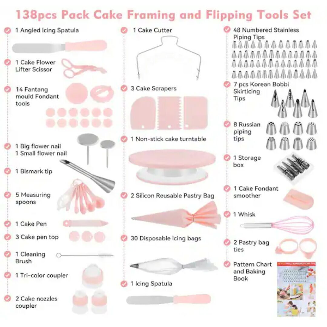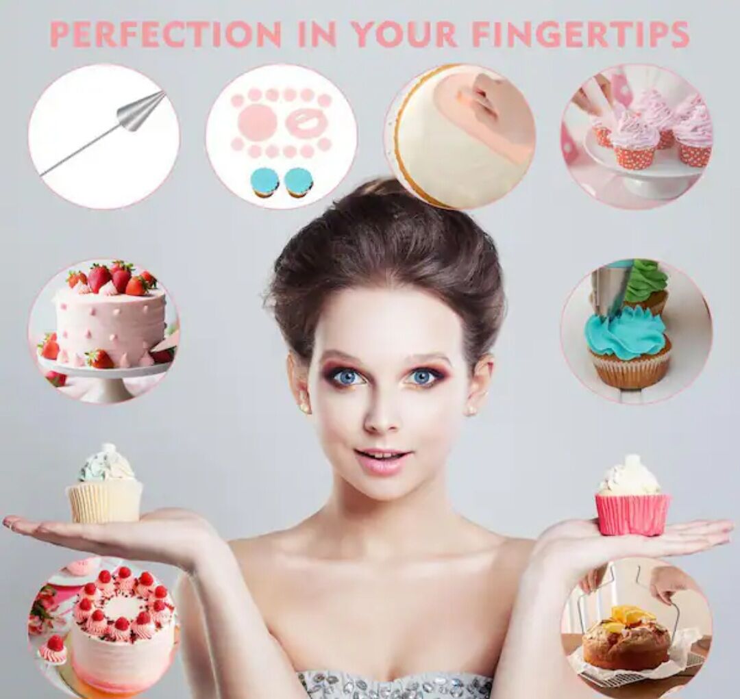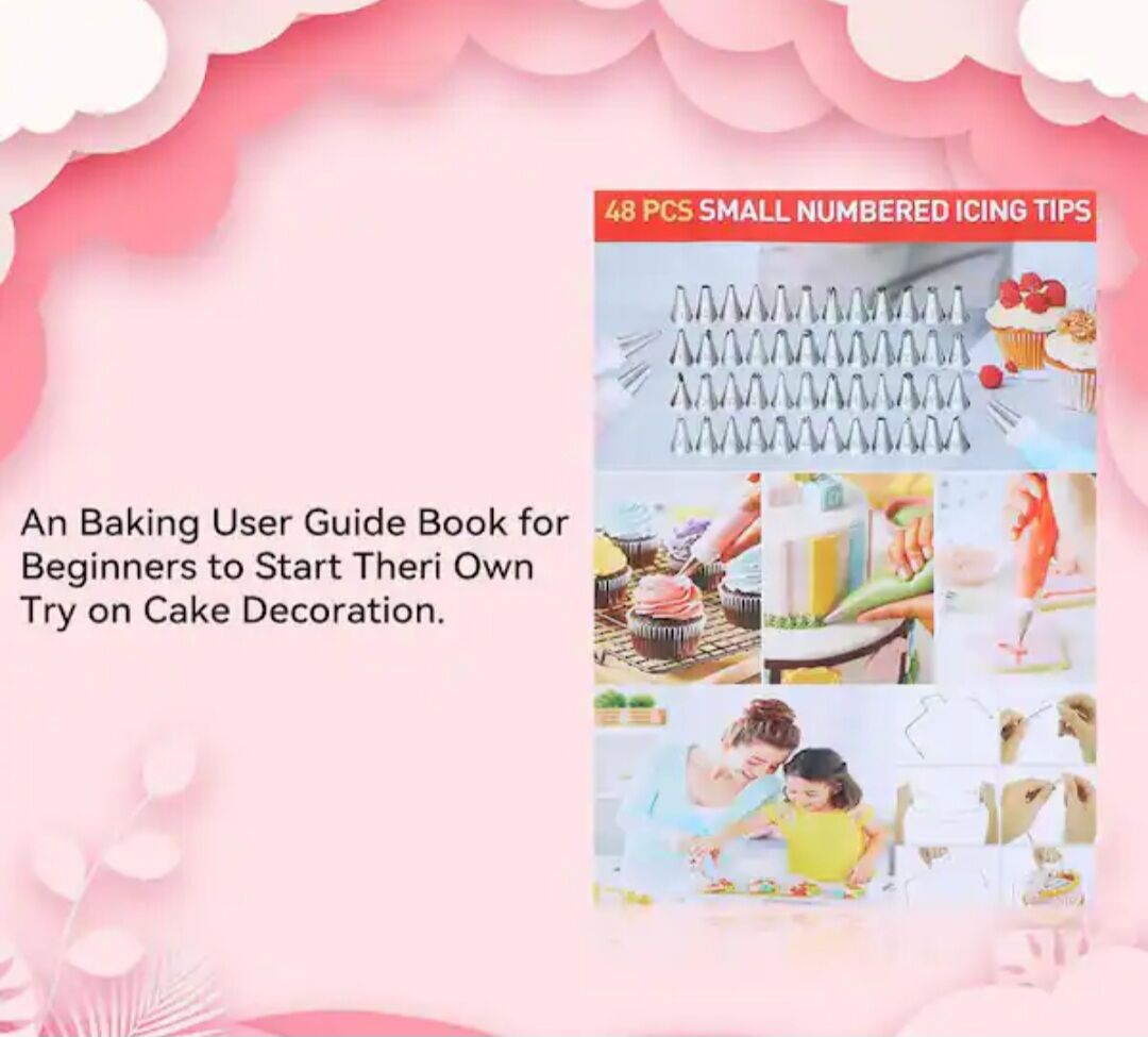 VenmoNever used and new!! Pattern Chart and E - Book: This cake decorating kit is suitable for all ages and skill levels. It comes with numbered piping tips and a pattern chart, making tip selection easy. The e - book user guide includes four levels of cake decorating, methods of cake baking, leveling, and icing, three frosting recipes, and a step - by - step guide for using icing.
