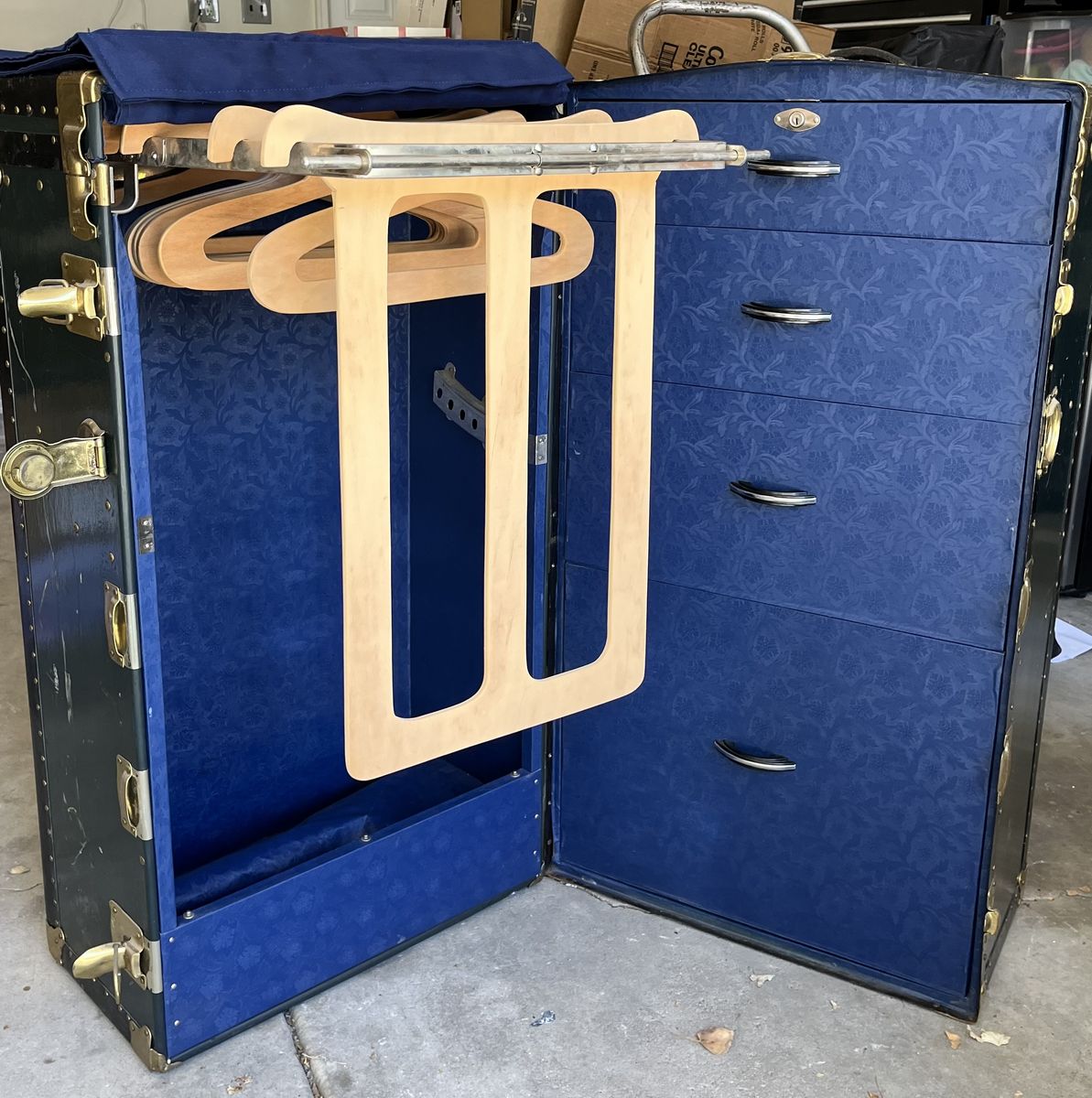 PayPalHuge luggage trunk. Interior is in excellent conditio. scratches on the exterior. Drawers all working. seperate Section for hanging clothes and shoes. Beautiful to display your treasures and collectible.