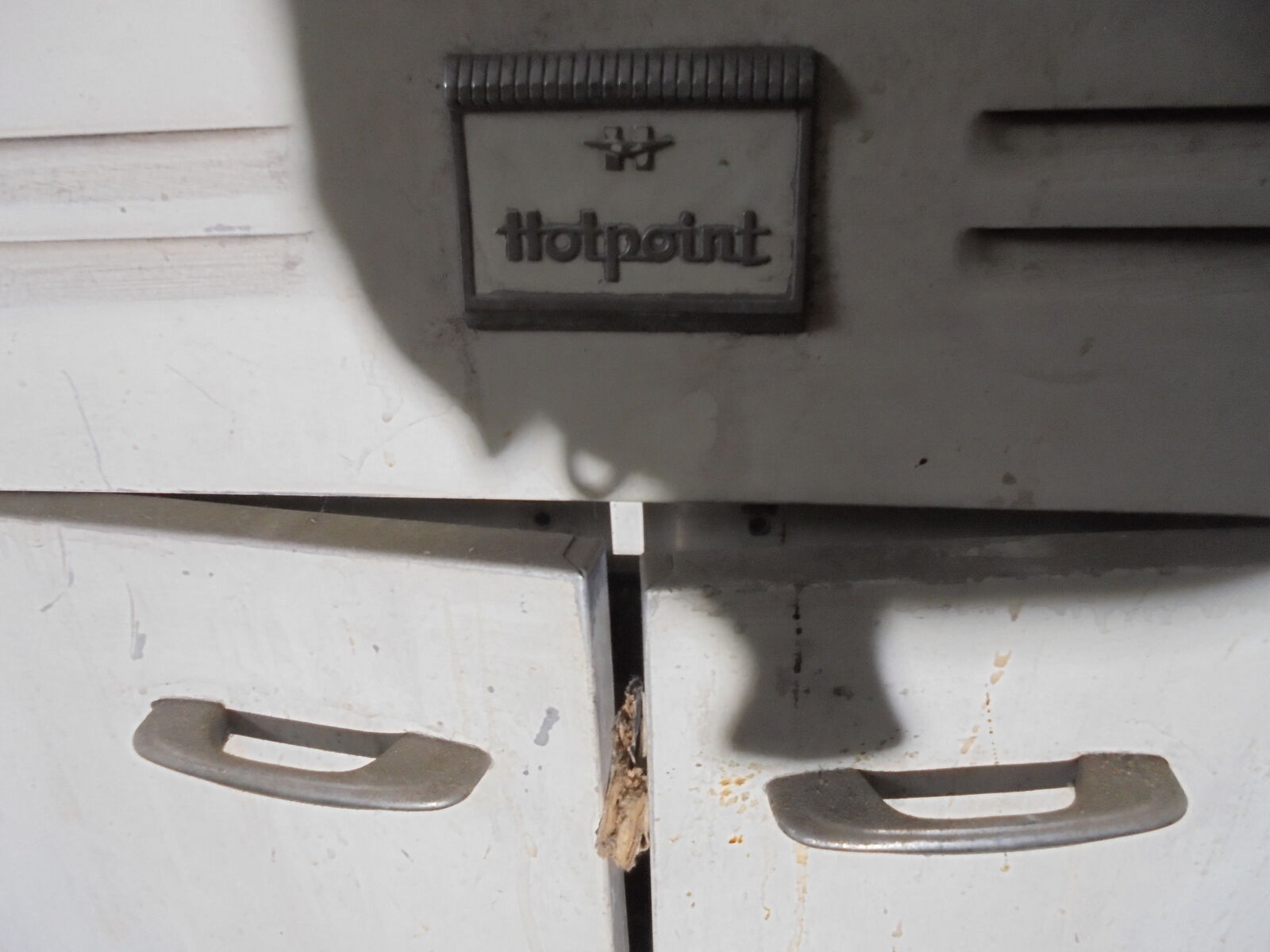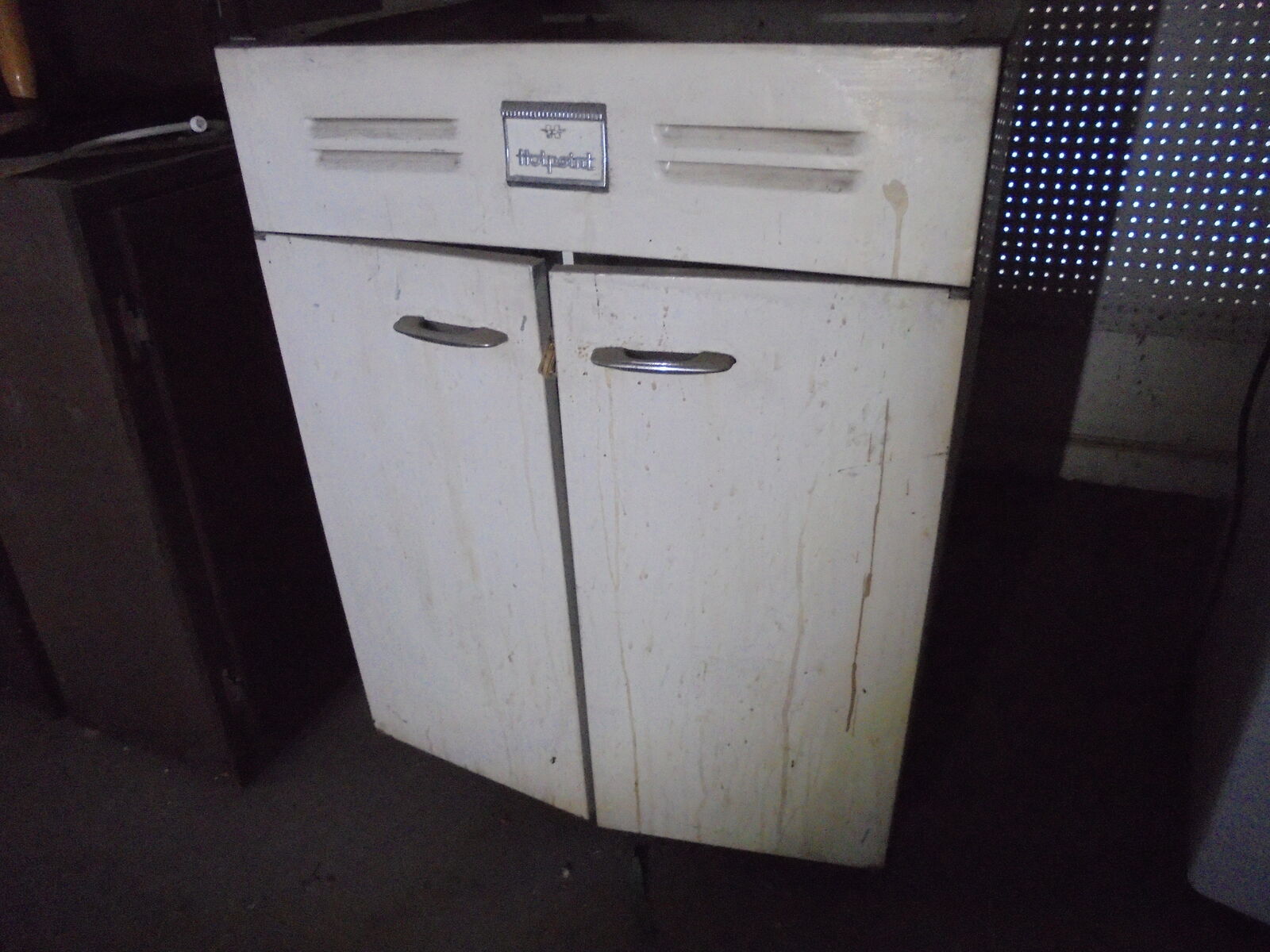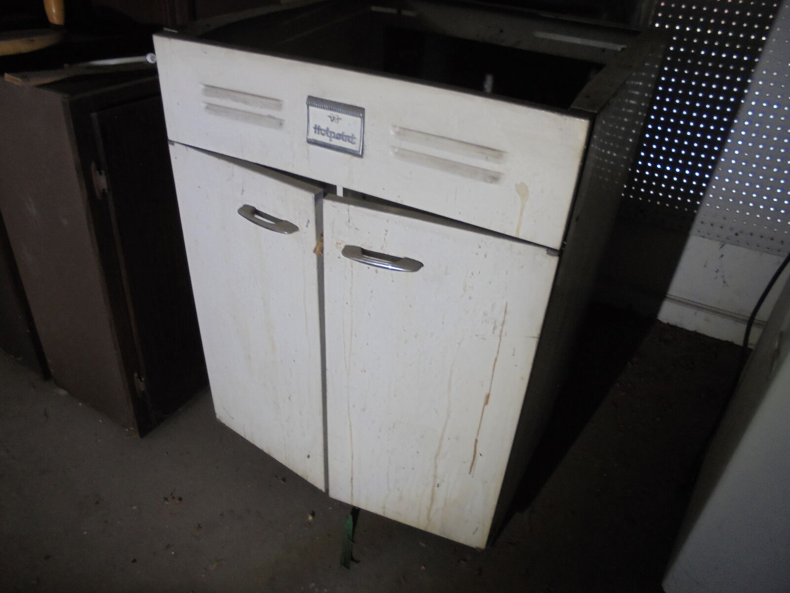 VenmoThhs is a vintage Hotpoint metal kitchen sink base cabinet in really pretty great shape. It needs a good cleaning, and a catch for the doors, but I think the enamel is in pretty nice shape, and the metal is not dinged up, straight, and could look very nice. The hotpoint badge and the top front louvered vents are pretty nice as well. Handles are tight & in good shape.