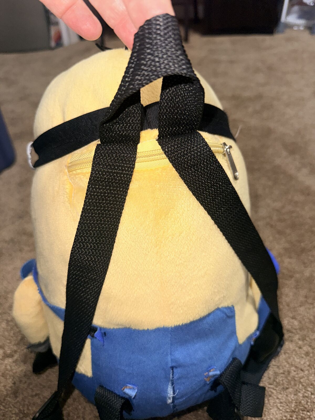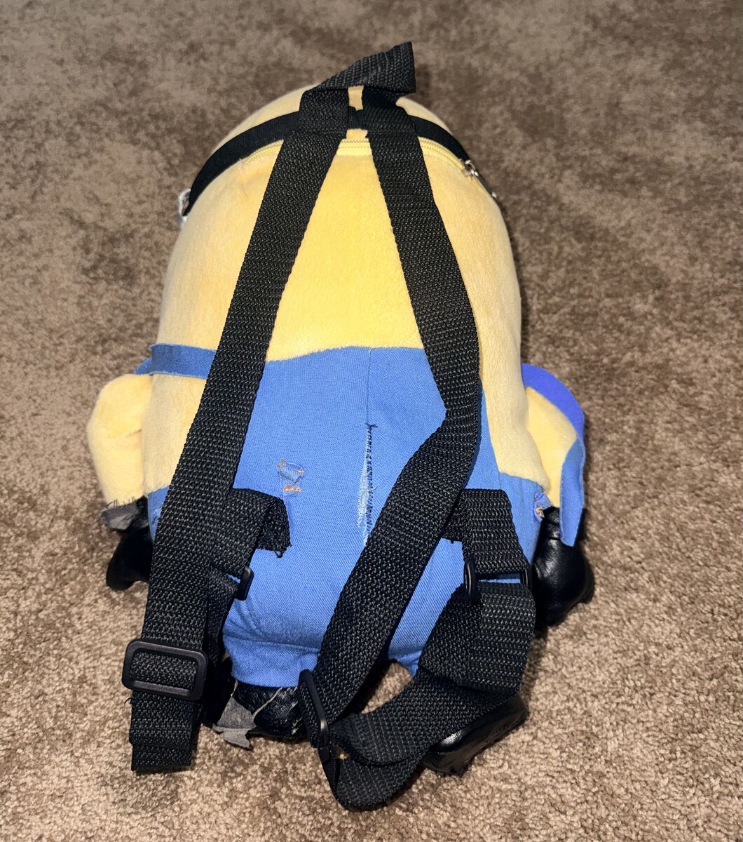 VenmoThis is a Despicable Me 2 Minions Plush Backpack 17” long. It has a small zipper Pocket on the back and Adjustable Straps. It is in used condition. See pictures. It is clean just some of the straps have come off for the jeans but you could stitch them back on. And on the back the stretch pulled apart so you can see that to. Not sure why my daughter mostly just had it sit on a shelf in her room.