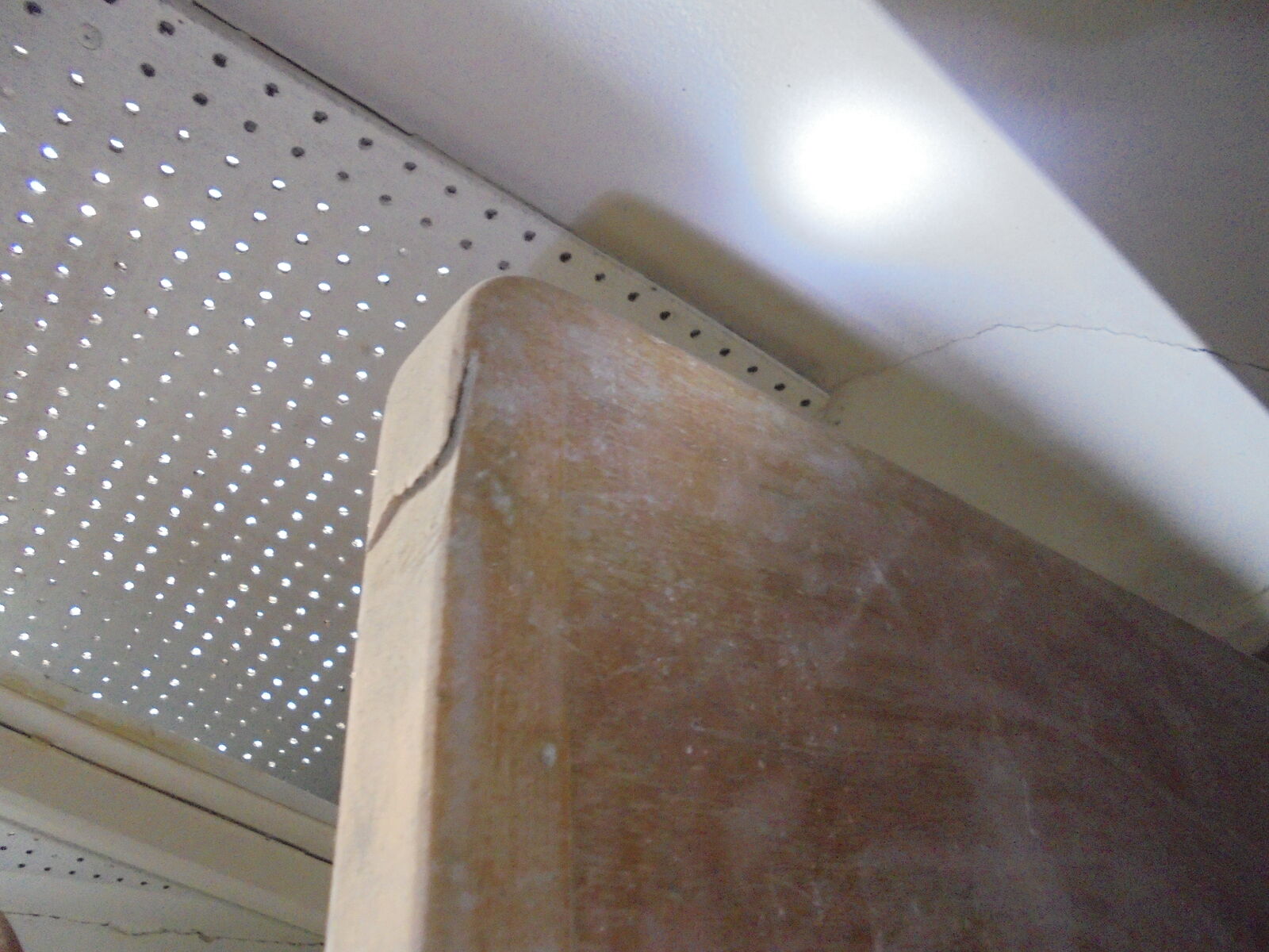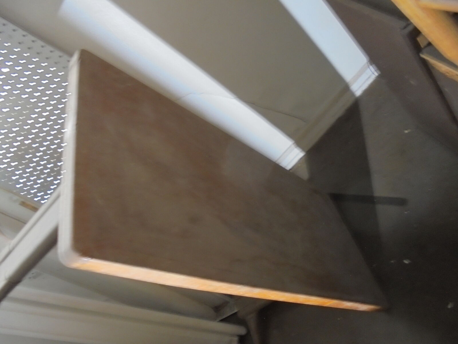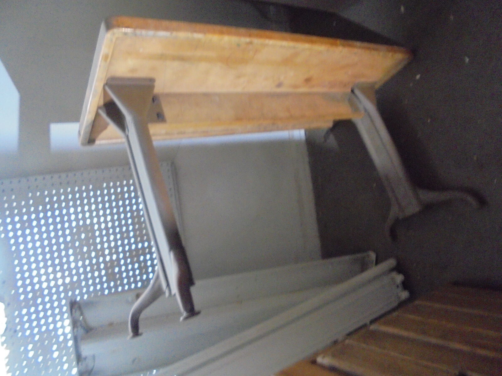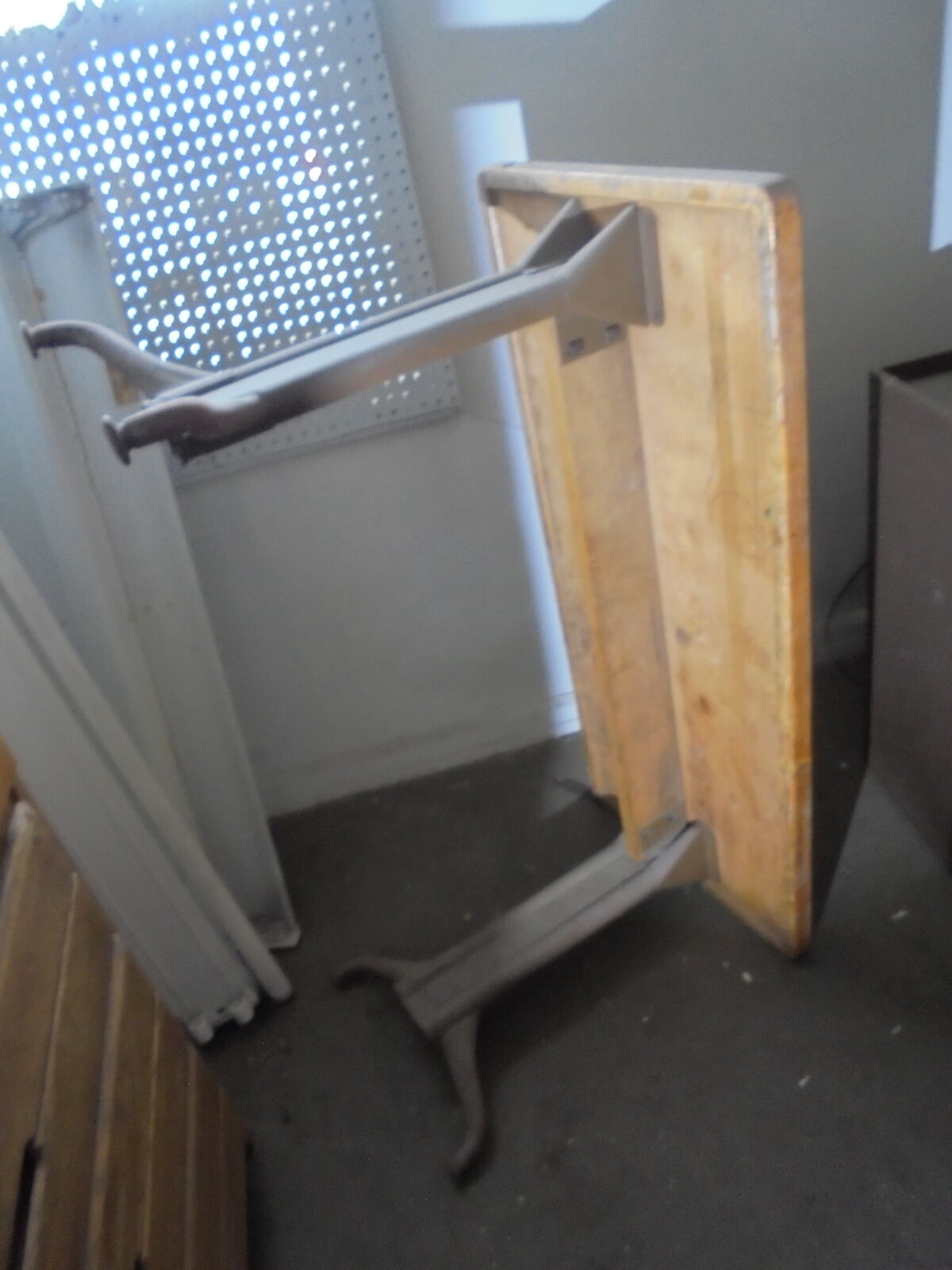 Metal legs with adjustable feet. Top wood surface is in good shape, but a quick sand and a coat of varnish wouldnt hurt. *There is one little spot near a corner that looks like someone nicked it with a circular saw at some point (shown in the last photo), but a little wood filler, and it would be un-noticeable. other than that, it's in overall good shape