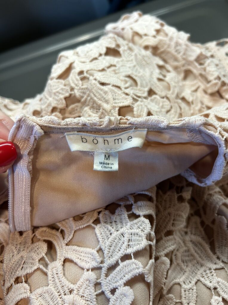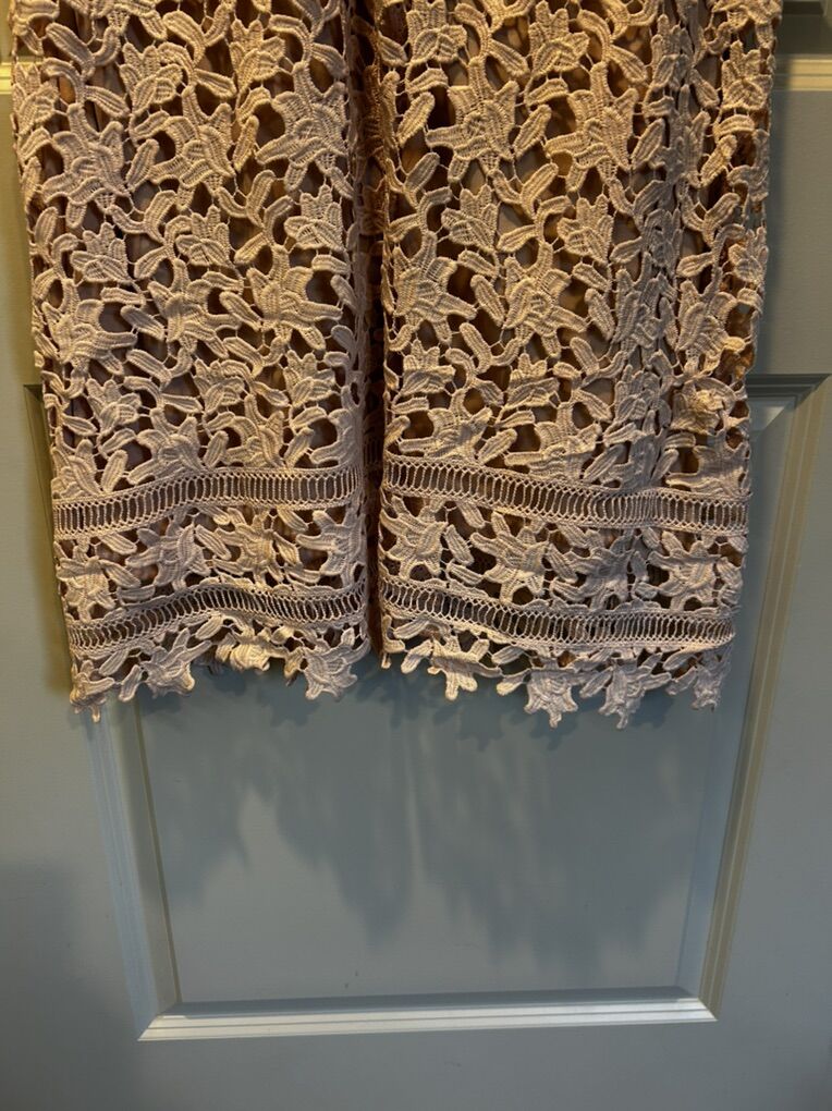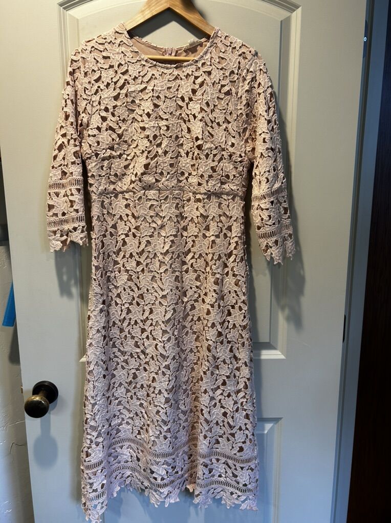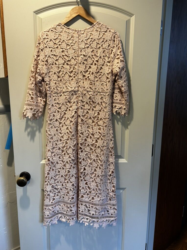 VenmoAn excellent like new condition lace appliqué in light pink blush color dress in women’s size medium. Just passed knee length fully lined three-quarter length sleeves. Extremely flattering, perfect for special events, mother of the bride, bridesmaid, seasonal, school dances and religious meetings. Figure flattering fit clean smoke free. Cash or Venmo. Pick up in Alpine.