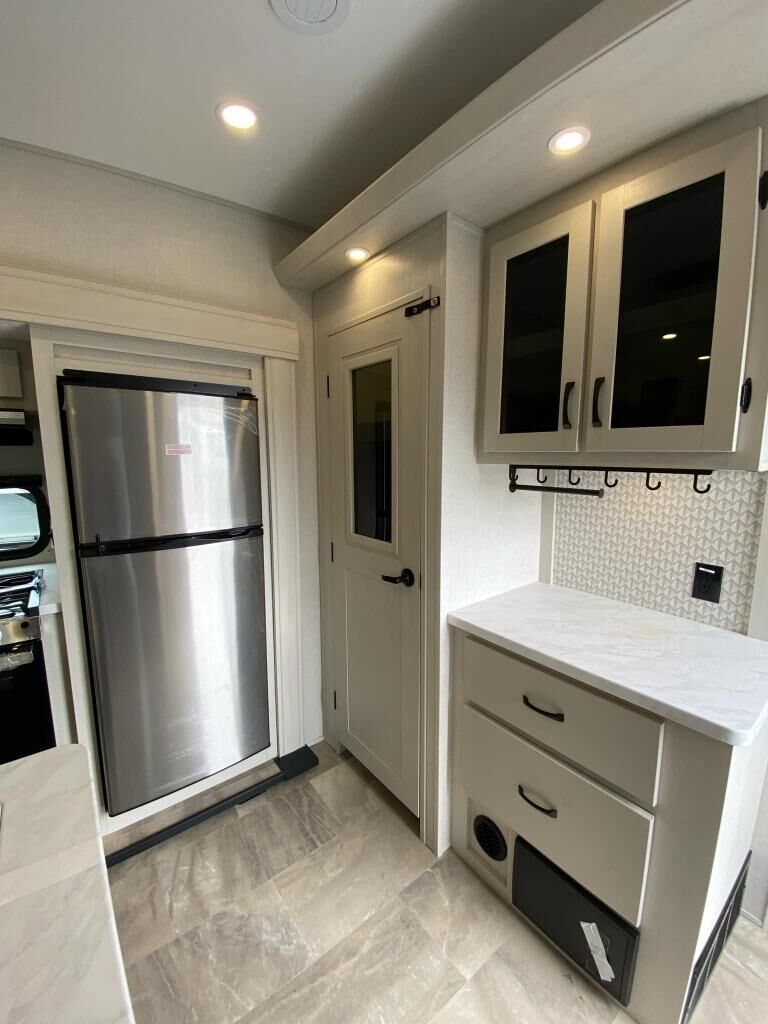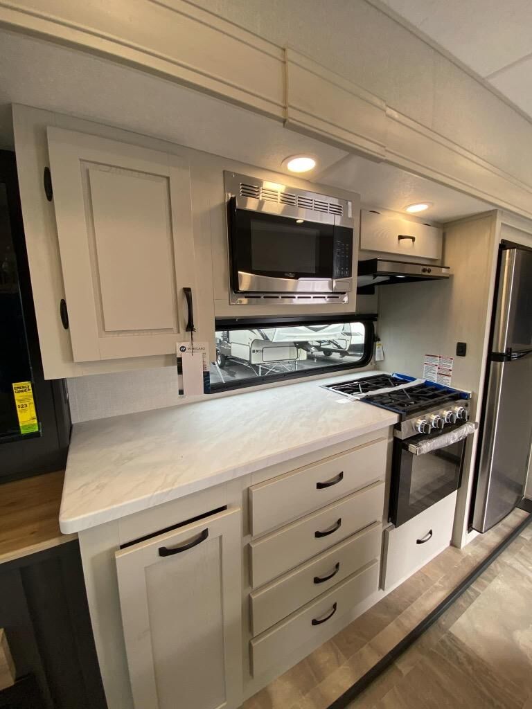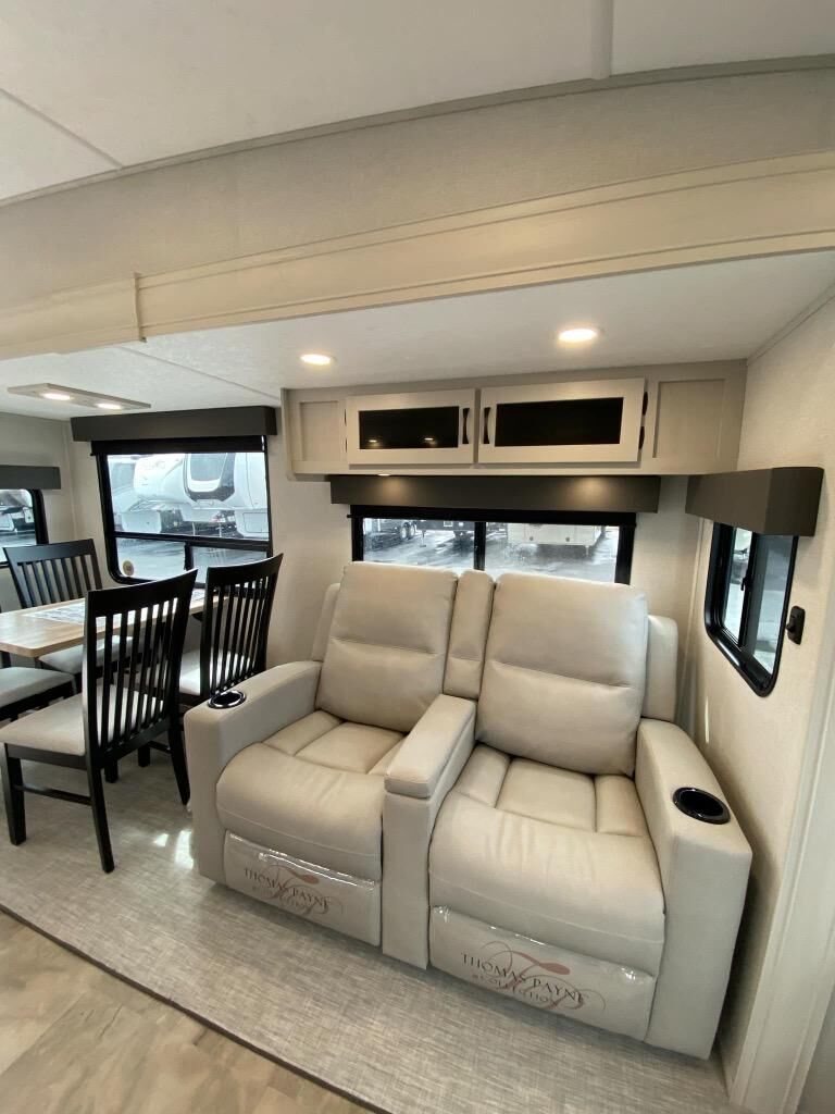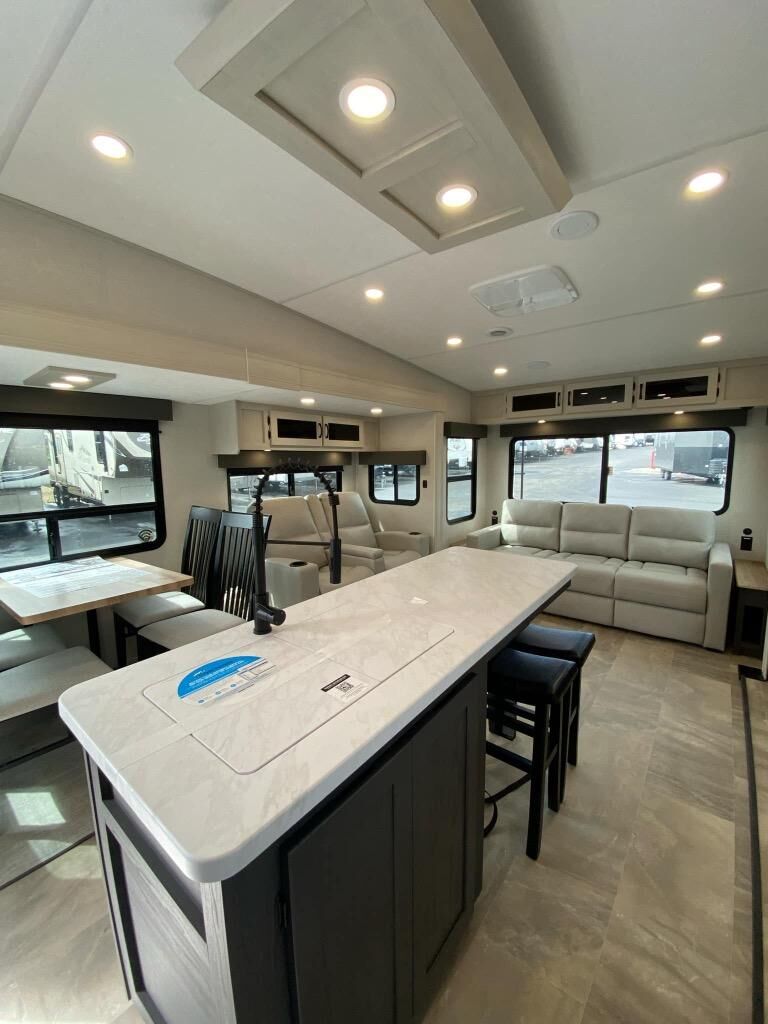 Are you wanting to trade out your busy work weeks for relaxing vacations? This fifth wheel can give you just that! Once you arrive at your destination, set up the 16' power awning with LED lights and enjoy some fresh air before you unpack your bags. The chef can start lunch on the GE Profile 21" oven with a residential cooktop, and there is an island with two barstools if the little ones want to color while they wait on their food. This model also includes a large pantry plus extra counter space with overhead storage for dishes. Everyone can take turns cleaning up in the full bath that includes a spacious shower with a seat and a linen closet to keep clean towels close by. When it's time to call it a night, you'll enjoy the king bed slide out in the front bedroom, while your guests take the rear tri-fold hide-a-bed sofa!