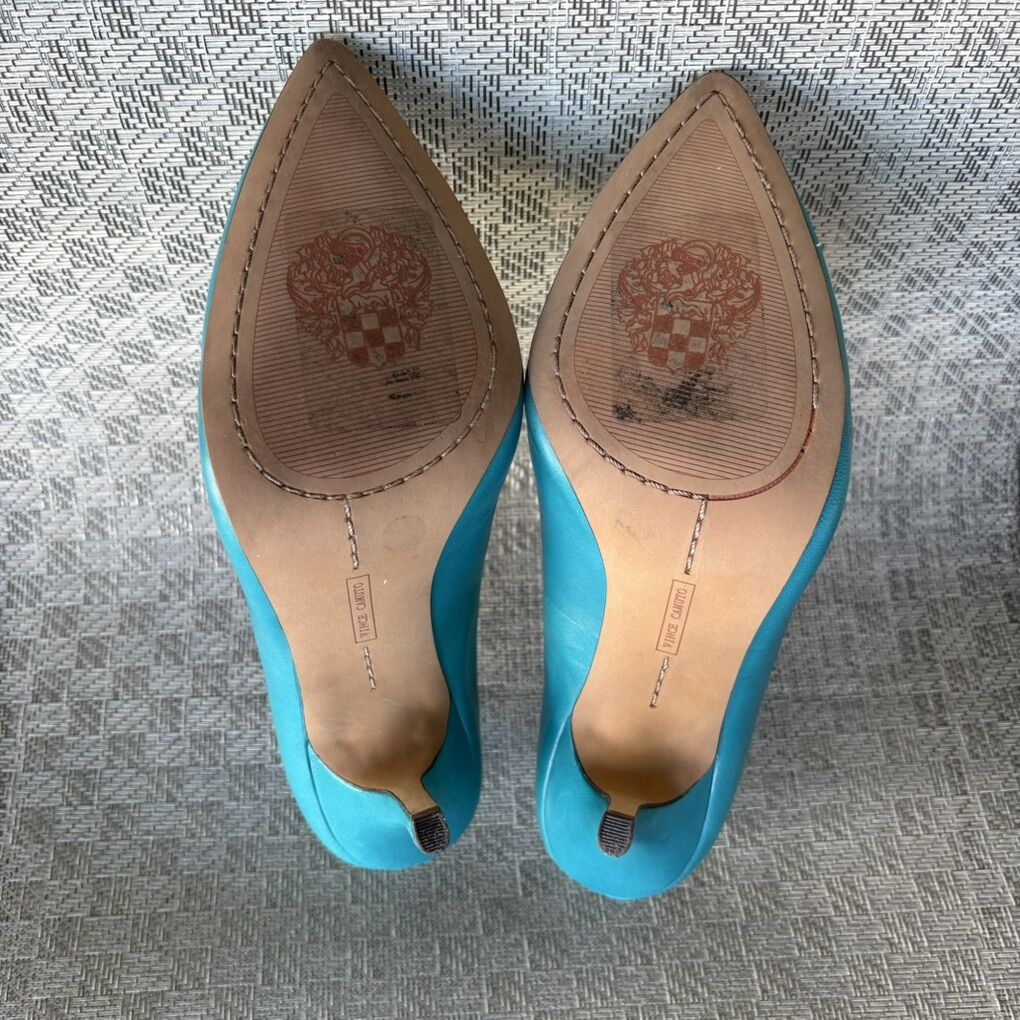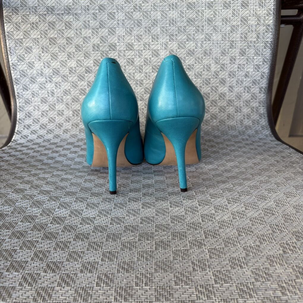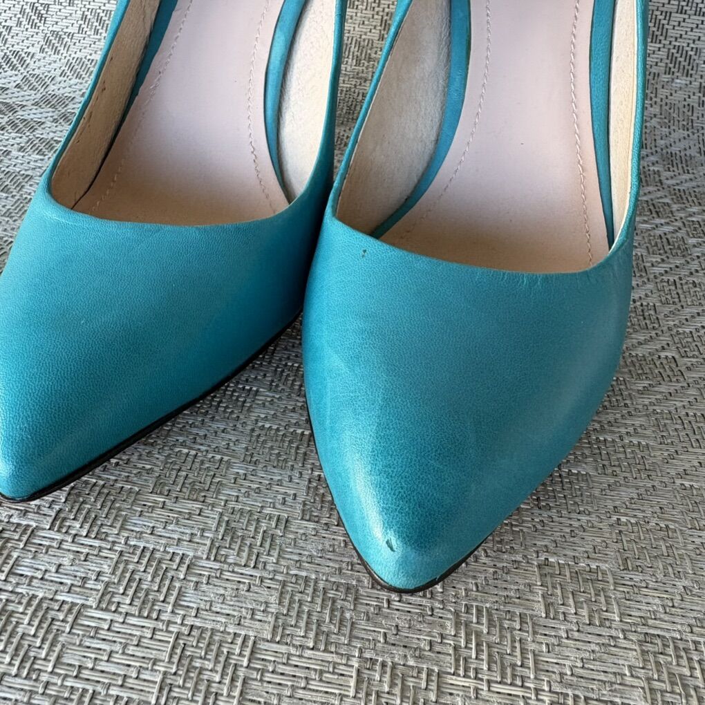 Preloved, inside tow area has where, outer shoe looks great Color: turquoise Leather upper Leather lining Pointed toe Stiletto heel Size 8 1/2