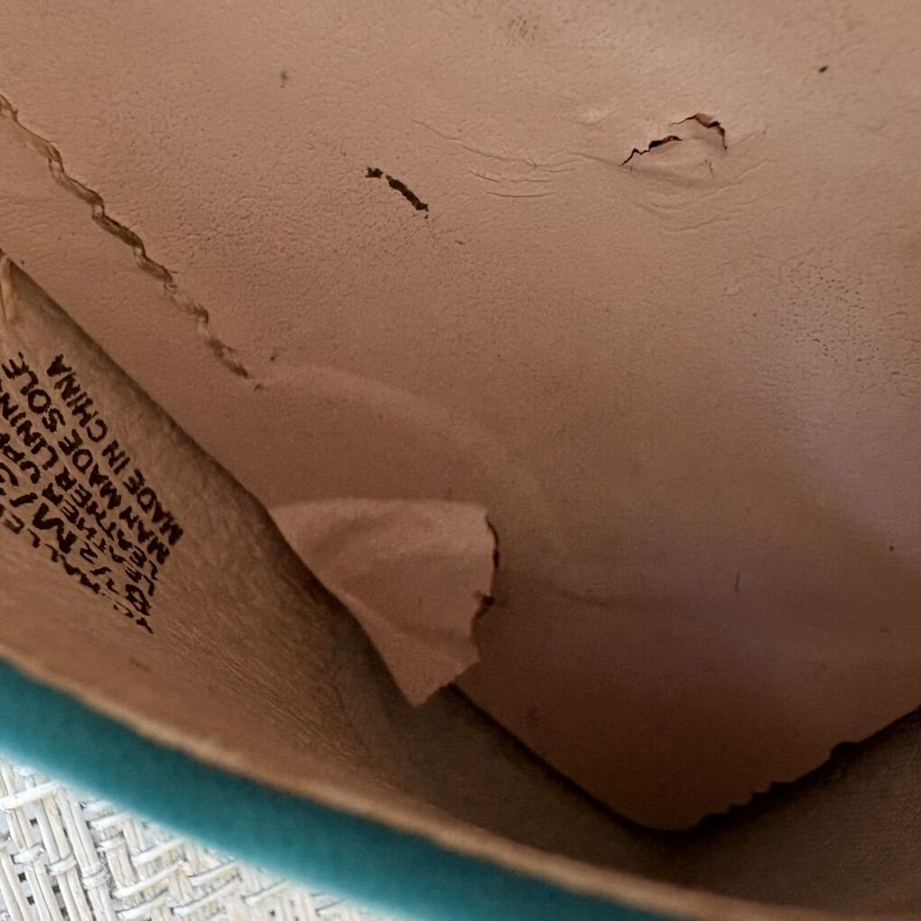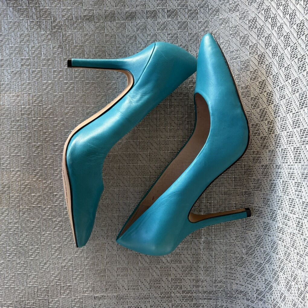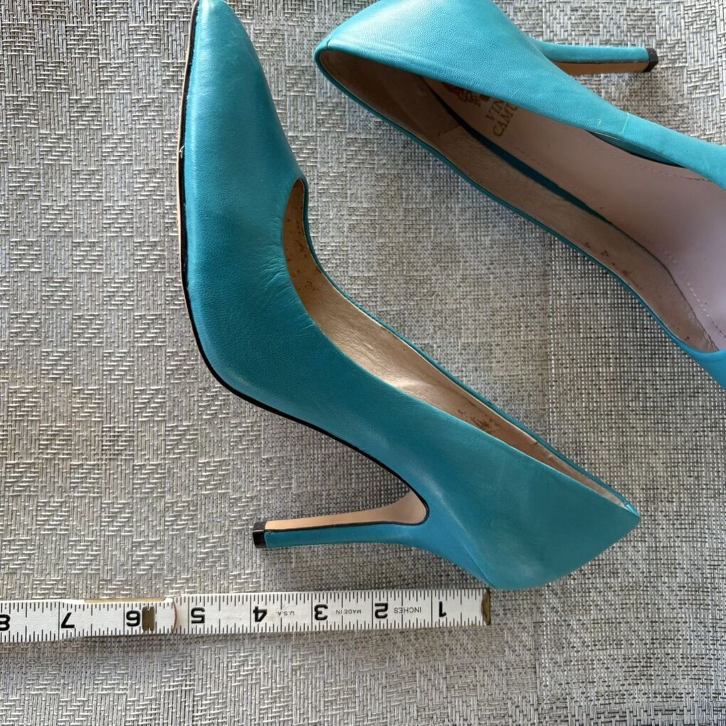 Preloved, inside tow area has where, outer shoe looks great Color: turquoise Leather upper Leather lining Pointed toe Stiletto heel Size 8 1/2