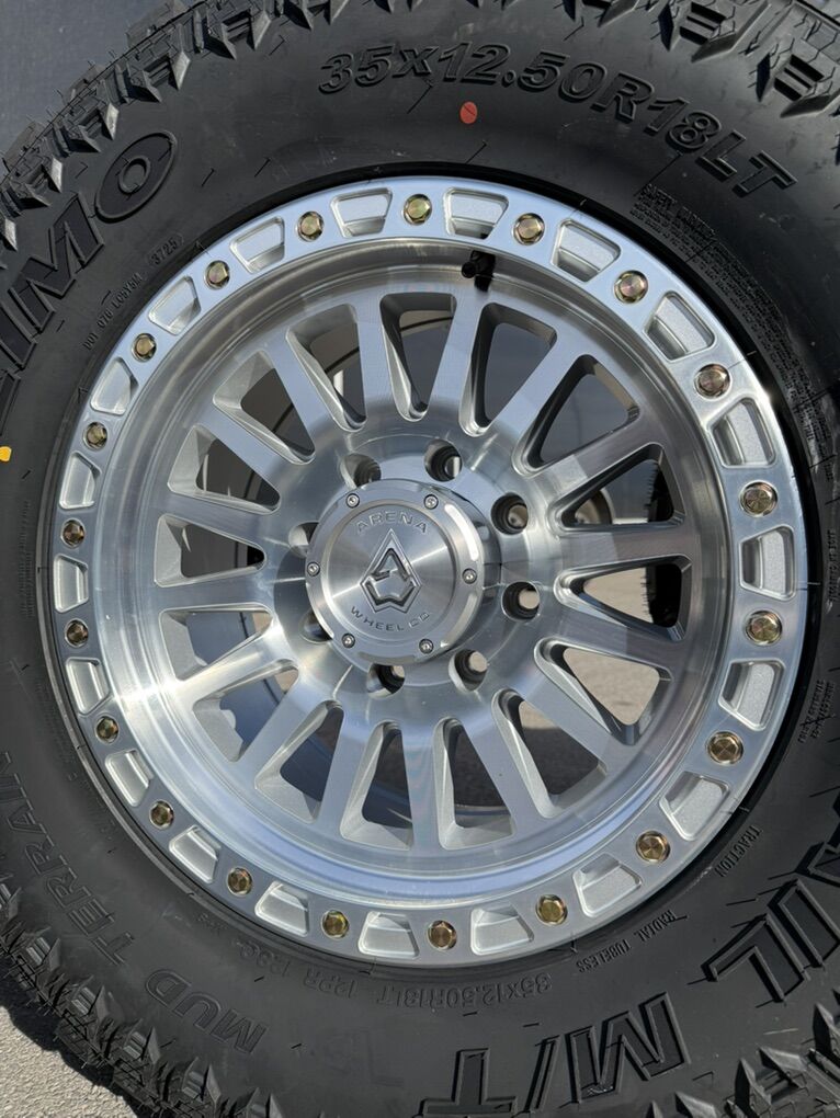 Wheels are 18x9 arena Offroad trophys, 0 offset, machined super polished finish, brushed center caps, very very nice wheels. Tires are 35x12.50r18 prevail m/t tires, load range F, 12ply, very quiet, amazing performing tires.