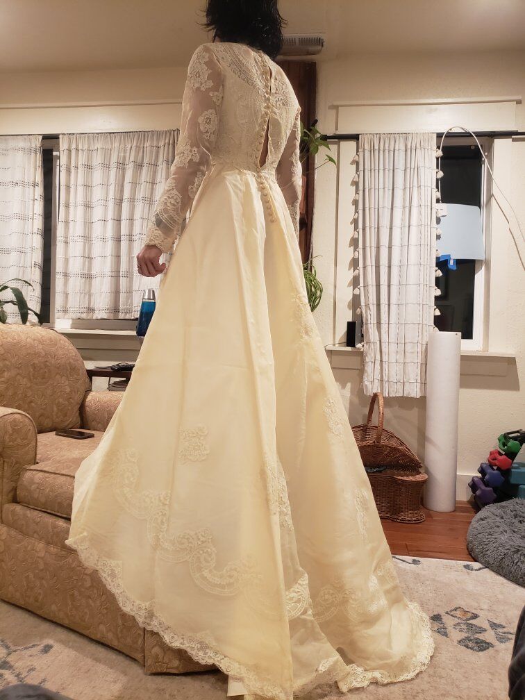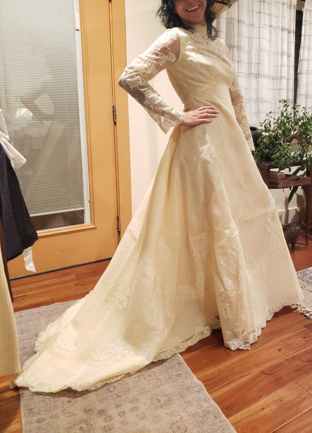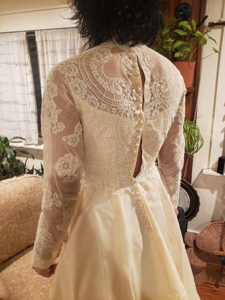 dress has been stored clean in its box for 47 years and is looking for new life. Beautiful lace, intact zipper and buttons