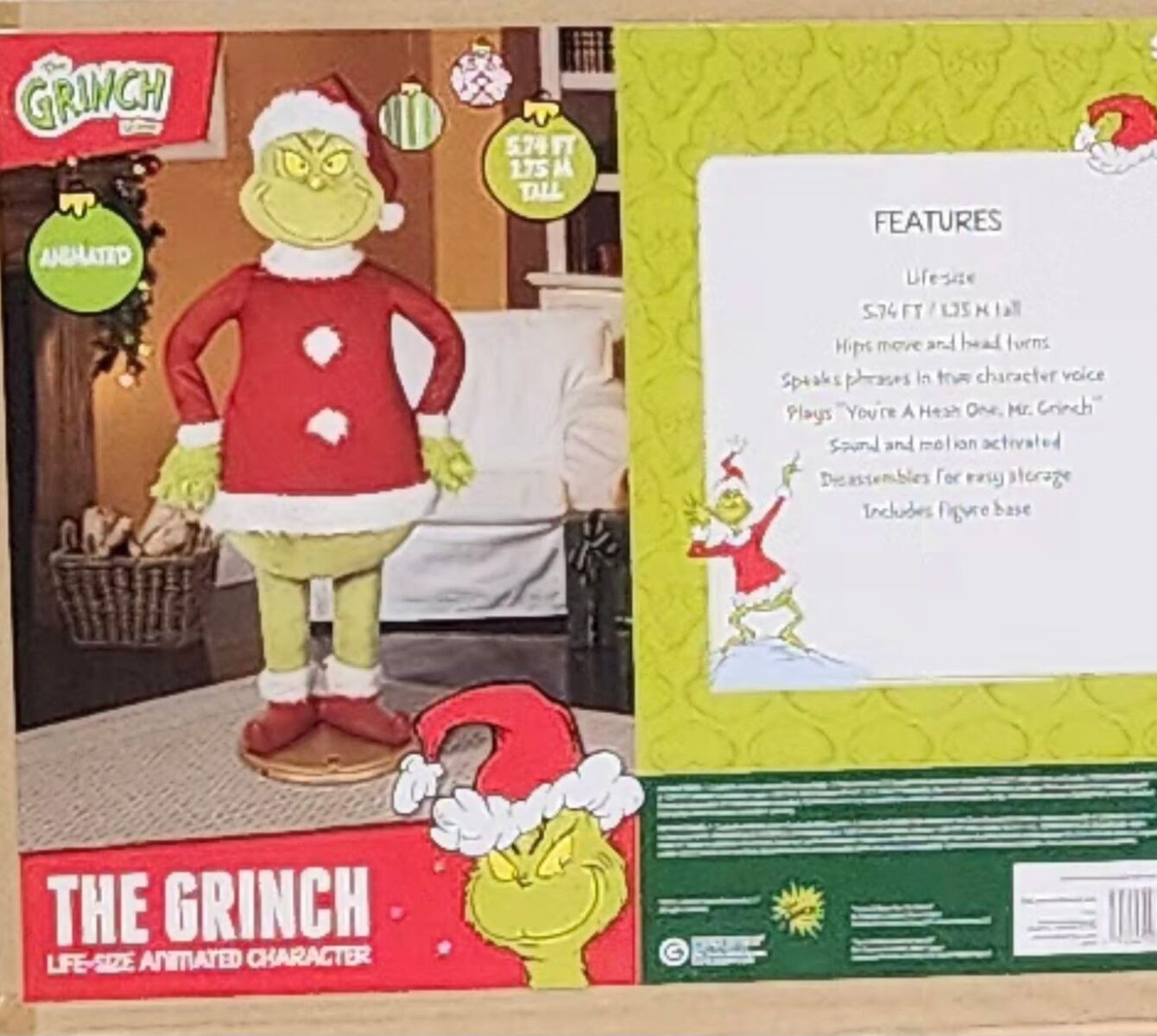 Animated, life size Grinch, 5'8" tall. Brand new, in box, unopened. It's motion and sound activated, and says phrases.