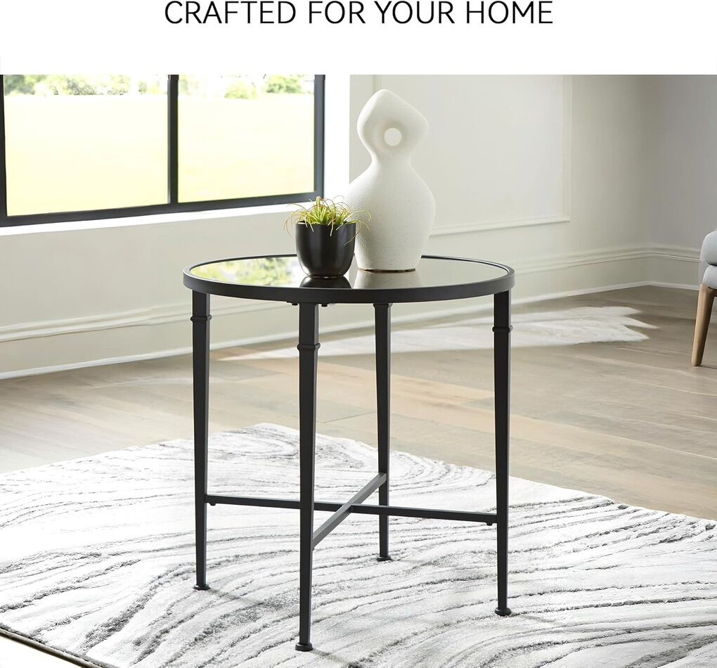 New in Box!!! Pair your sofa or armchair with this accent table. The round frame houses an antiqued mirrored top for a touch of glamour and finesse. This table's open concept exudes a sense of luxury