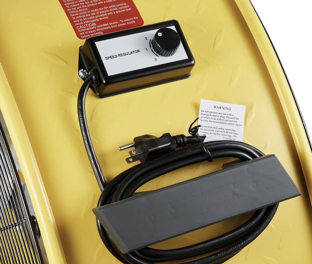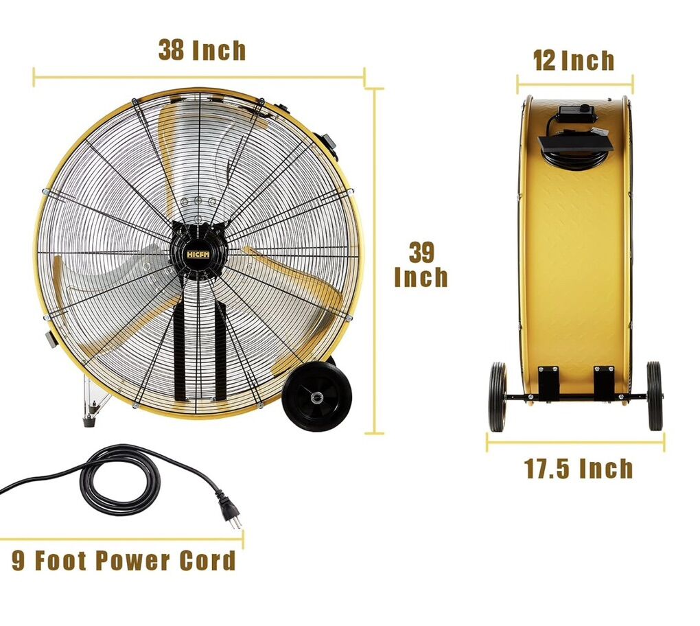 Top highlights Brand HiCFM Color Yellow Electric fan design Floor Fan Power Source ac Style 36 Industrial Barrel Fan Product Dimensions 38D x 17.5W x 39H High Velocity Air Flow - The floor fan is equited with a 4/5 HP Powerful motor and 2 level air delivery setting (Low 18100 CFM / High 21100 CFM), blowing air distance over 40 feet, which provides tremendous airflow for ventilating large areas. Portable & Movable- This metal drum fan is outfitted with 2 non-slip carry handle, 2 solid wheels for convenient transportation. And with extra-long 9 feet power cord, can be moved over a wide area, making it a highly versatile cooling / ventilation solution. Friendly Noise New Motor design contributes longer air movement with lower noise. During high speed running, air speed even reach 8.1 m/s. Wroking noise 69 dB on 1 meter, 65 dB on 2 meter and 62 dB on 3 meter away from the fan. Direct Drive Motor- Using High-torque motor matching high pitch turbo aluminum blade, direct drive operation under slow rotation speed but move a lot air, which succeed in balance between airflow and friendly noise. No maintenance for its drive system even after long time use. Wide Application- Overall size: 39x38 inches, blade diameter: 36 inches. This heavy duty tilt metal shop fan is designed to move large air volume. Great for industrial, commercial, patio, warehouse, garage and factory