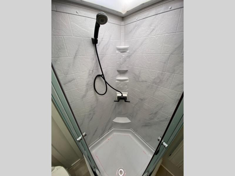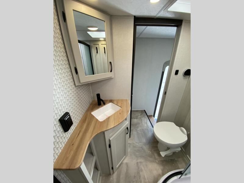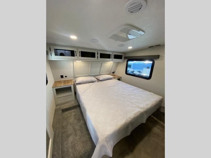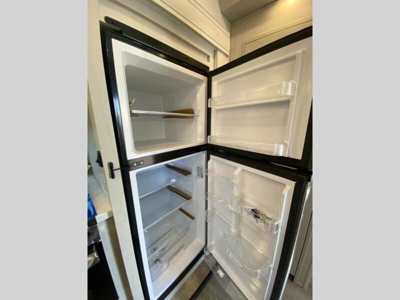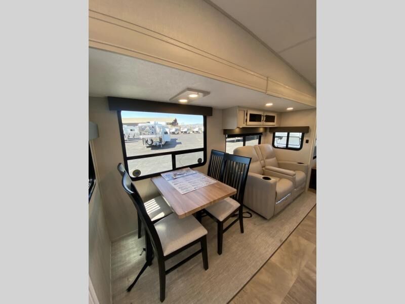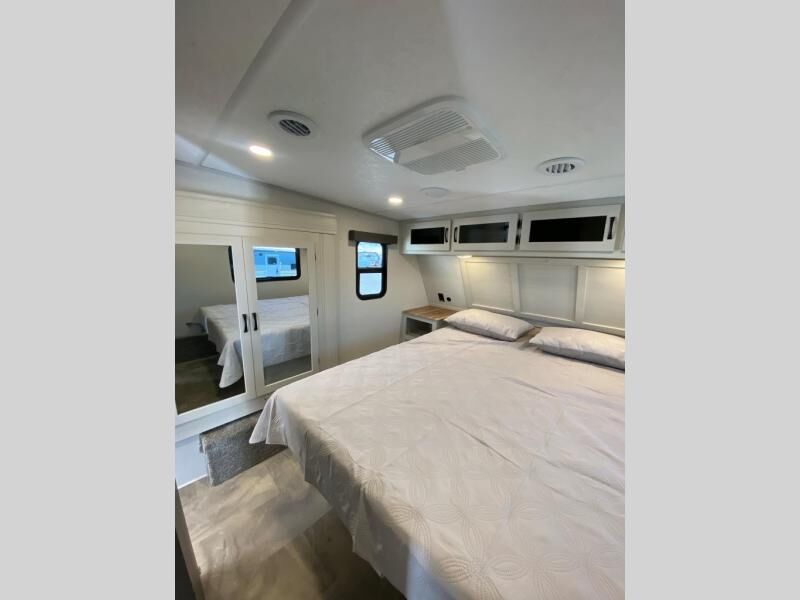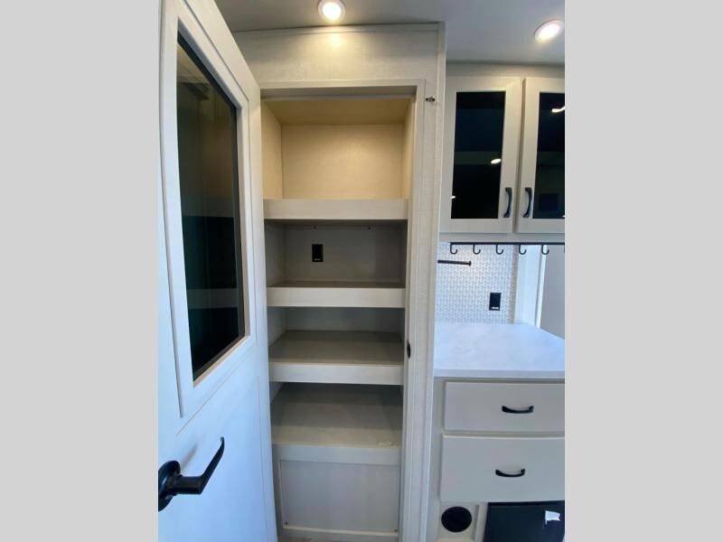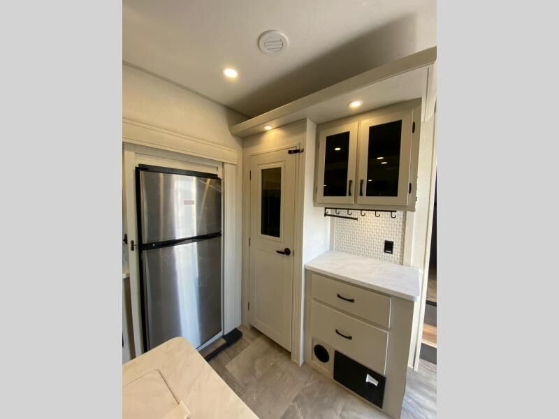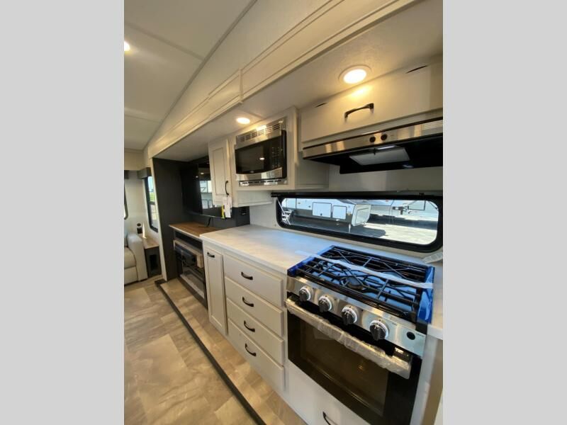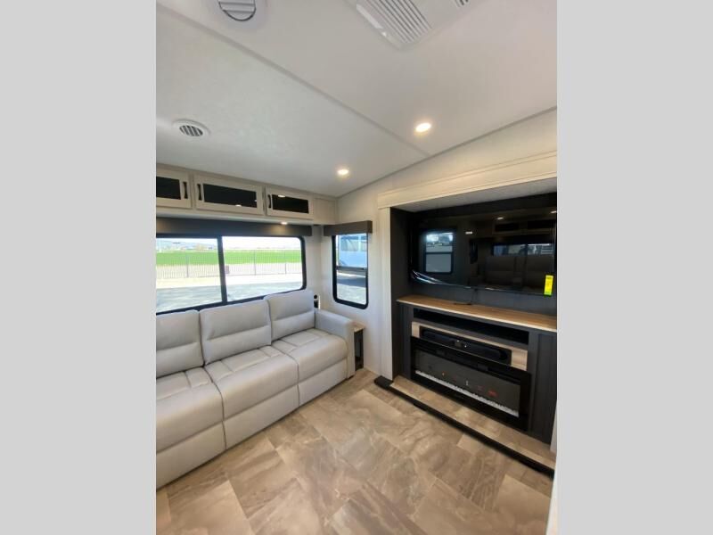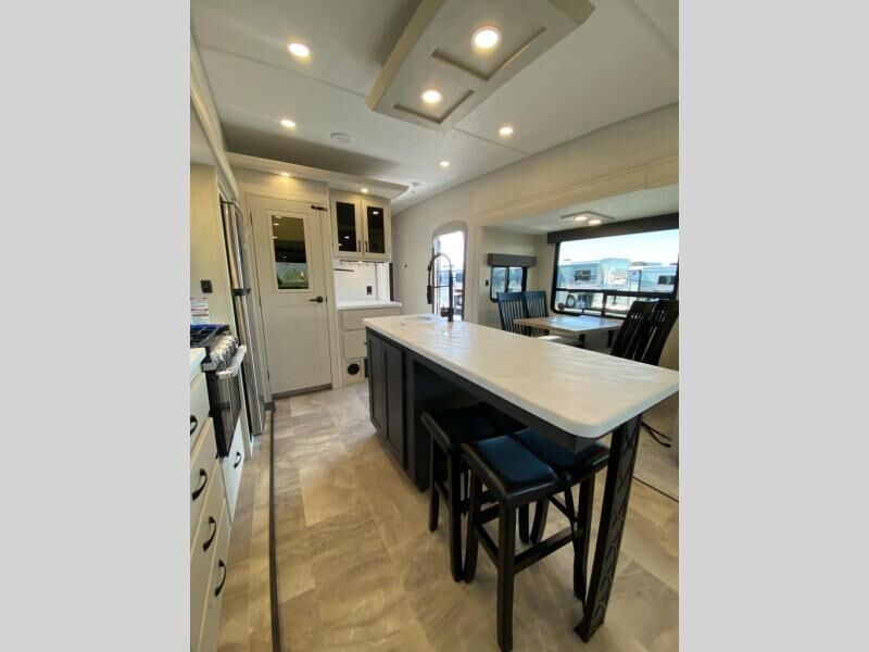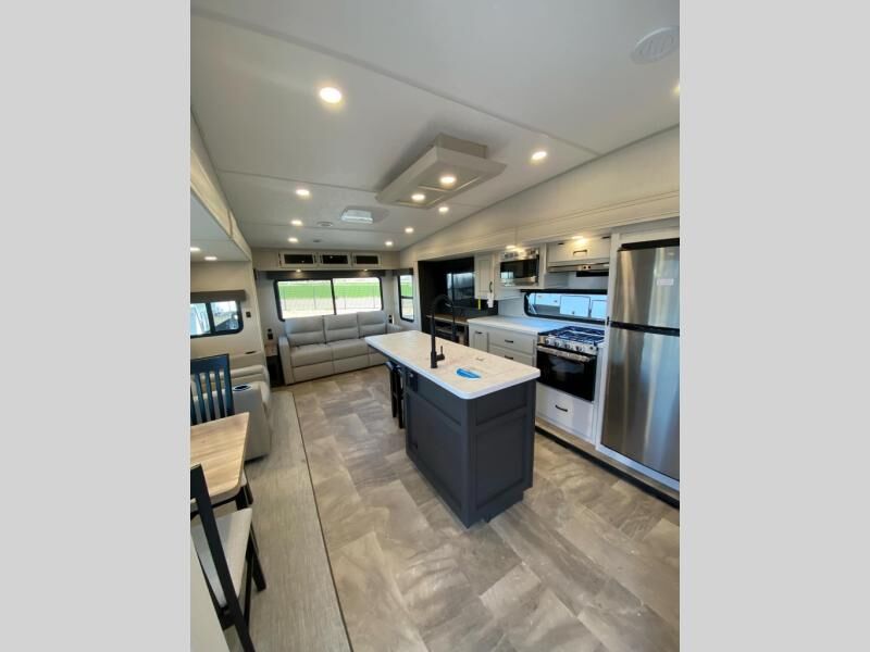 Get ready for a luxurious getaway in this fifth wheel! The rear living area is the perfect place to wind down your nights by relaxing on either the 78" tri-fold hide-a-bed sofa or the theater seating across from the entertainment center. You could even play a few card games at the free-spanning table while enjoying snacks that were stored in the pantry. The kitchen island comes with two bar stools so you can have two helpers get dinner ready while you're cooking on the three burner cooktop. The dual entry bathroom is easy for everyone to access and has a radius shower with glass doors to freshen up in, plus it leads directly into the front master suite where you will find a queen bed to lay your head on at night and a wardrobe/linen slide to keep your clothes looking their best!