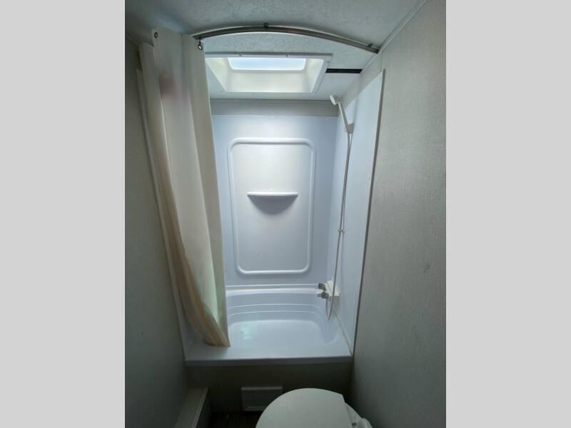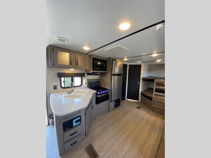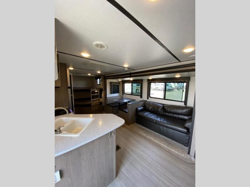 This Keystone Hideout travel trailer offers a spacious way to travel with a larger family. This unit features a set of double-size bunks for your kids or guests, and additional sleeping space can be found on the booth dinette, sofa, or queen-size bed in the private bedroom. The single slide along the roadside is what opens up the interior, and the full bathroom has all of the amenities that you would find at home so that you can easily get ready for the day.